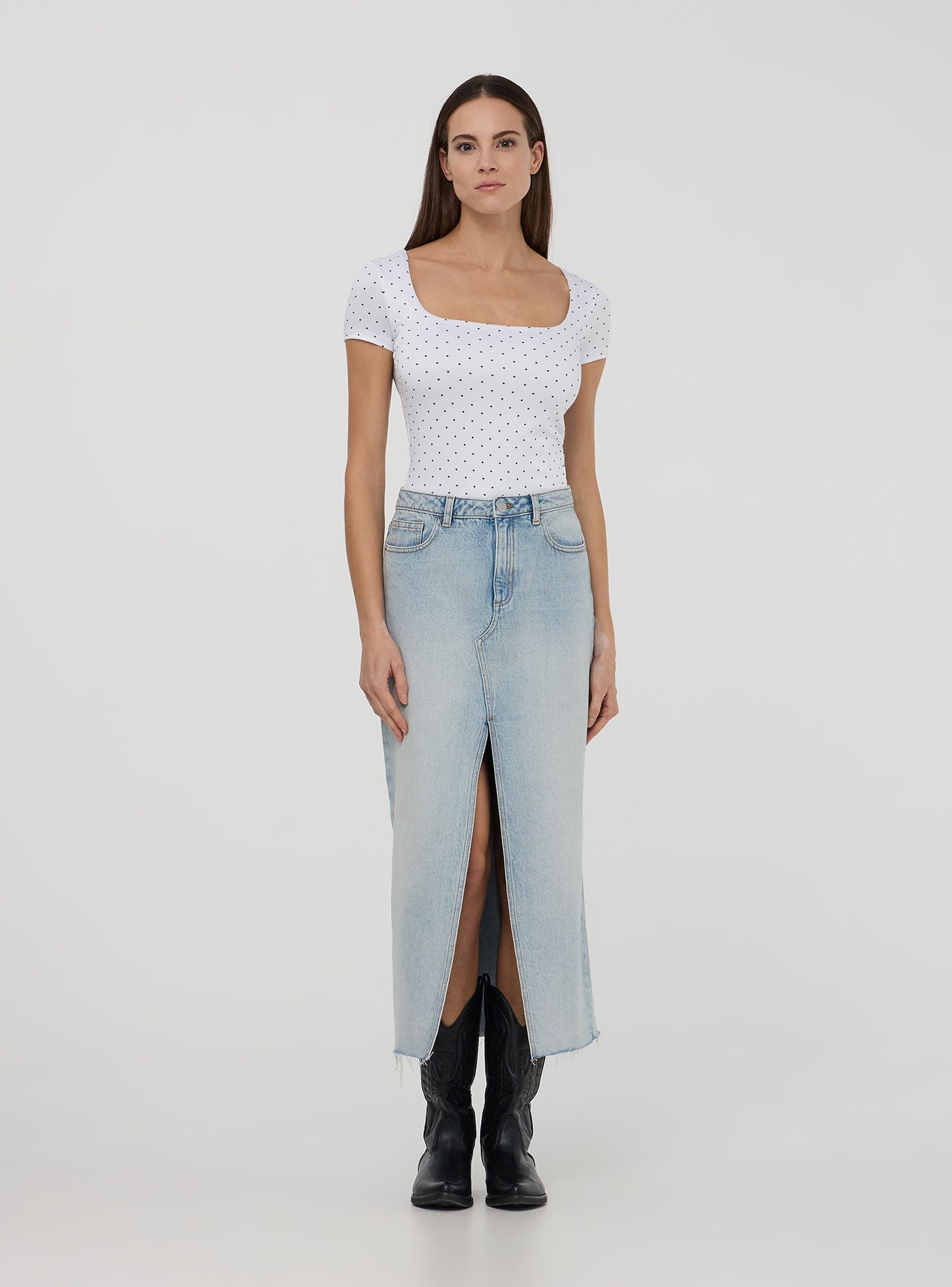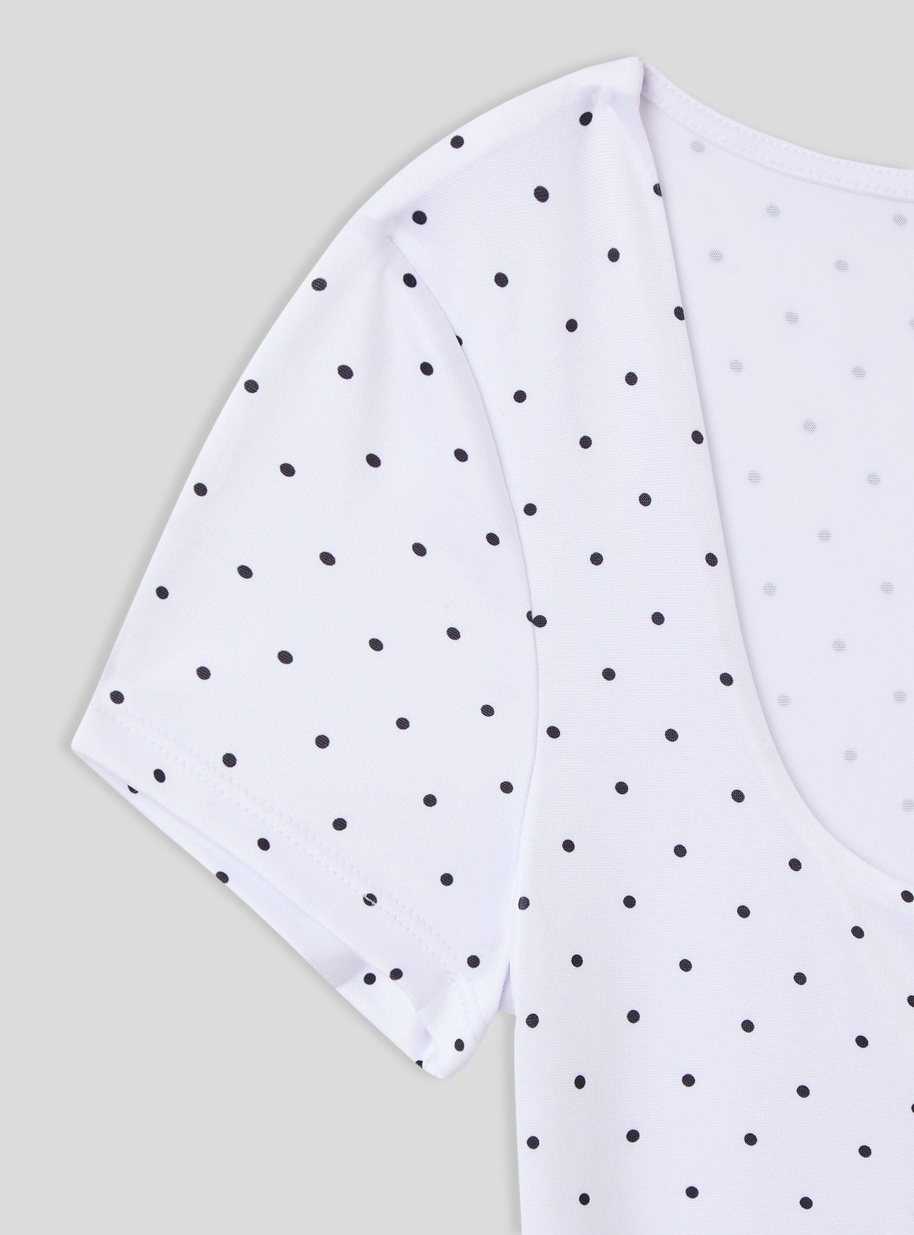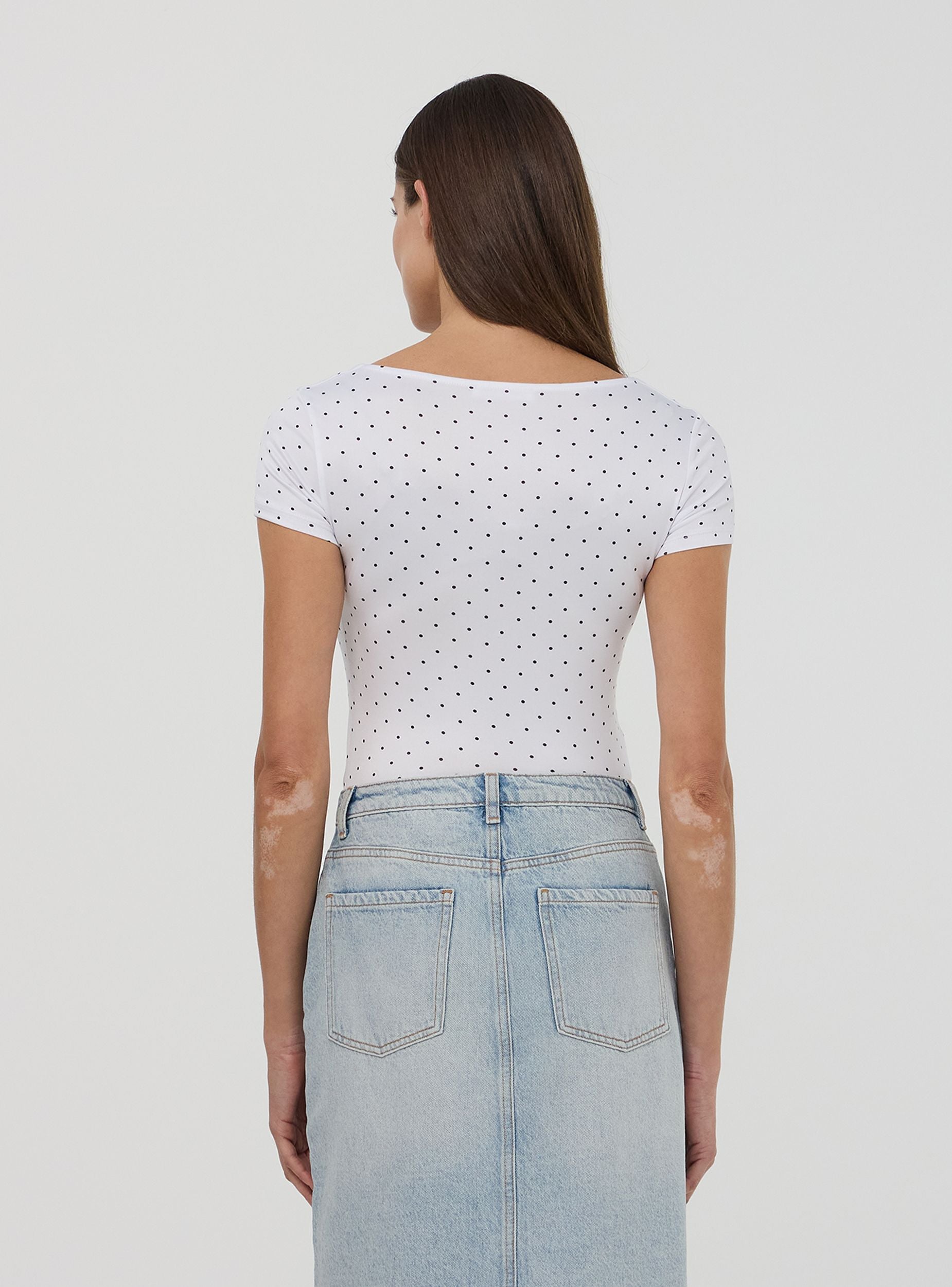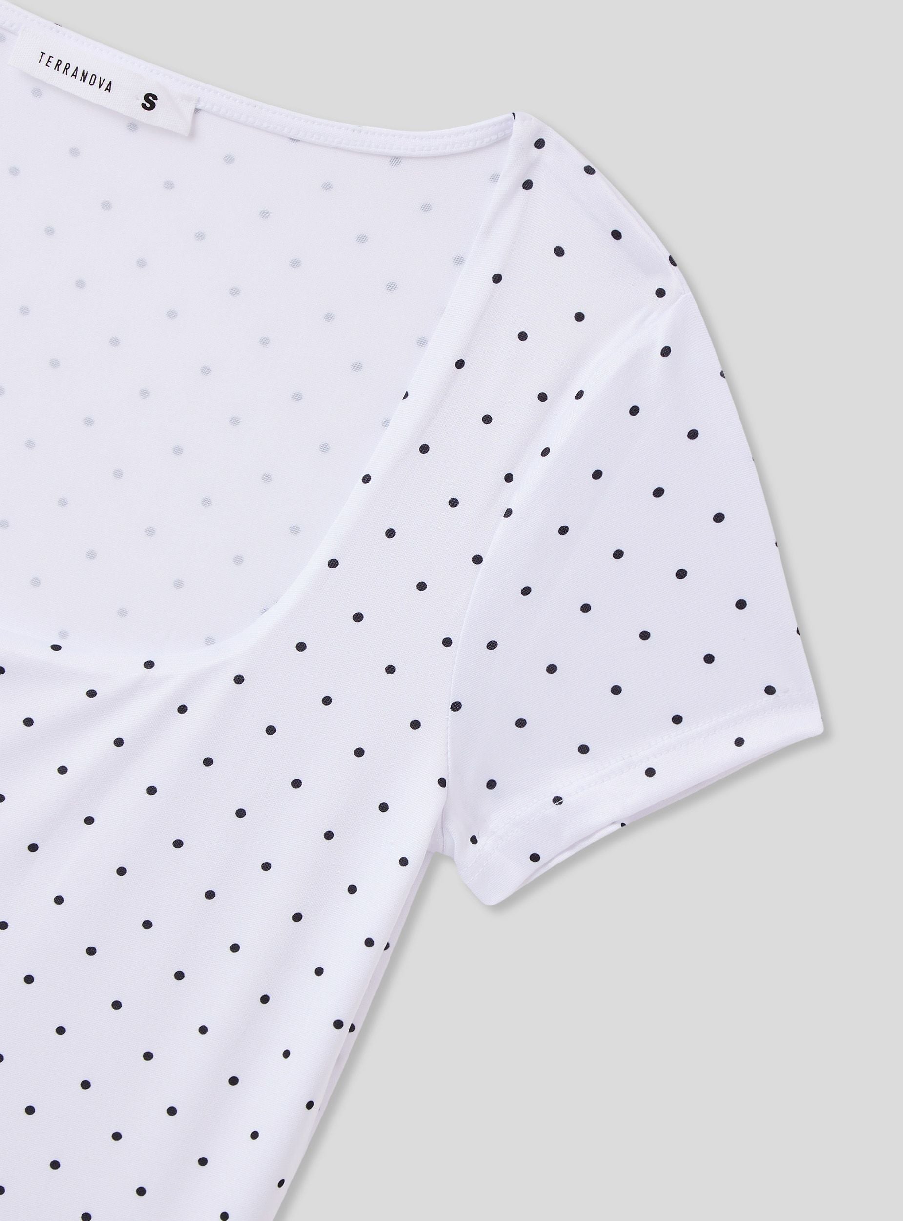Maglietta da donna a maniche corte con un elegante scollo ampio squadrato. La fantasia a pois distribuita su tutta la superficie conferisce un aspetto vivace e senza tempo. Il capo è realizzato in tessuto elasticizzato, che offre una vestibilità aderente e confortevole, mantenendo una piacevole sensazione di leggerezza. Ideale per un look casual ma raffinato, la maglietta può essere abbinata a vari outfit, perfetta per aggiungere un tocco di stile retrò e chic.Dettagli