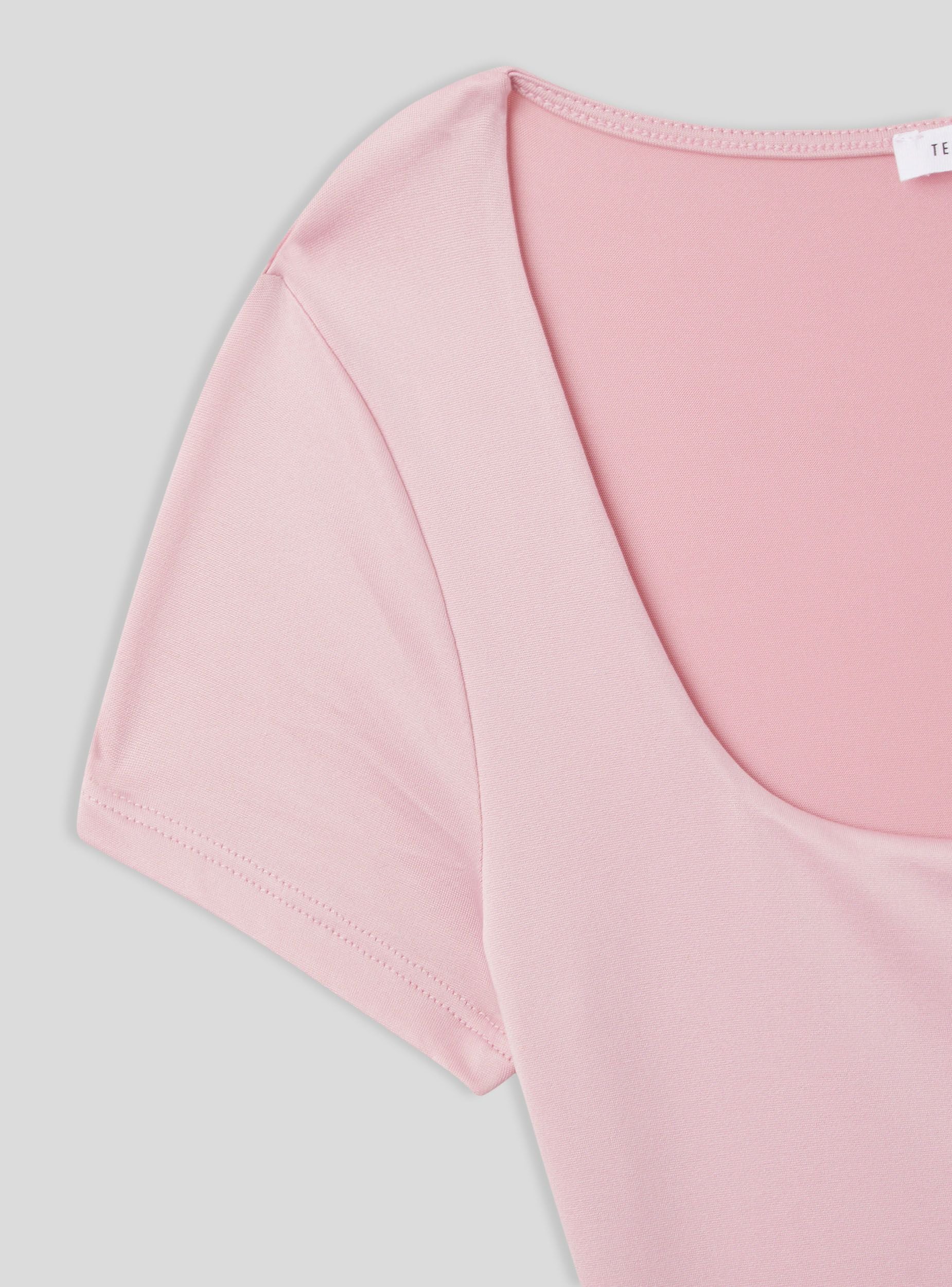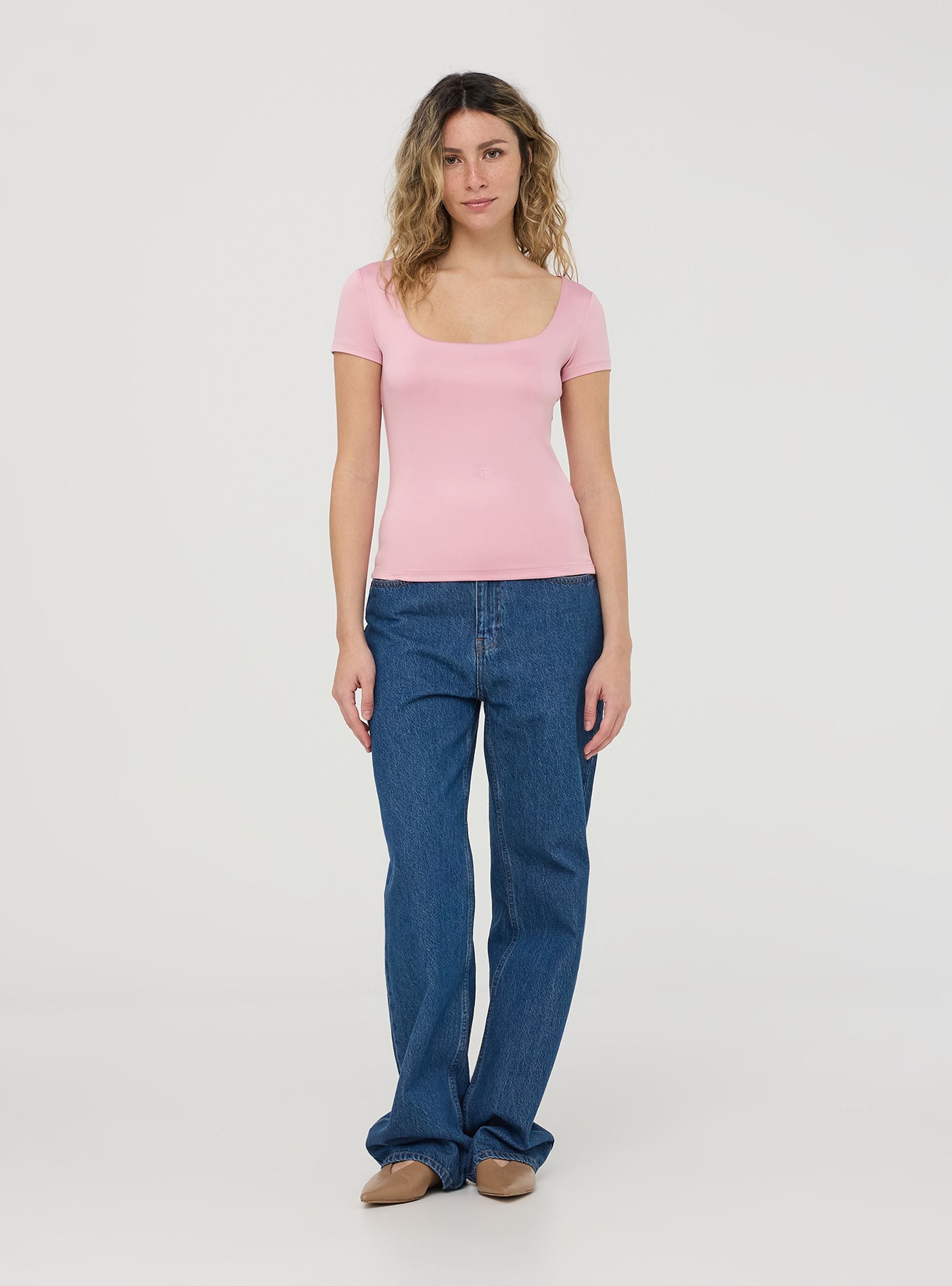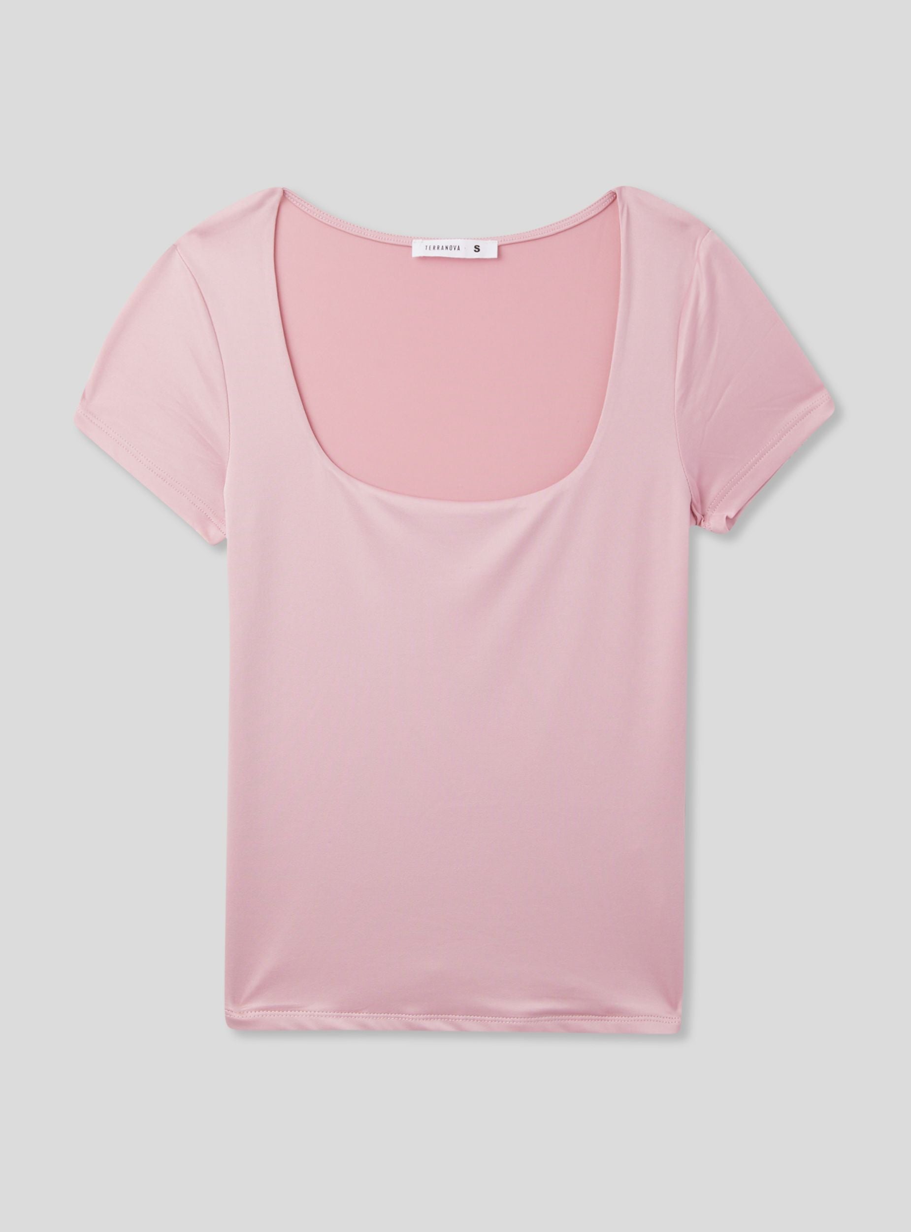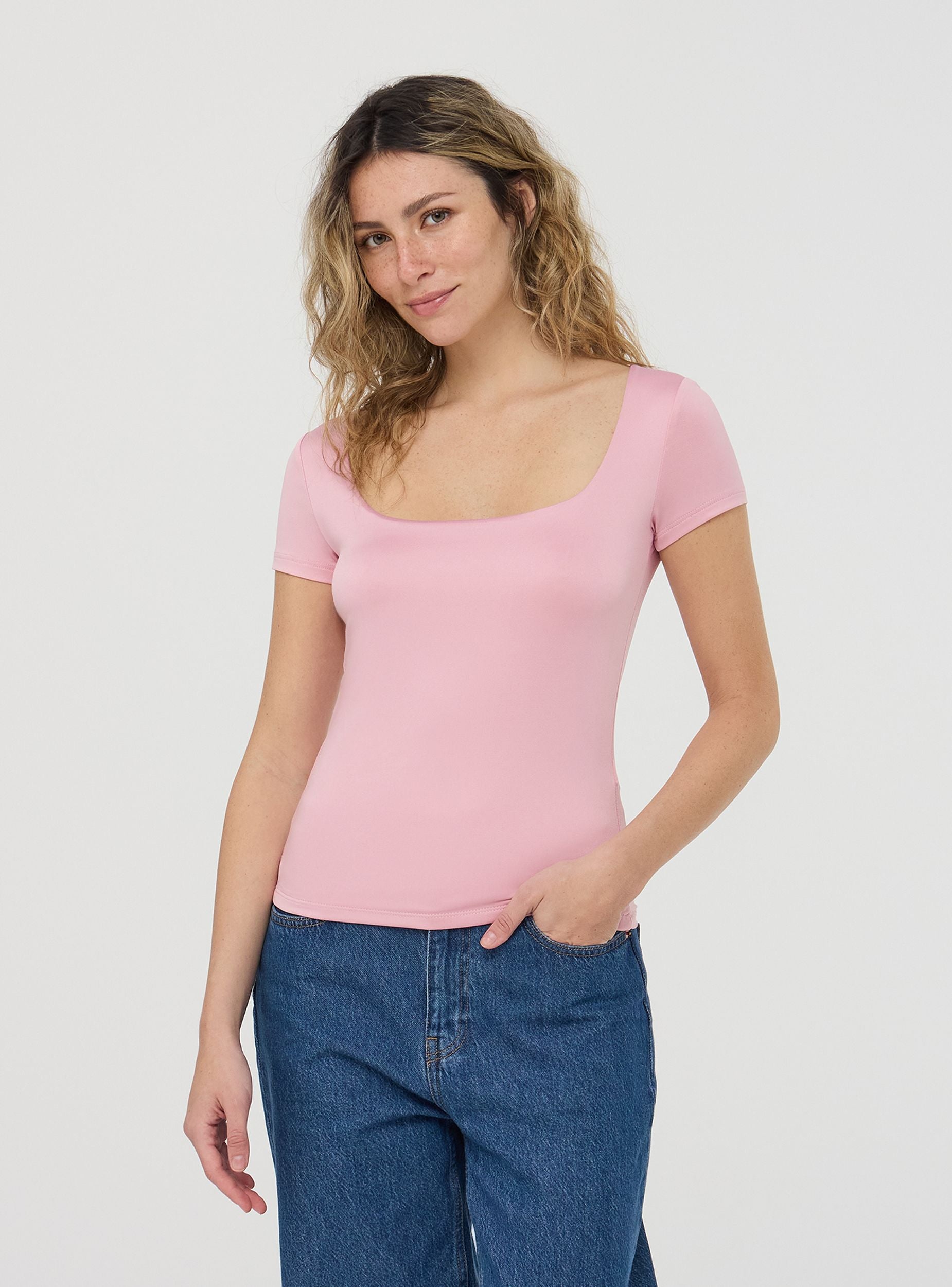 Maglietta da donna a maniche corte con un design minimalista e a tinta unita. Presenta uno scollo ampio e squadrato, conferendo un tocco femminile ed elegante al capo. Il tessuto elasticizzato garantisce comfort e aderenza. Un capo versatile, ideale per look casual e raffinati.Dettagli