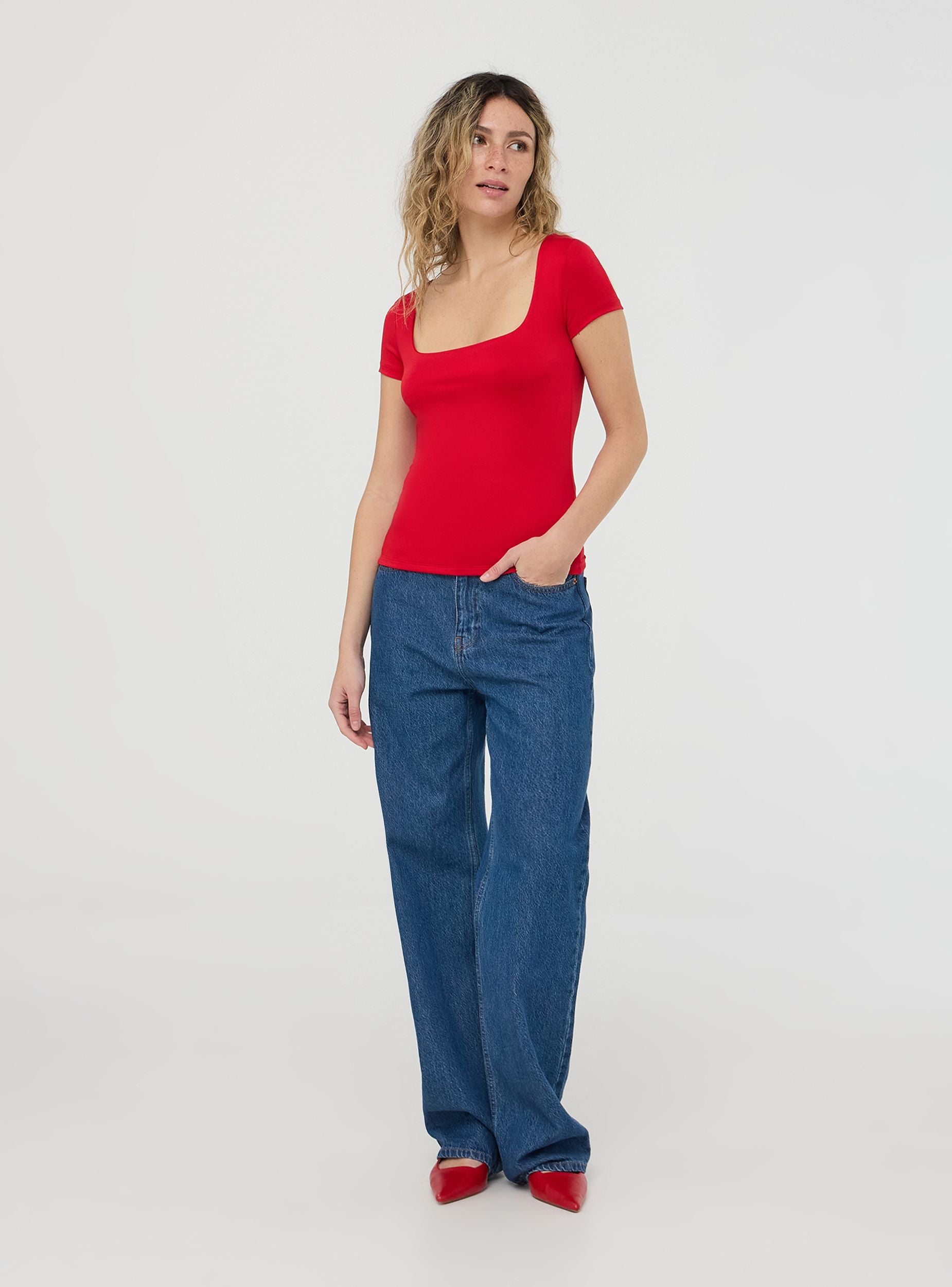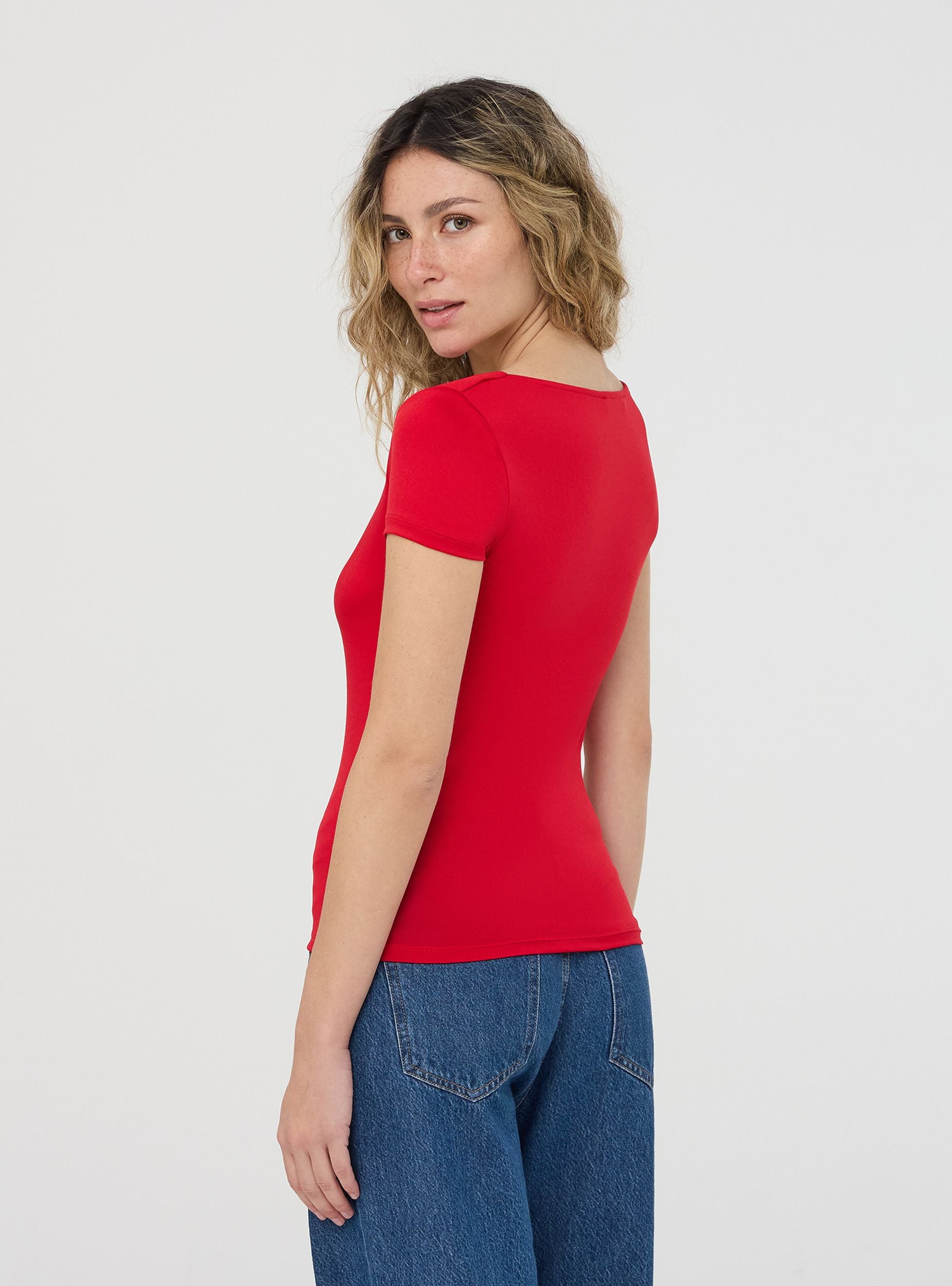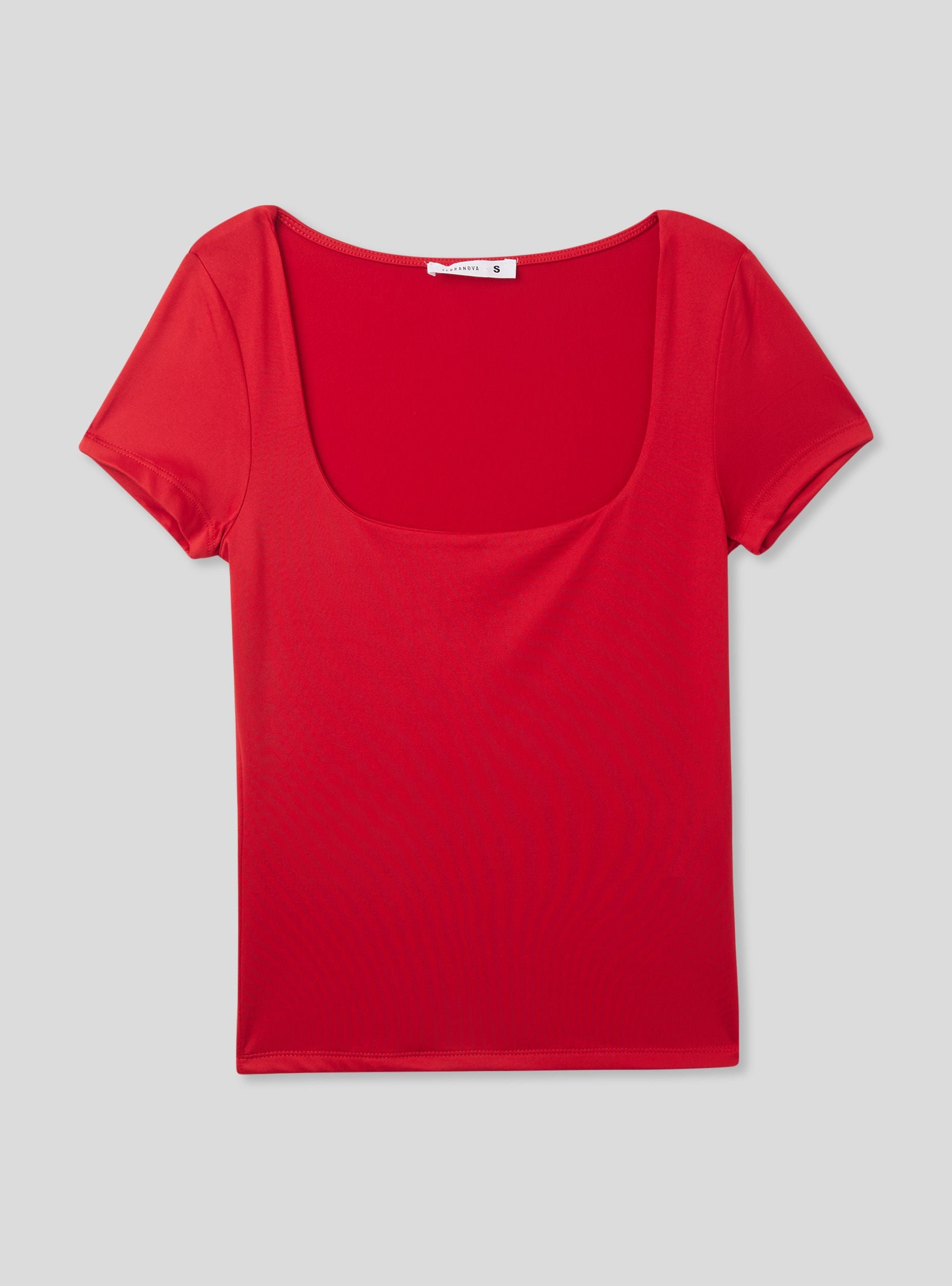 Maglietta da donna a maniche corte con un design minimalista e a tinta unita. Presenta uno scollo ampio e squadrato, conferendo un tocco femminile ed elegante al capo. Il tessuto elasticizzato garantisce comfort e aderenza. Un capo versatile, ideale per look casual e raffinati.Dettagli