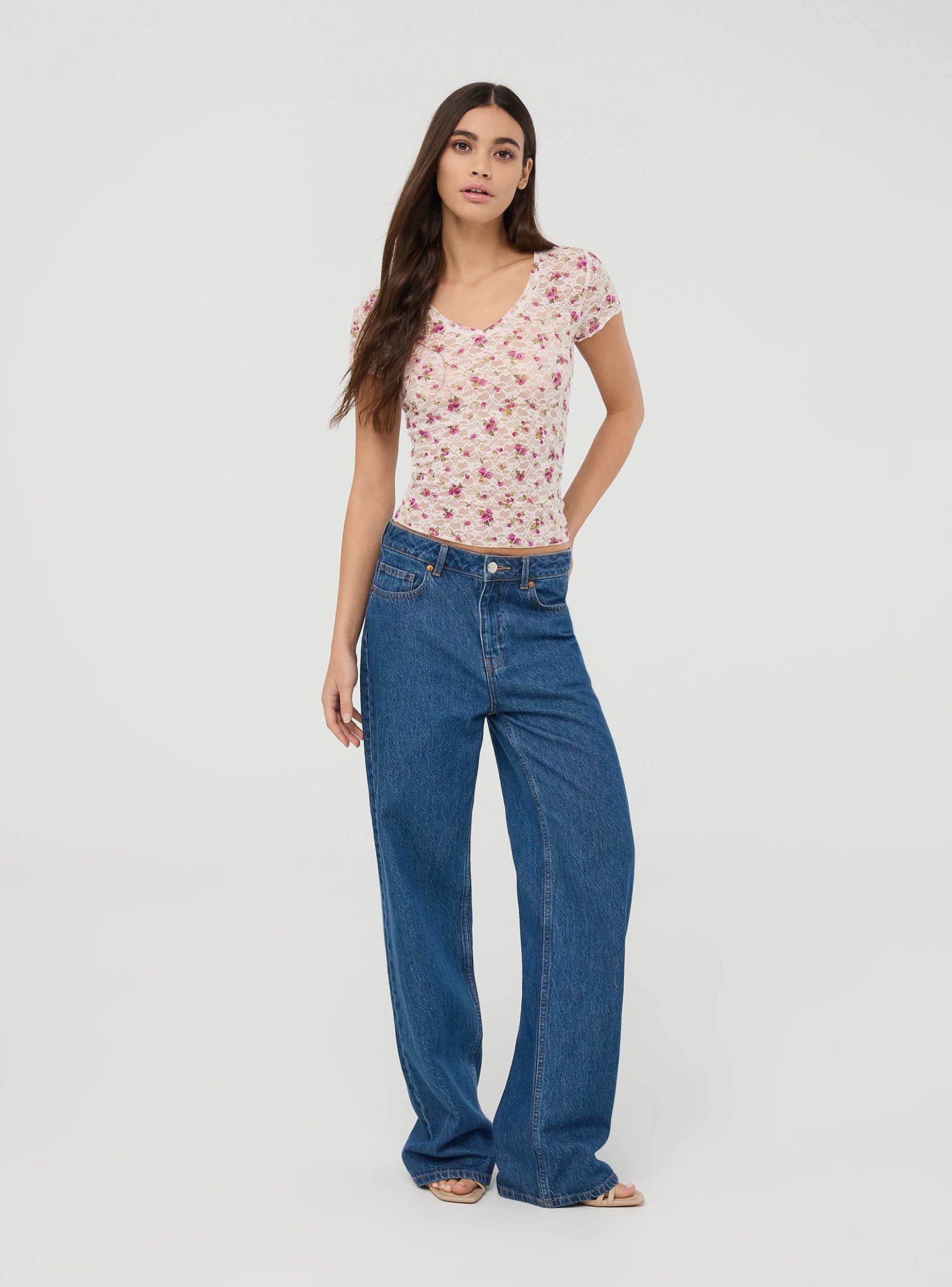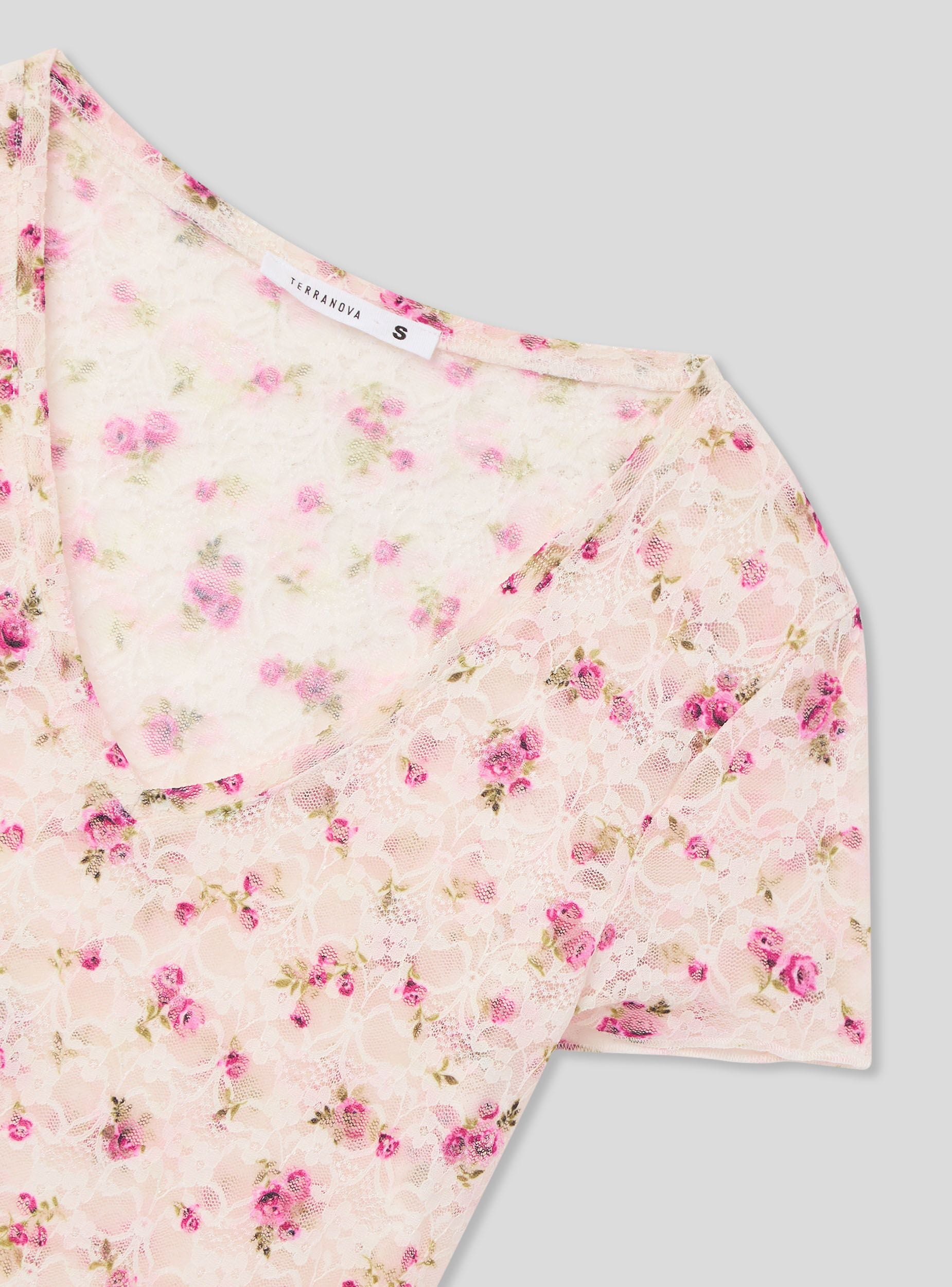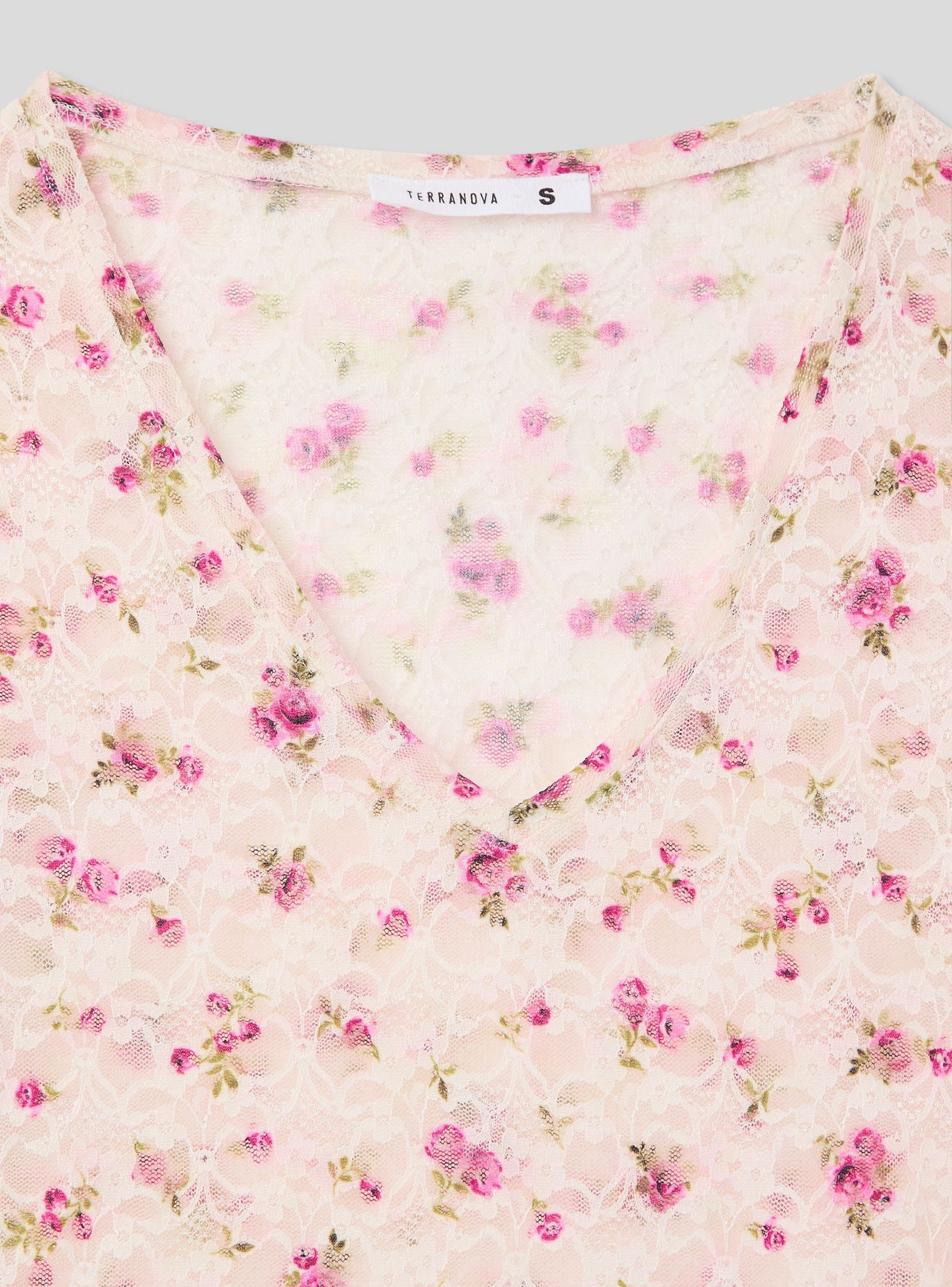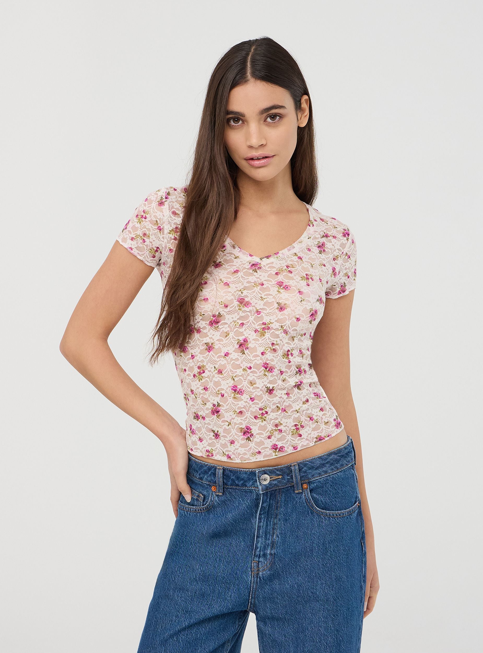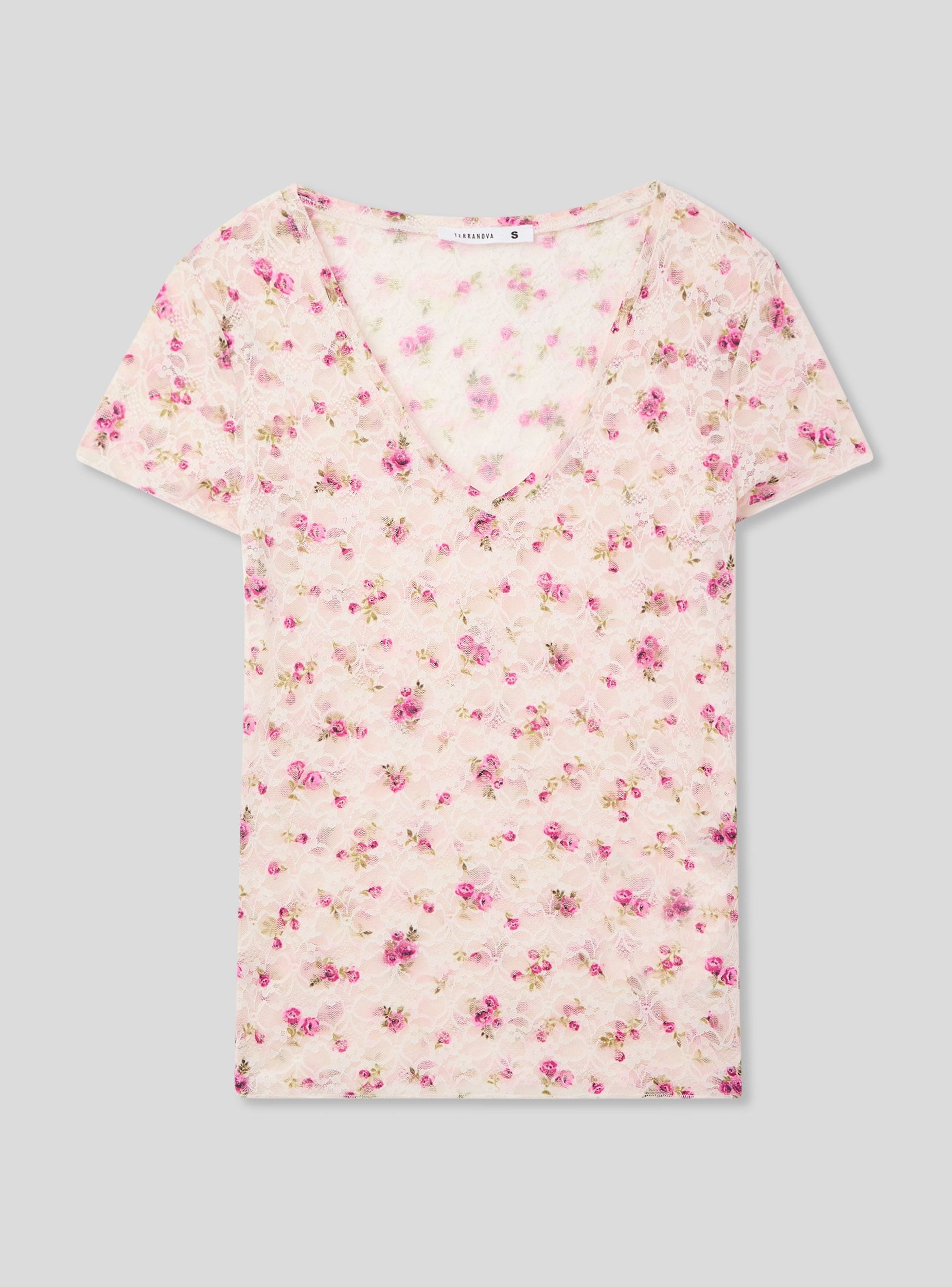 Maglietta da donna in pizzo con fantasia floreale, caratterizzata da uno scollo a V e maniche corte. Il tessuto elasticizzato offre una vestibilità comoda e avvolgente, mentre il design floreale all-over aggiunge un tocco romantico e femminile. Perfetta per look delicati e freschi, questa maglietta si presta a essere indossata da sola o abbinata a strati leggeri per un outfit casual e ricercato.Dettagli
