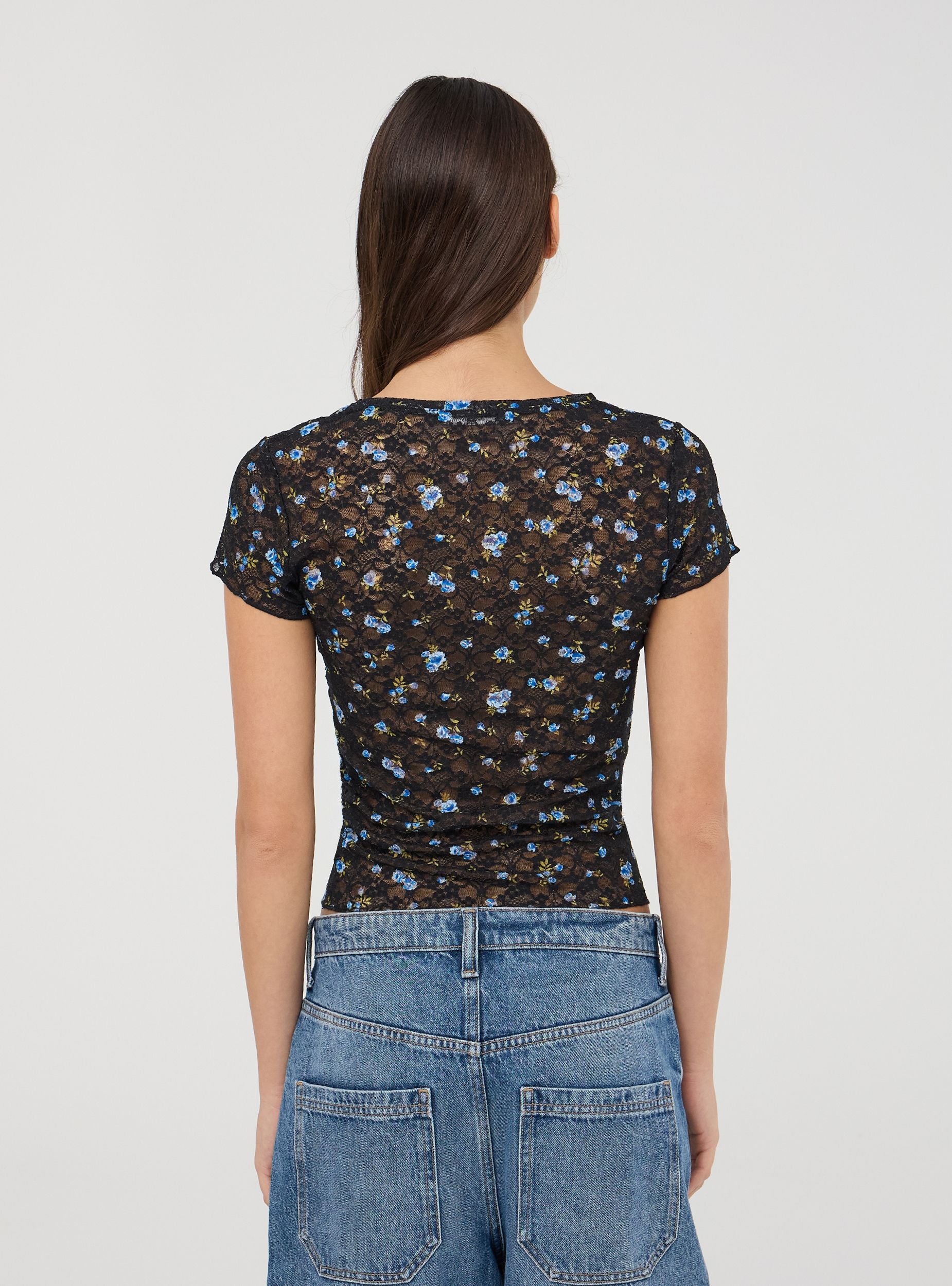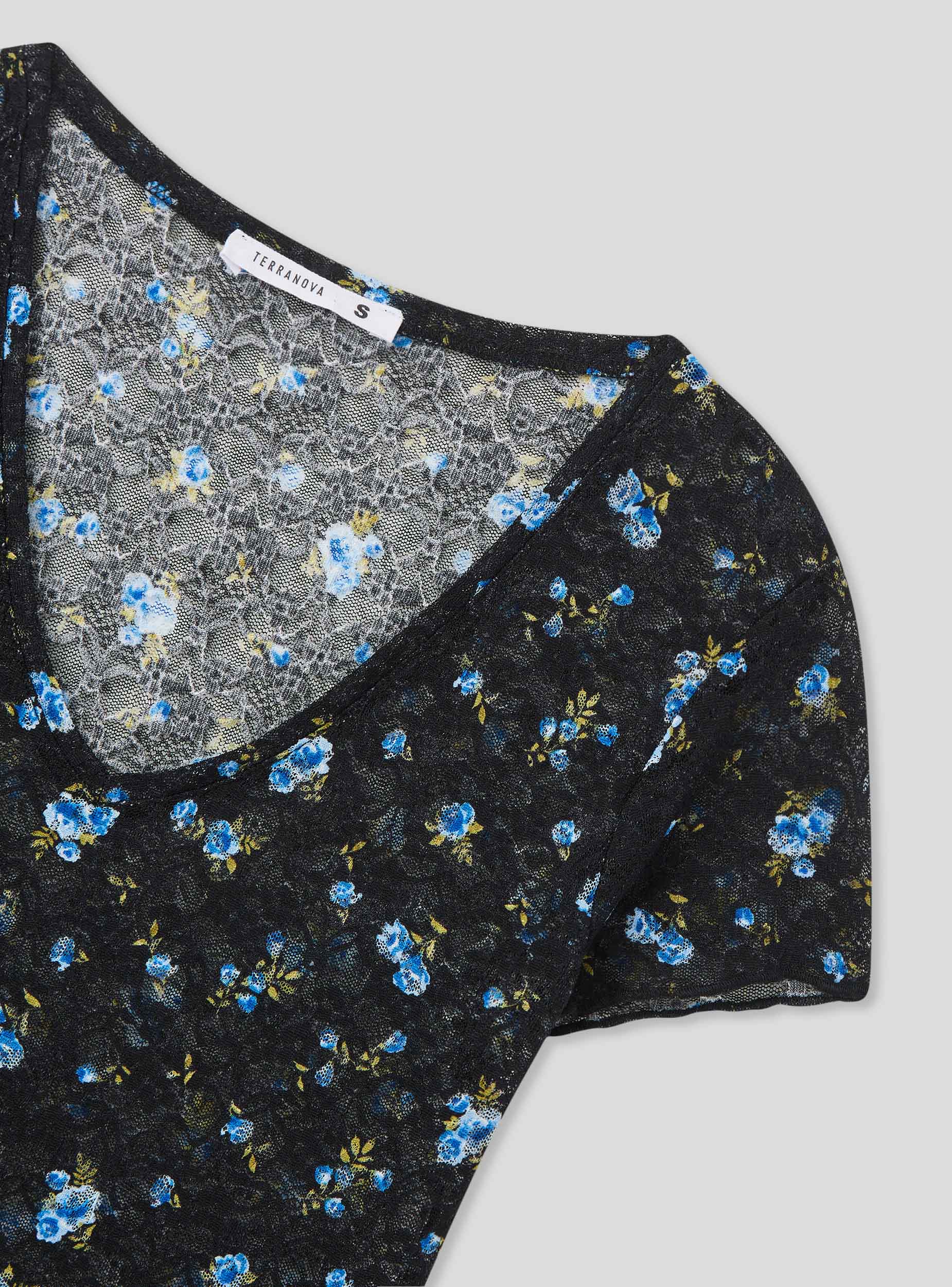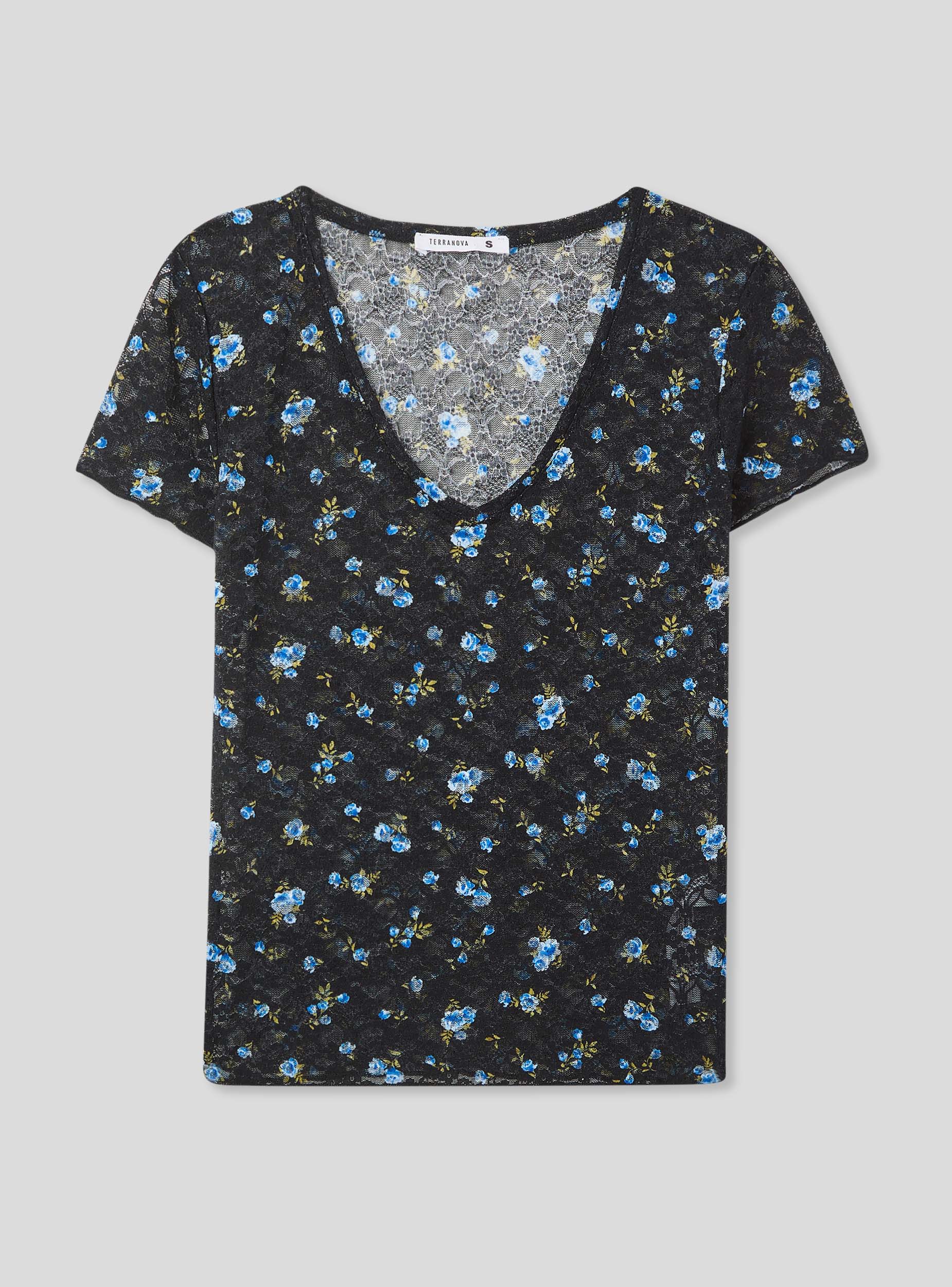 Maglietta da donna in pizzo con fantasia floreale, caratterizzata da uno scollo a V e maniche corte. Il tessuto elasticizzato offre una vestibilità comoda e avvolgente, mentre il design floreale all-over aggiunge un tocco romantico e femminile. Perfetta per look delicati e freschi, questa maglietta si presta a essere indossata da sola o abbinata a strati leggeri per un outfit casual e ricercato.Dettagli