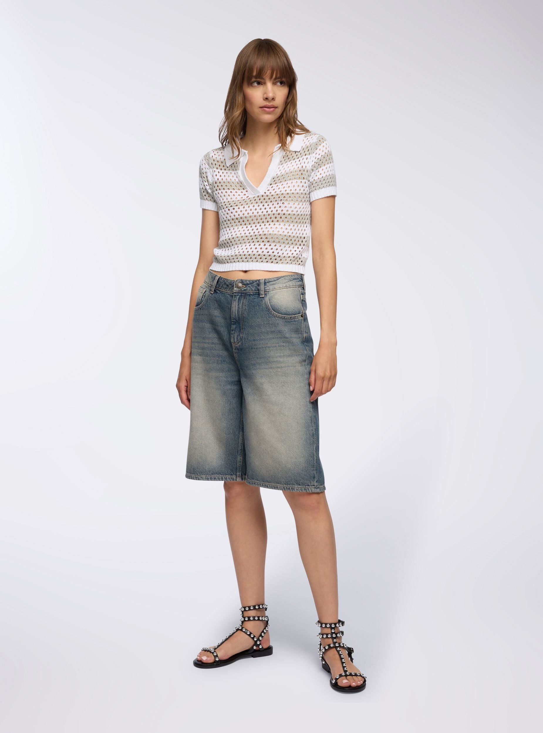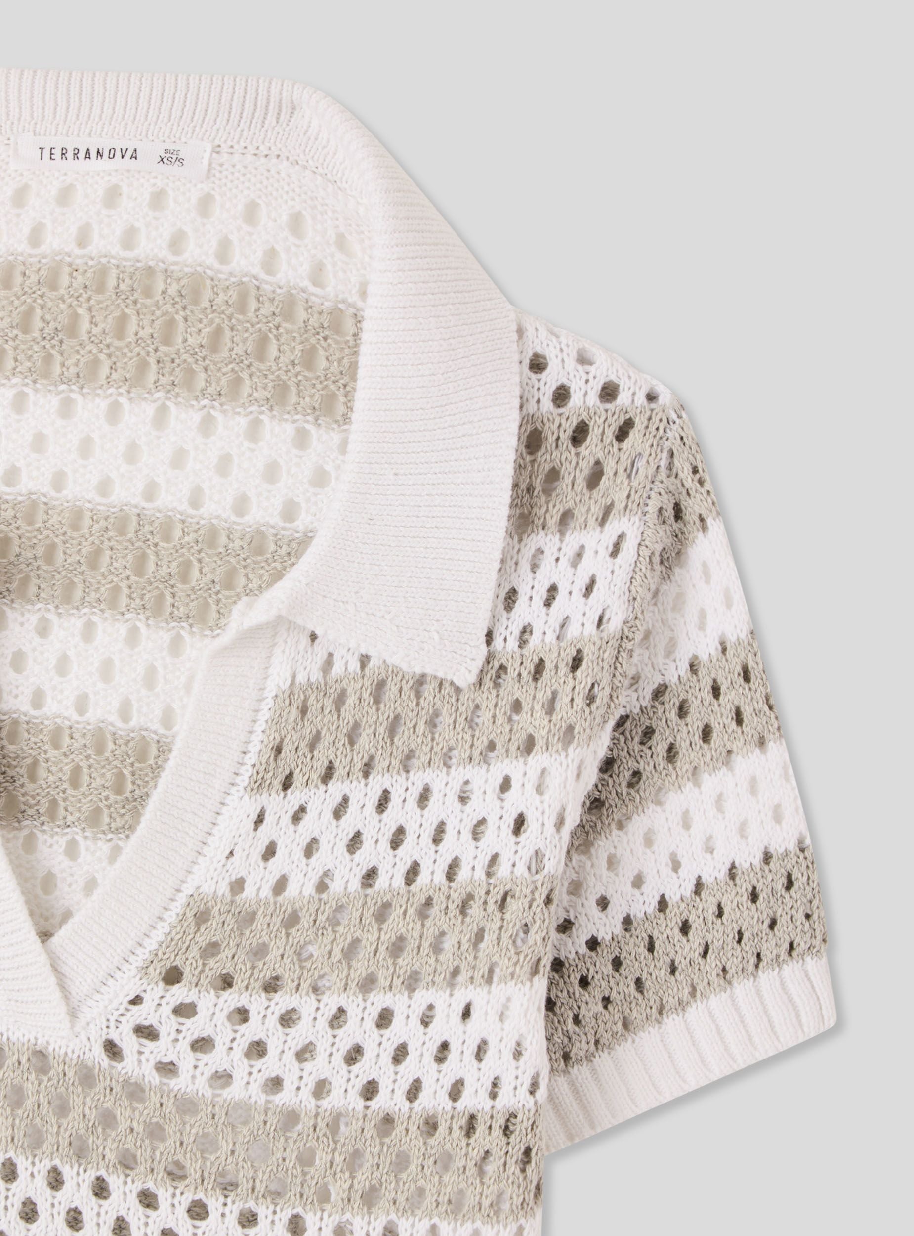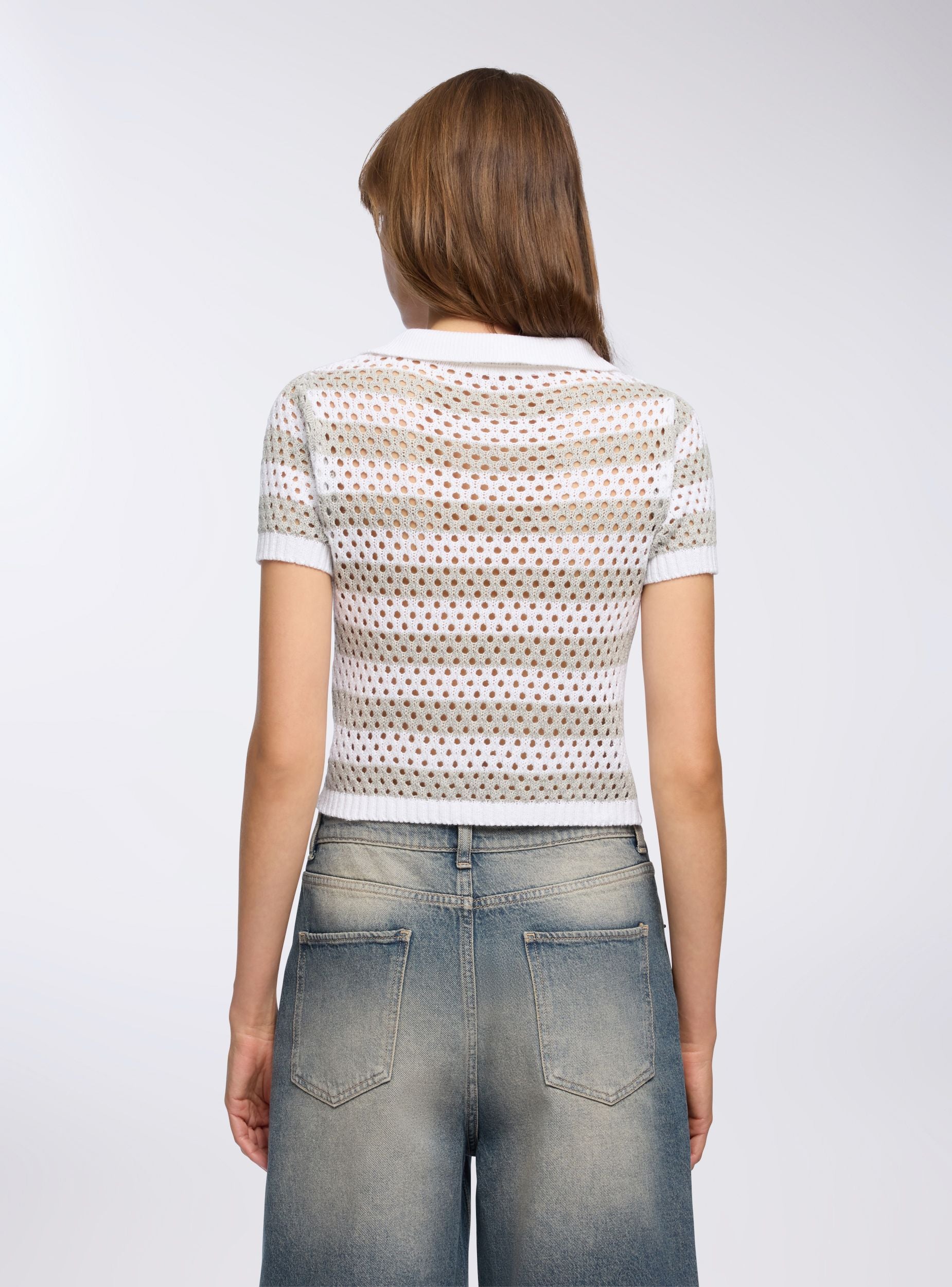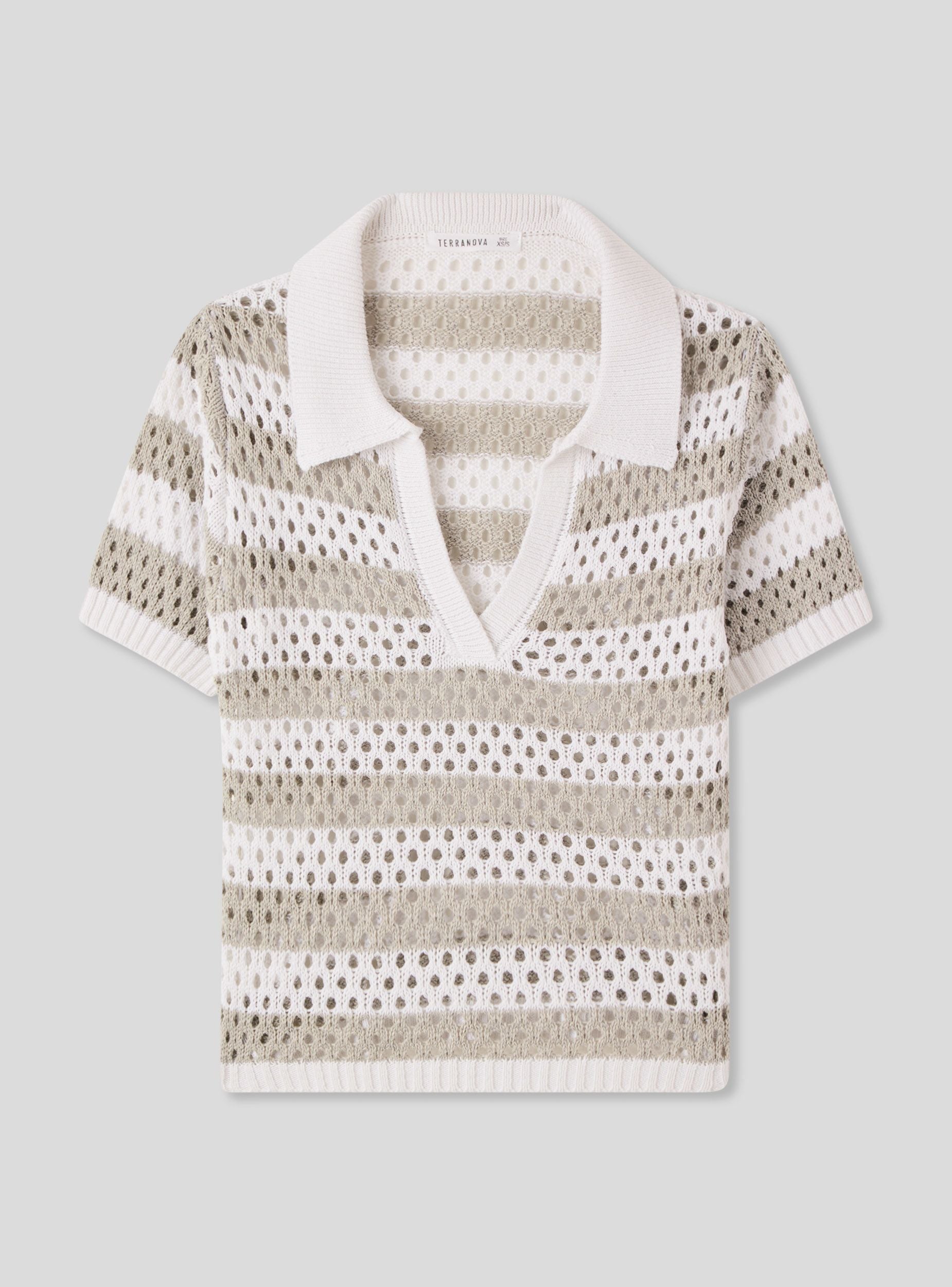 Maglietta da donna in rete con motivo a righe, caratterizzata da colletto a polo e scollo a V. Le maniche corte e la lavorazione traforata la rendono ideale per look estivi freschi e dinamici. Perfetta da abbinare a jeans o gonne per un outfit casual e versatile, si distingue per il design leggero e la vestibilità confortevole, adatta a diverse occasioni.Dettagli
