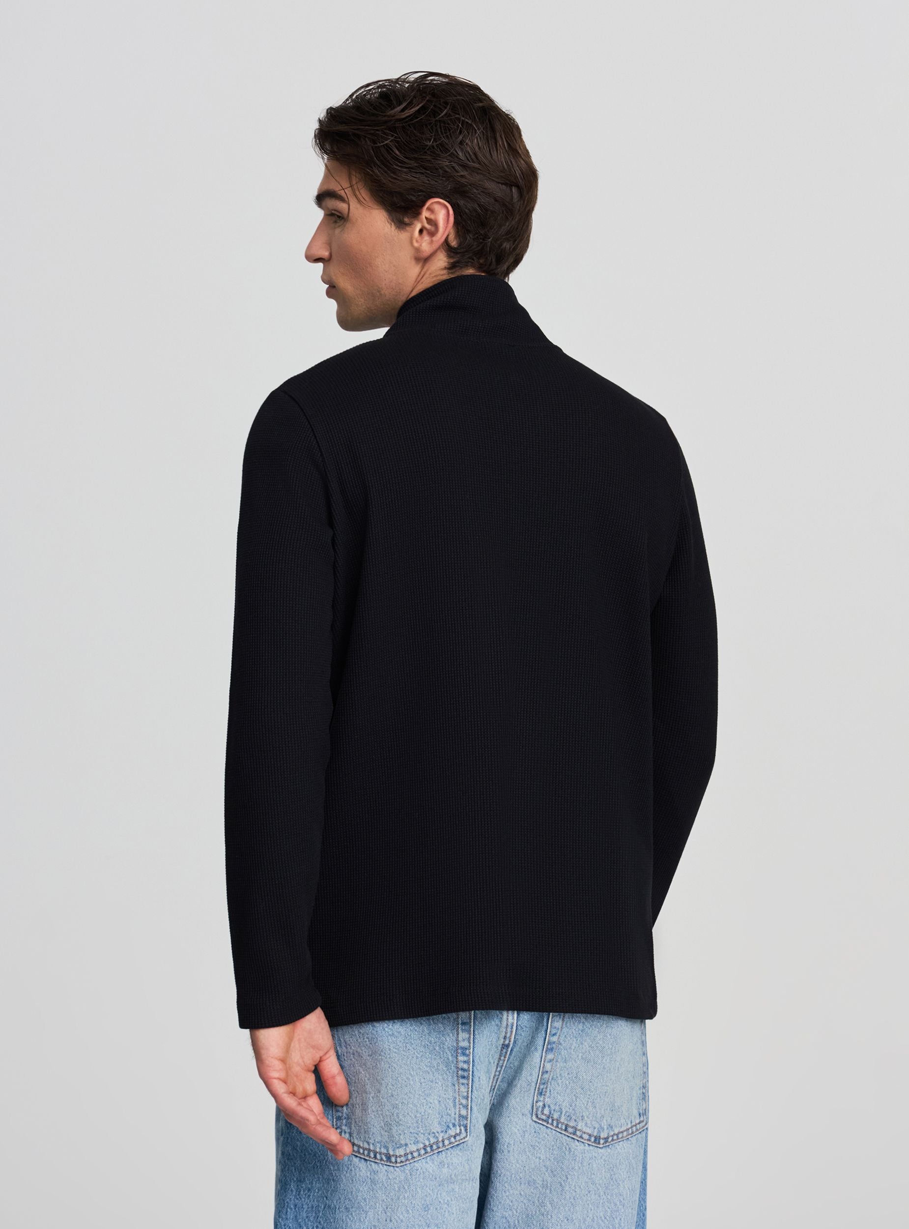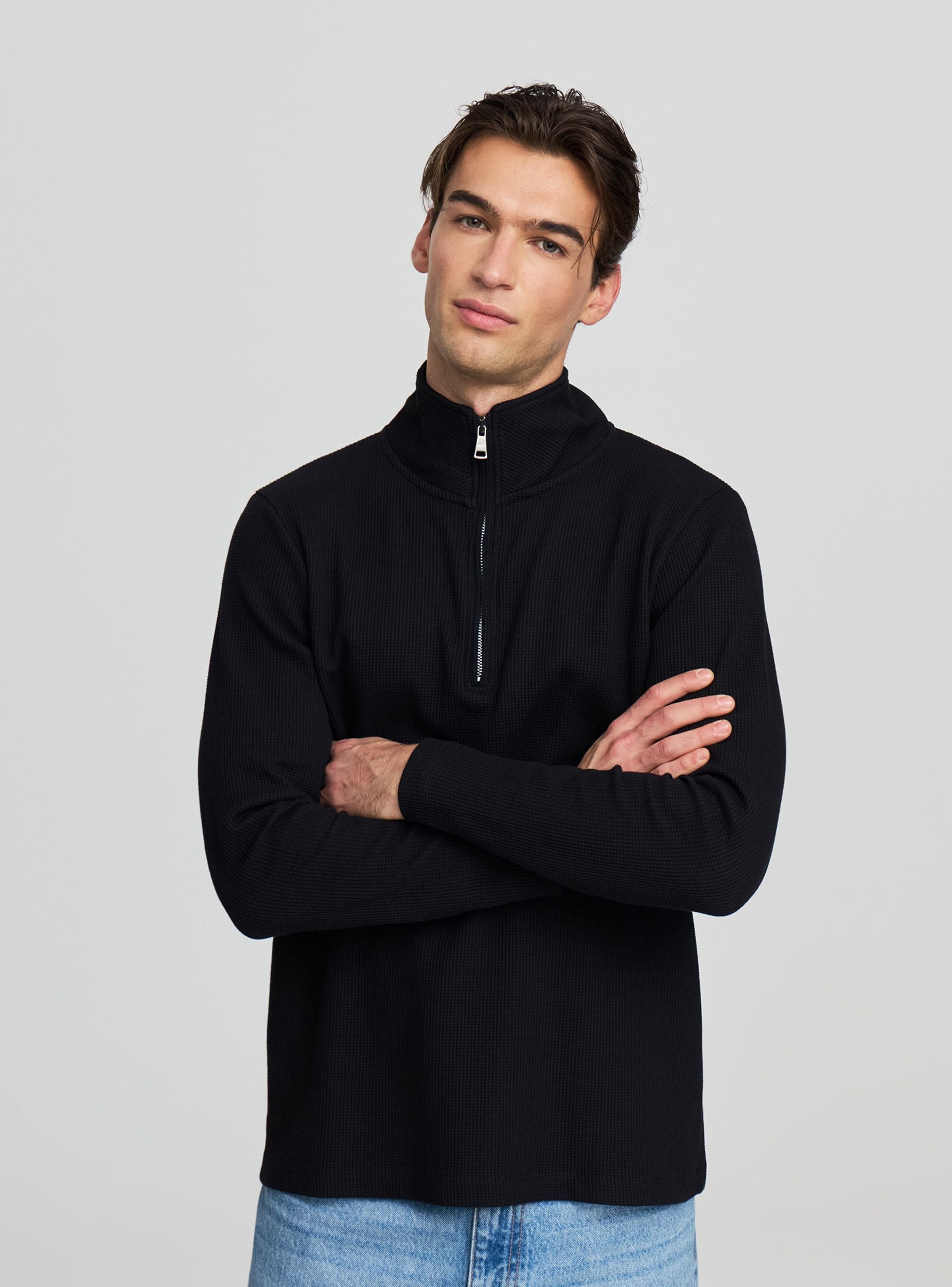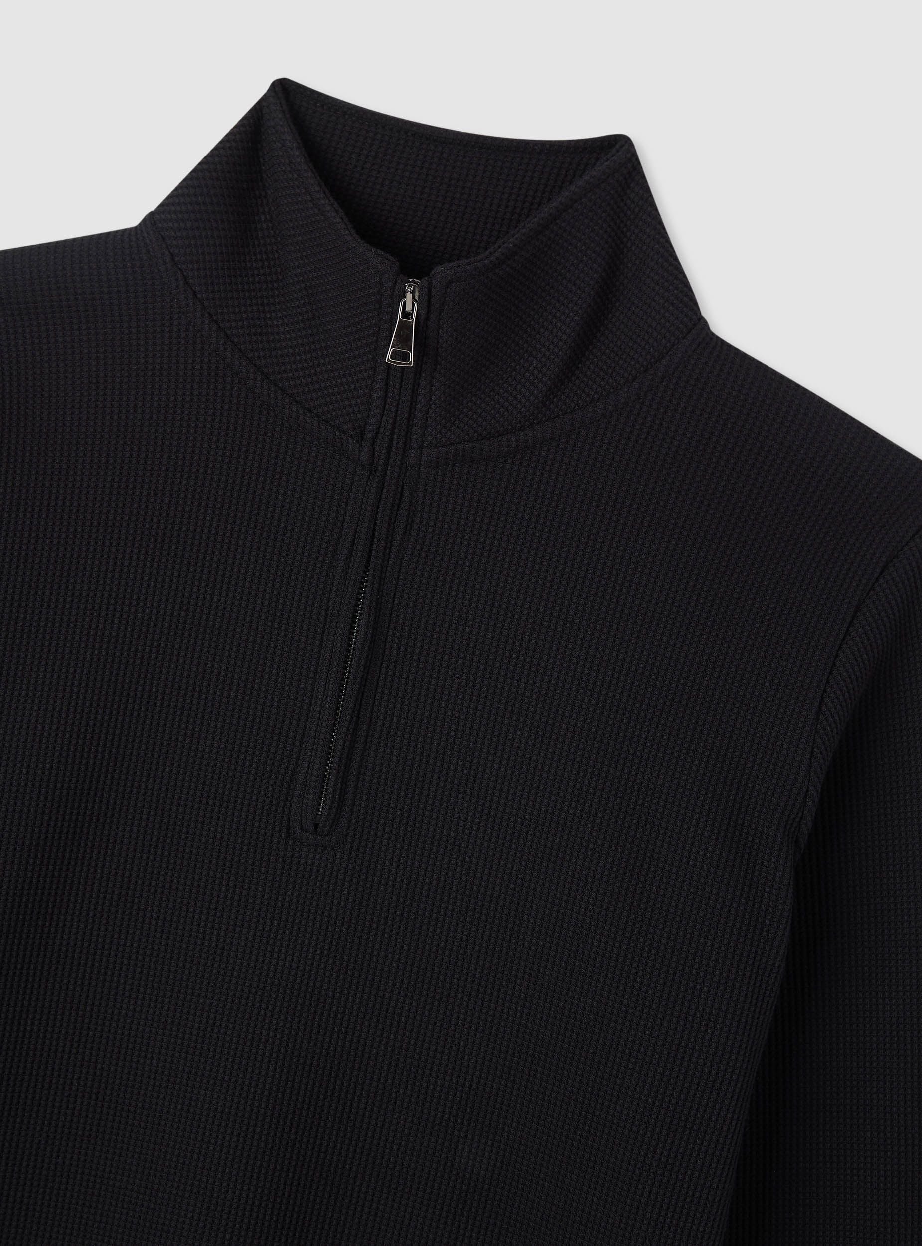 Maglietta da uomo con collo alto e mezza zip frontale, in tinta unita. Il tessuto a micro trama dona struttura e comfort, mentre la vestibilità regular e le maniche lunghe la rendono pratica sotto giacche o felpe. Ideale per look casual o urban, si abbina a jeans o pantaloni chino. Zip corta come chiusura e finiture pulite per un design essenziale e versatile.Dettagli