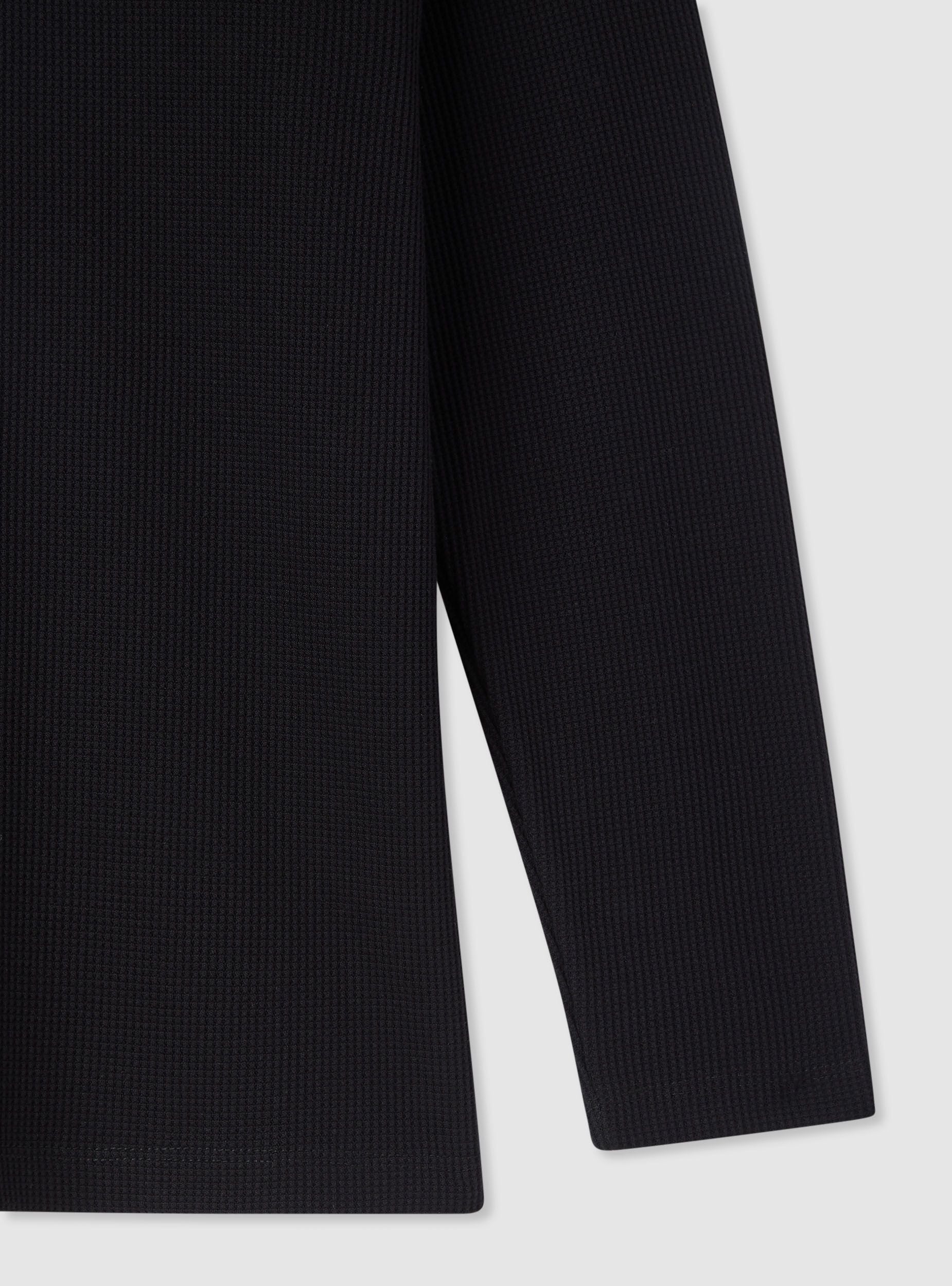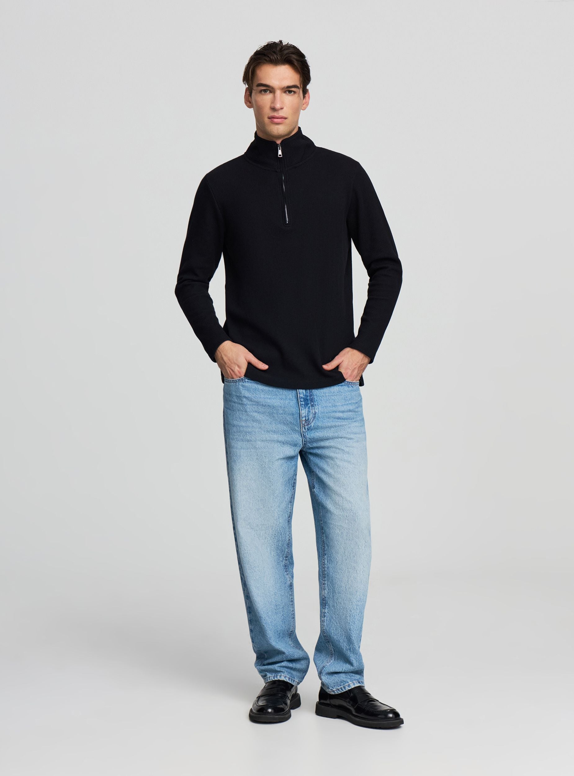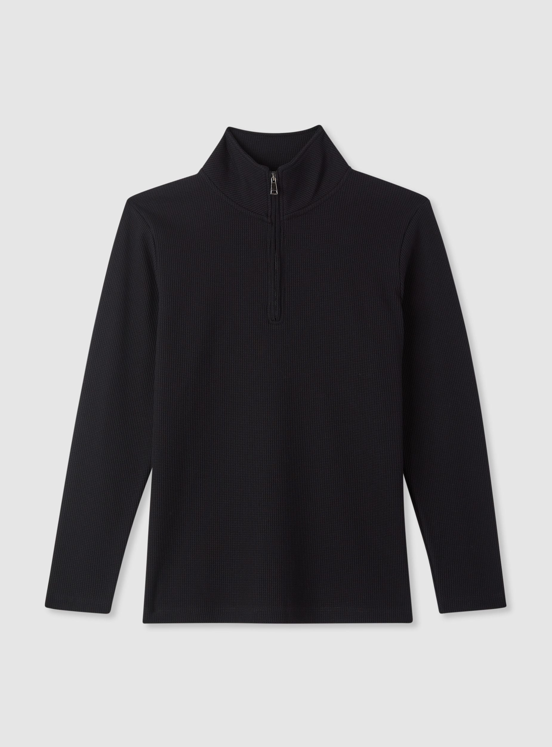 Maglietta da uomo con collo alto e mezza zip frontale, in tinta unita. Il tessuto a micro trama dona struttura e comfort, mentre la vestibilità regular e le maniche lunghe la rendono pratica sotto giacche o felpe. Ideale per look casual o urban, si abbina a jeans o pantaloni chino. Zip corta come chiusura e finiture pulite per un design essenziale e versatile.Dettagli