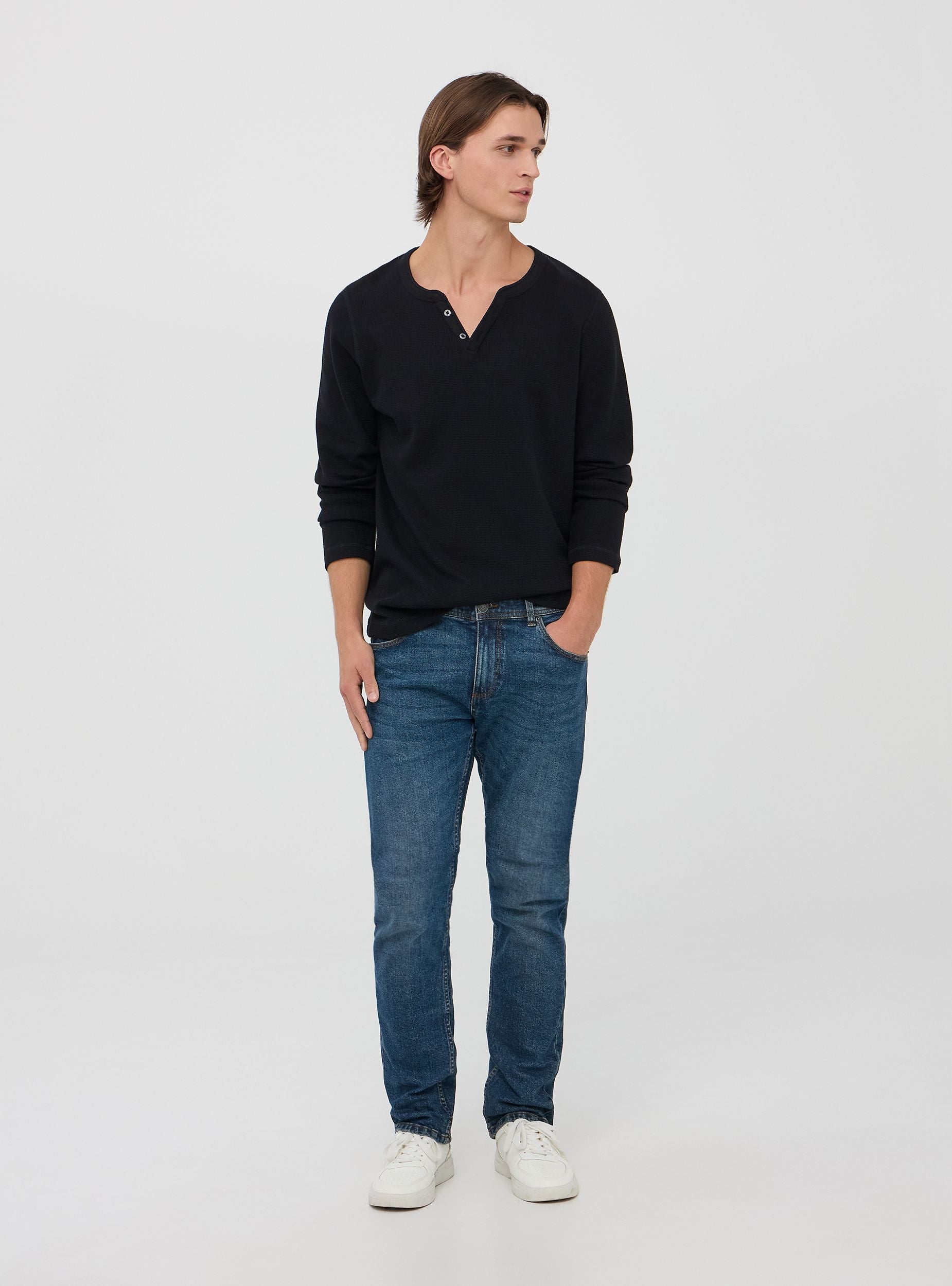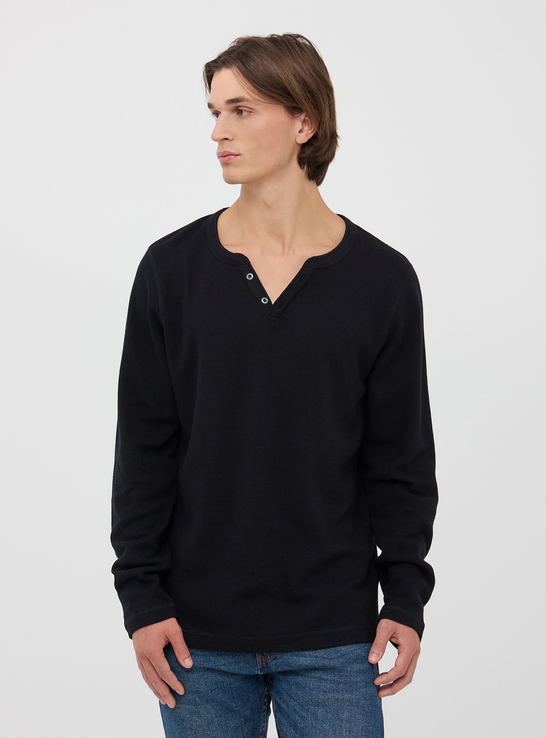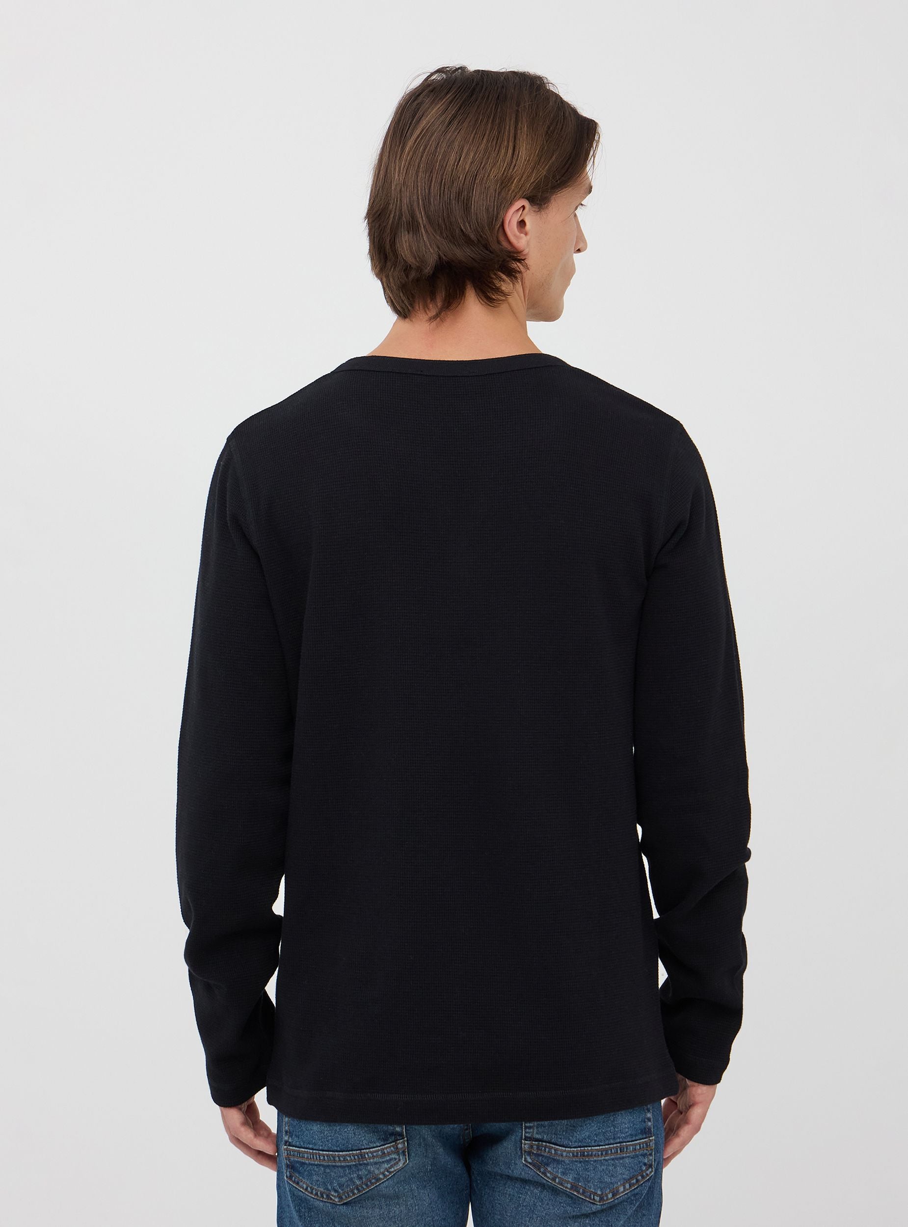 Questa maglia a maniche lunghe, realizzata in morbido cotone a tinta unita, presenta un elegante scollo a V arricchito da bottoni come dettaglio di design. Ideale per un look casual ma curato. Perfetta per il tempo libero o serate informali, questa maglia si abbina facilmente a jeans e sneakers.Dettagli