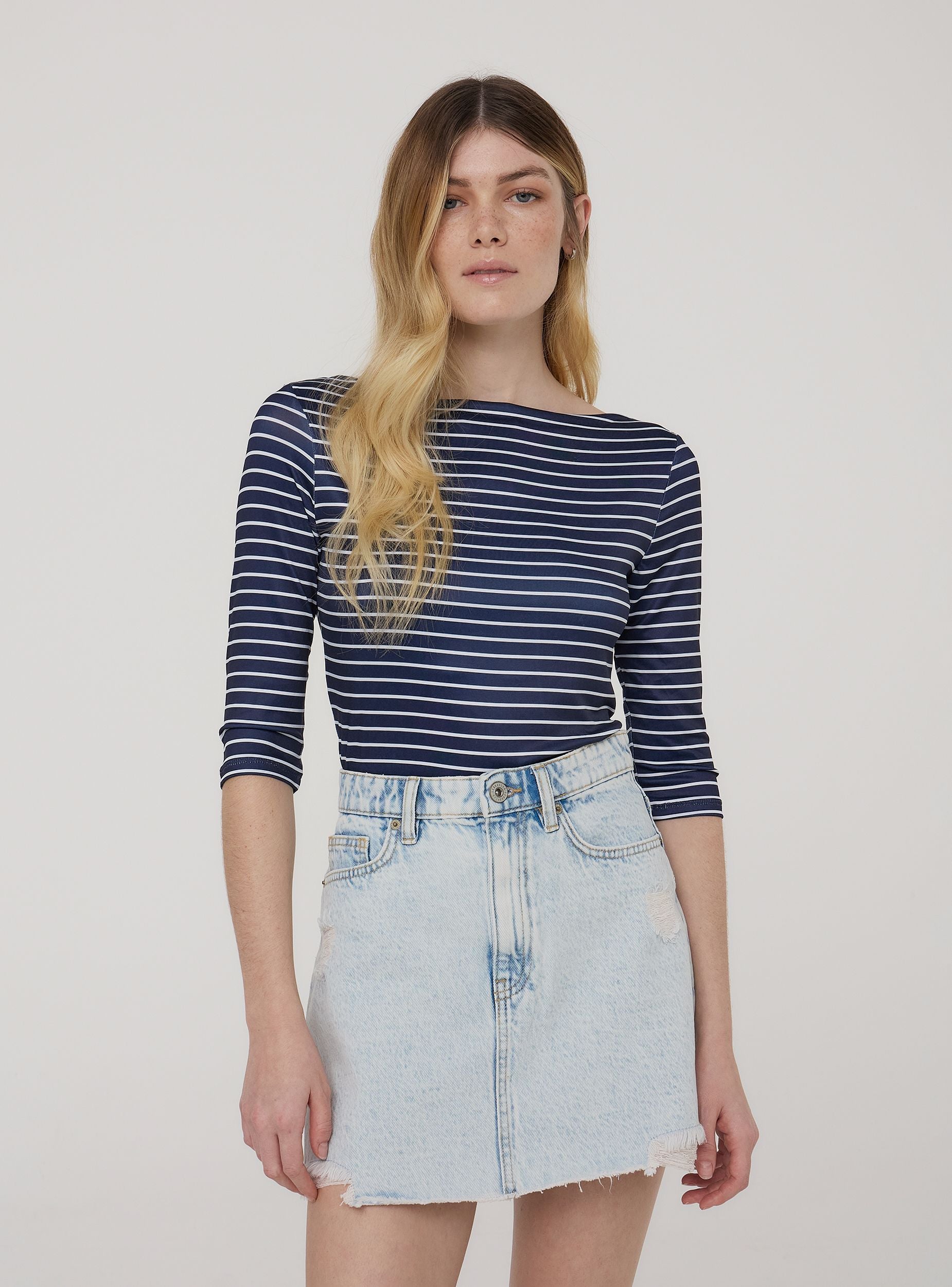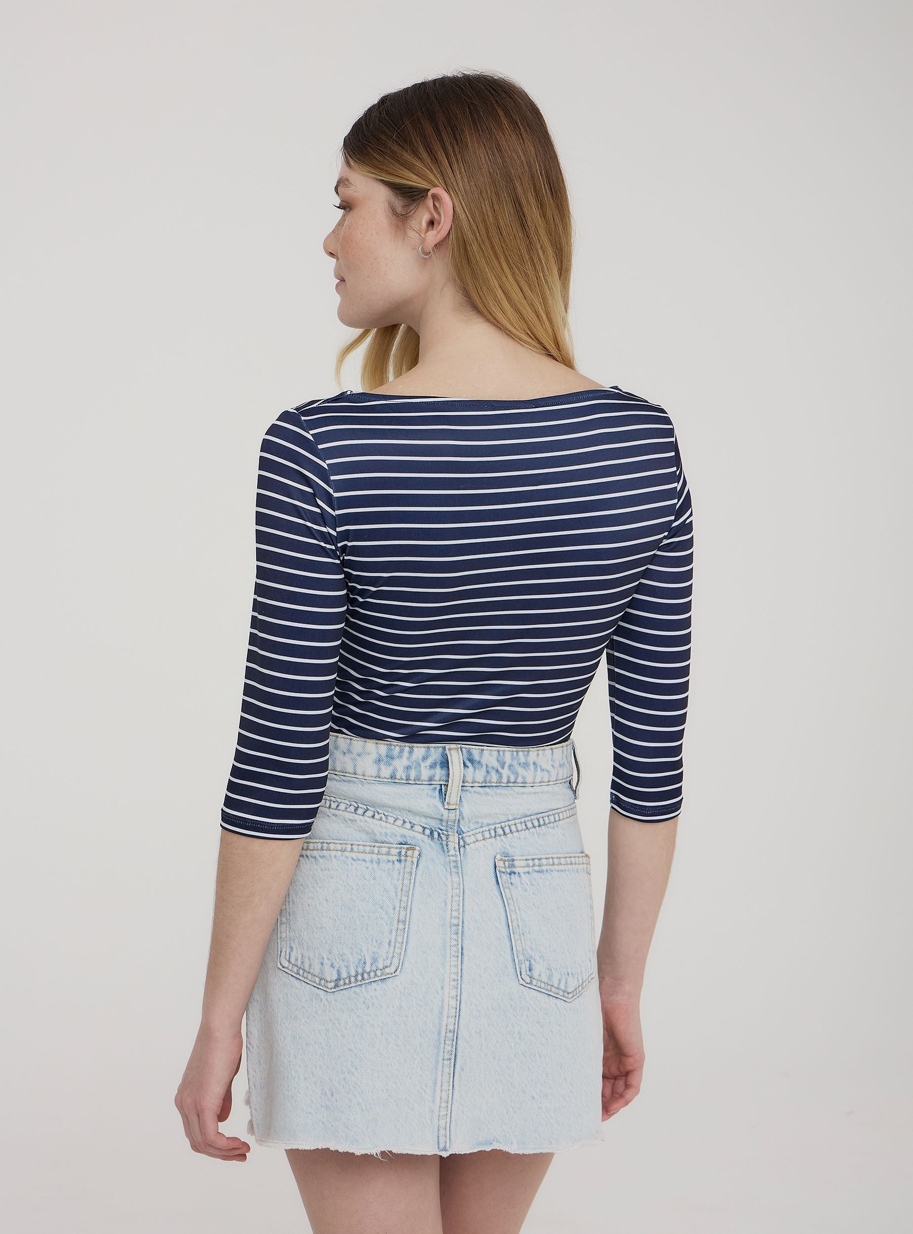 Maglia da donna a righe con maniche tre quarti e scollo ampio, ideale per un look casual e femminile. Perfetta da abbinare a jeans skinny o pantaloni capri per un outfit rilassato ma curato. Adatta per il tempo libero, passeggiate in città o un brunch con le amiche, offre comfort e stile in ogni occasione informale.Dettagli