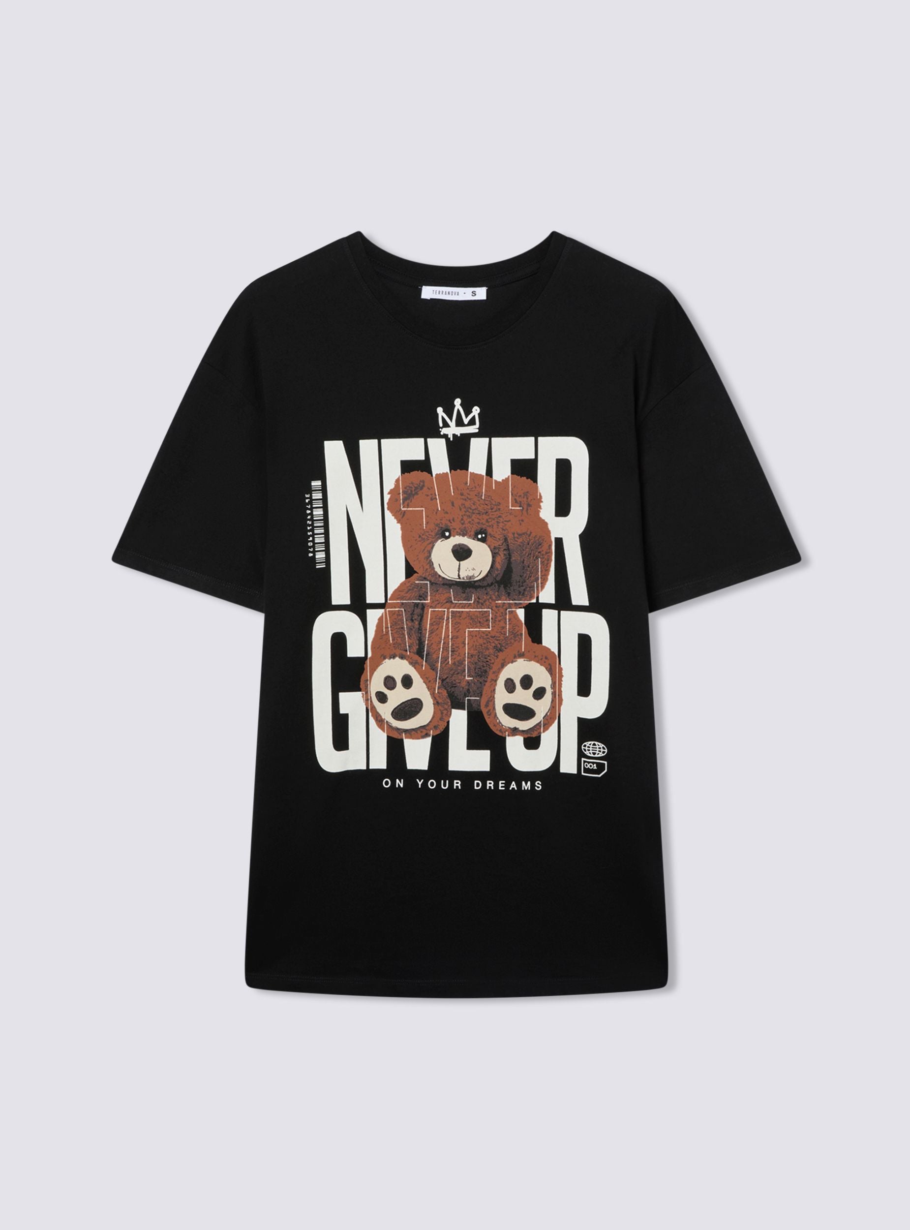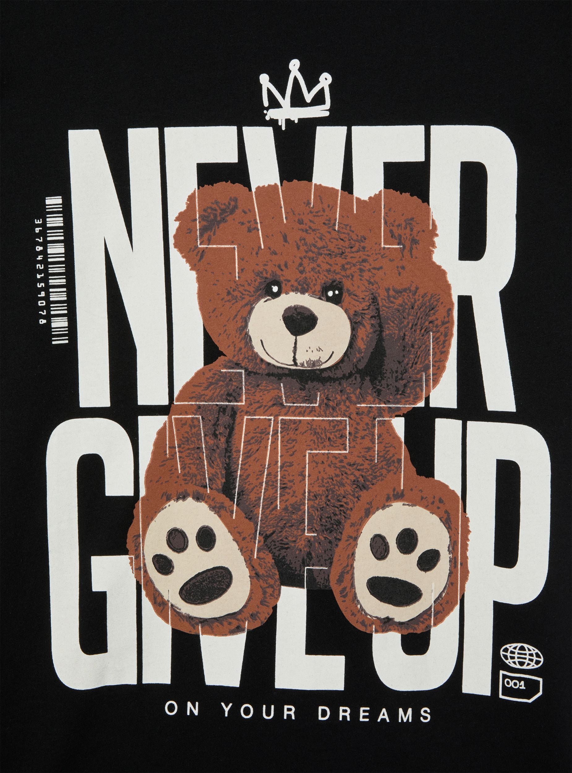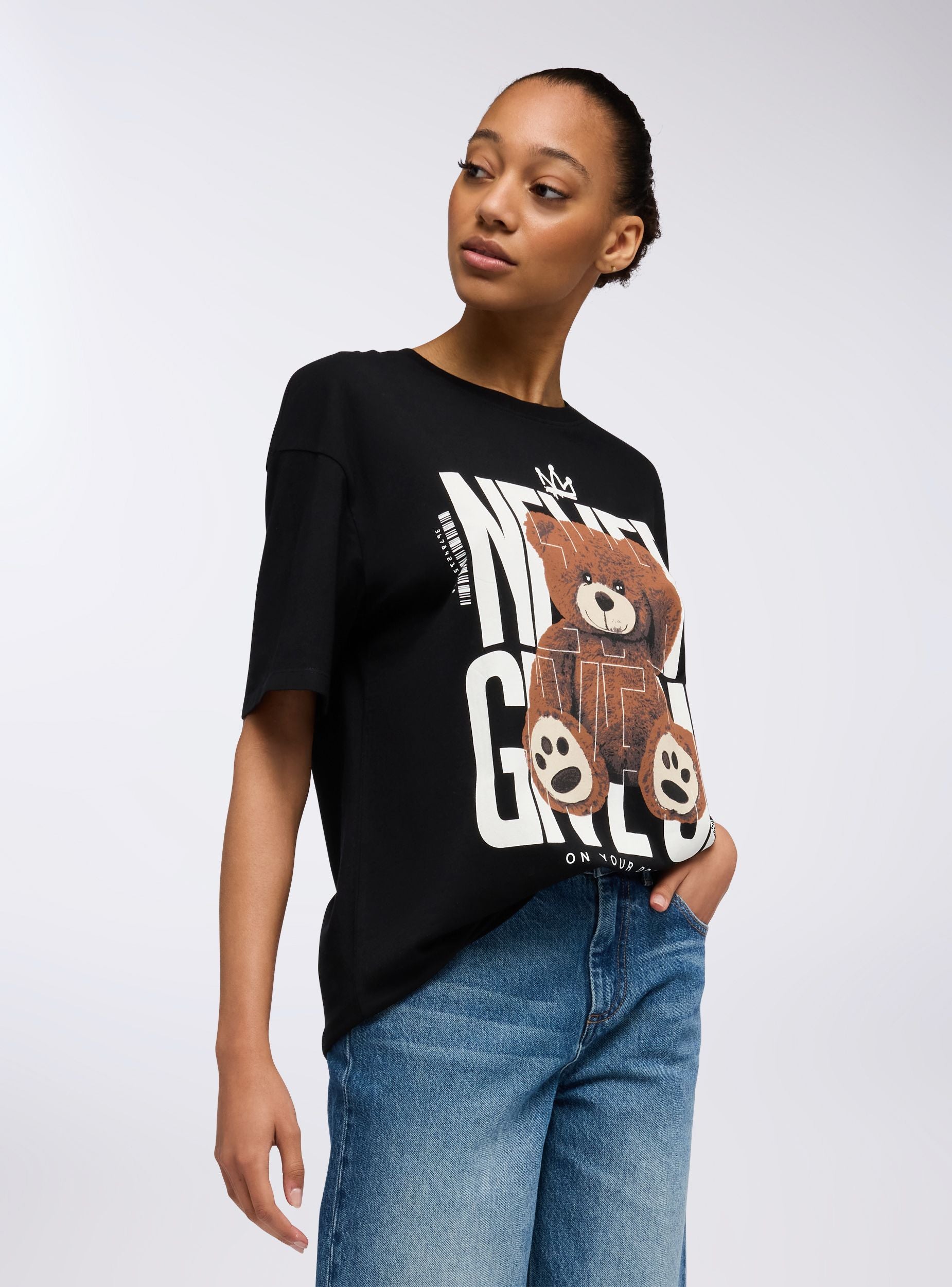 Maglietta da donna dal taglio maxi con maniche corte e girocollo classico. La parte frontale è caratterizzata da una grande stampa decorativa che combina una scritta con un adorabile orsetto posto al centro, creando un look vivace e giocoso. Il design grafico è perfetto per un abbigliamento casual che non passa inosservato, ideale per chi ama aggiungere un tocco di originalità al proprio stile quotidiano.Dettagli