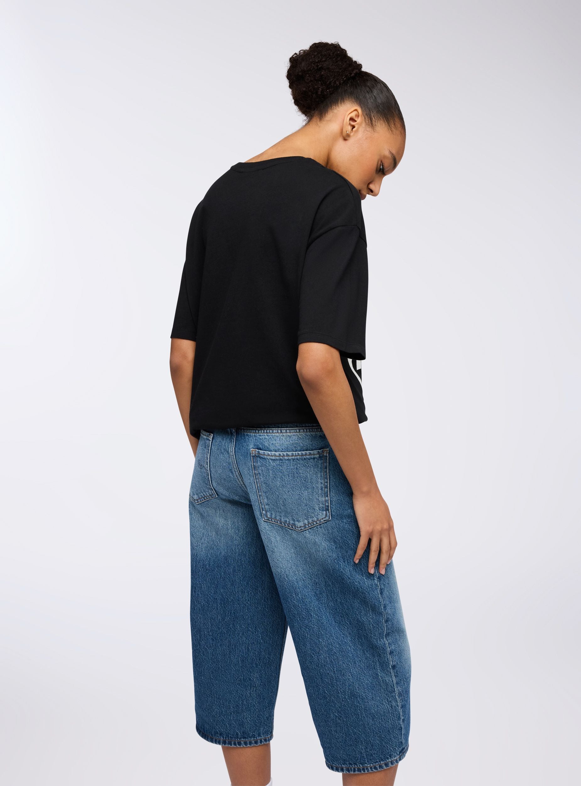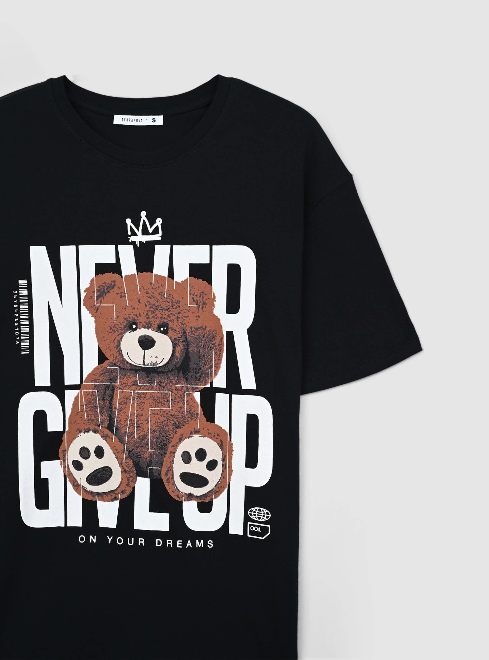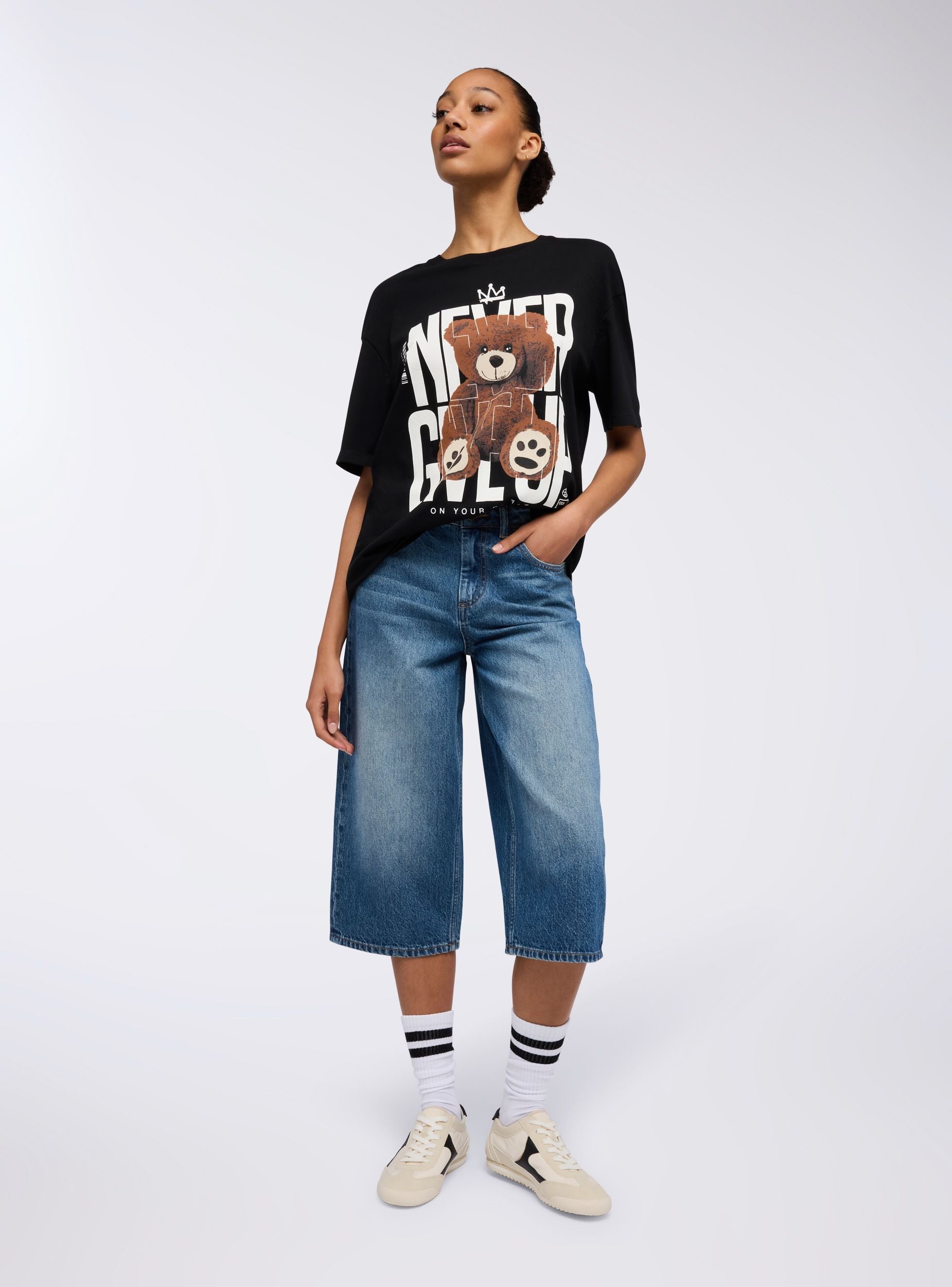 Maglietta da donna dal taglio maxi con maniche corte e girocollo classico. La parte frontale è caratterizzata da una grande stampa decorativa che combina una scritta con un adorabile orsetto posto al centro, creando un look vivace e giocoso. Il design grafico è perfetto per un abbigliamento casual che non passa inosservato, ideale per chi ama aggiungere un tocco di originalità al proprio stile quotidiano.Dettagli