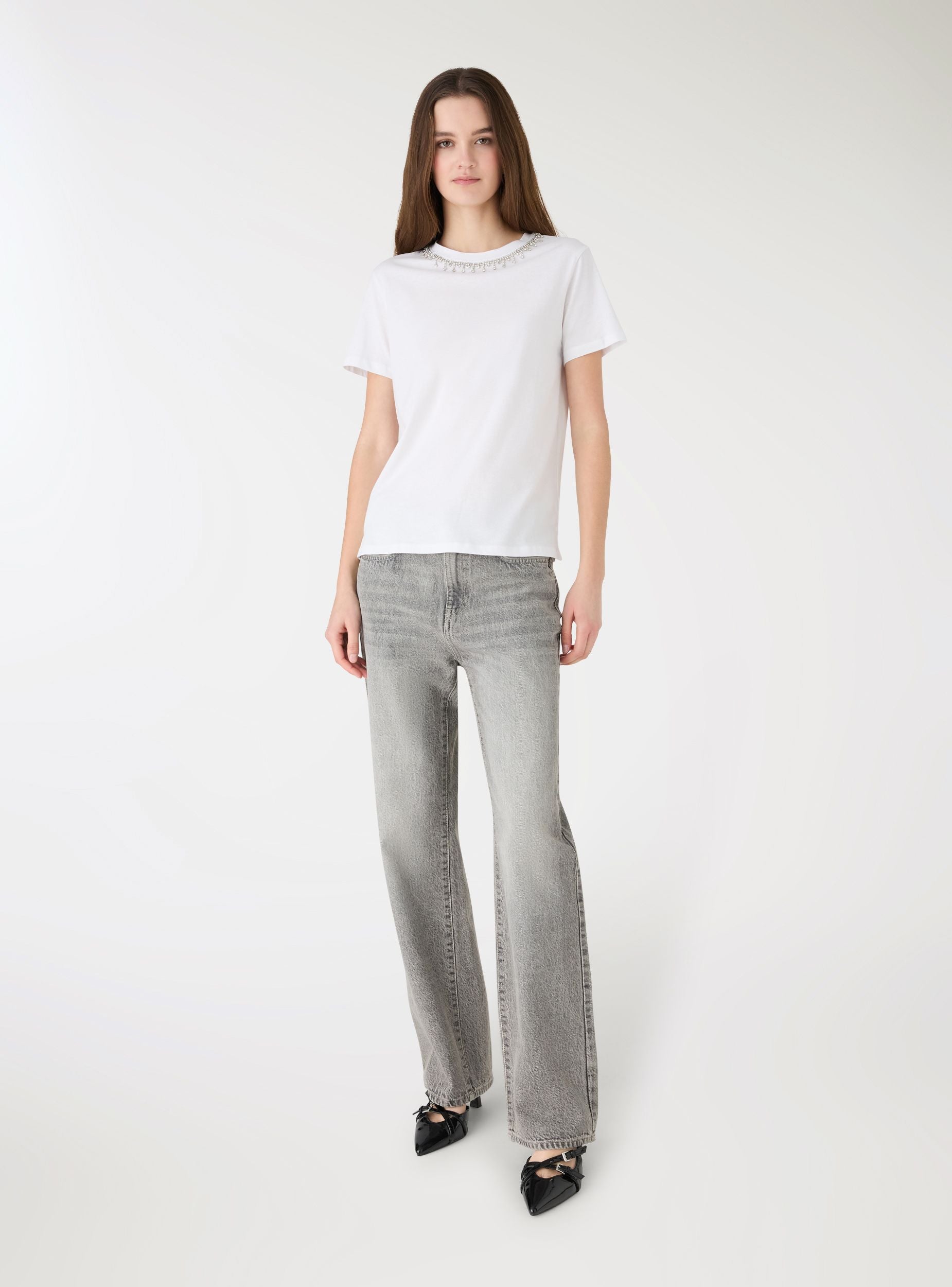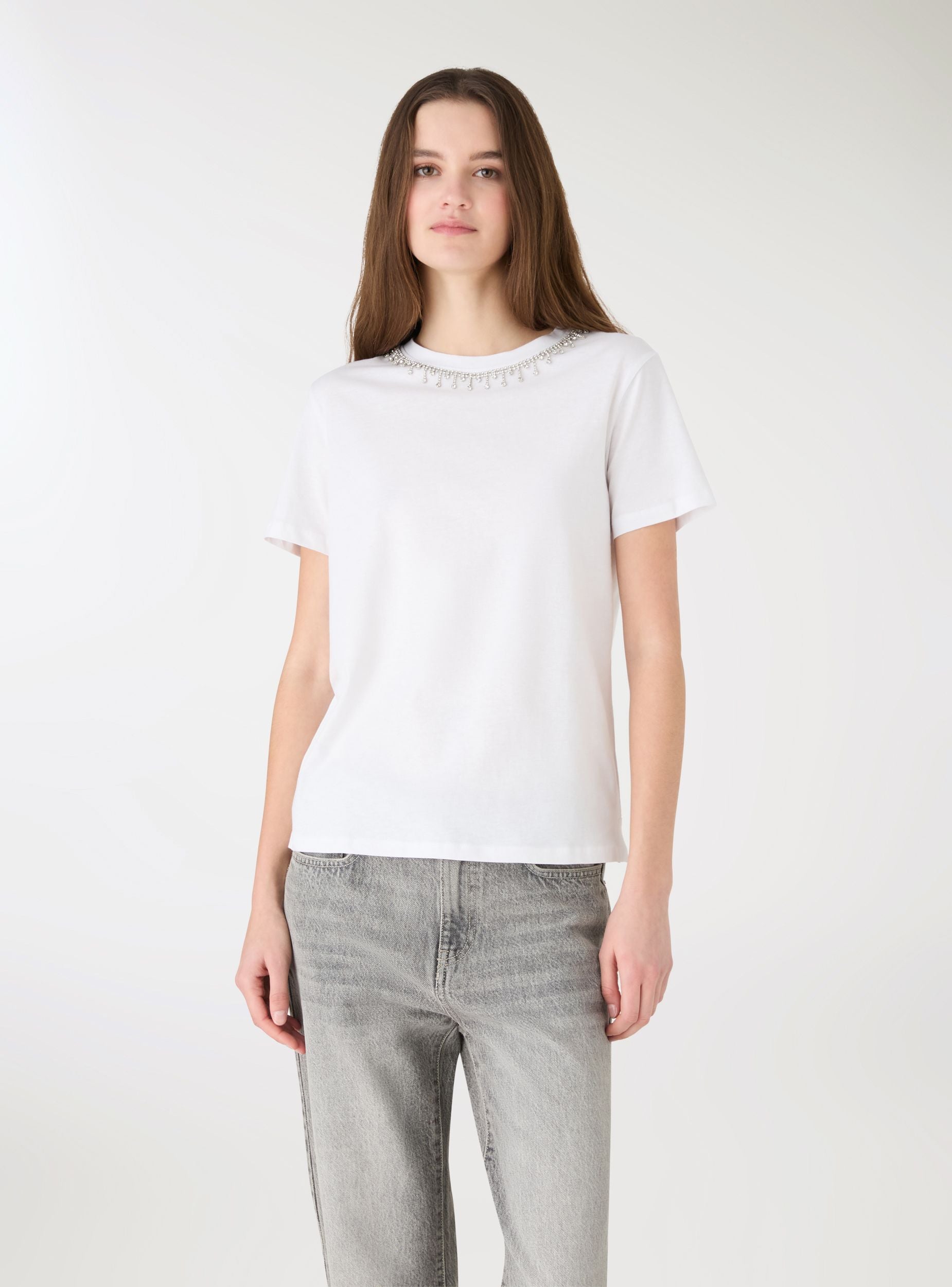 Maglietta da donna con girocollo e maniche corte, impreziosita da applicazioni gioiello intorno al collo che donano un effetto luccicante. Perfetta per elevare look quotidiani con jeans o gonne, si indossa facilmente grazie al taglio regular e alla linea pulita. Il design a tinta unita la rende versatile, mentre il dettaglio luminoso aggiunge carattere anche a outfit per serate o occasioni speciali.Dettagli