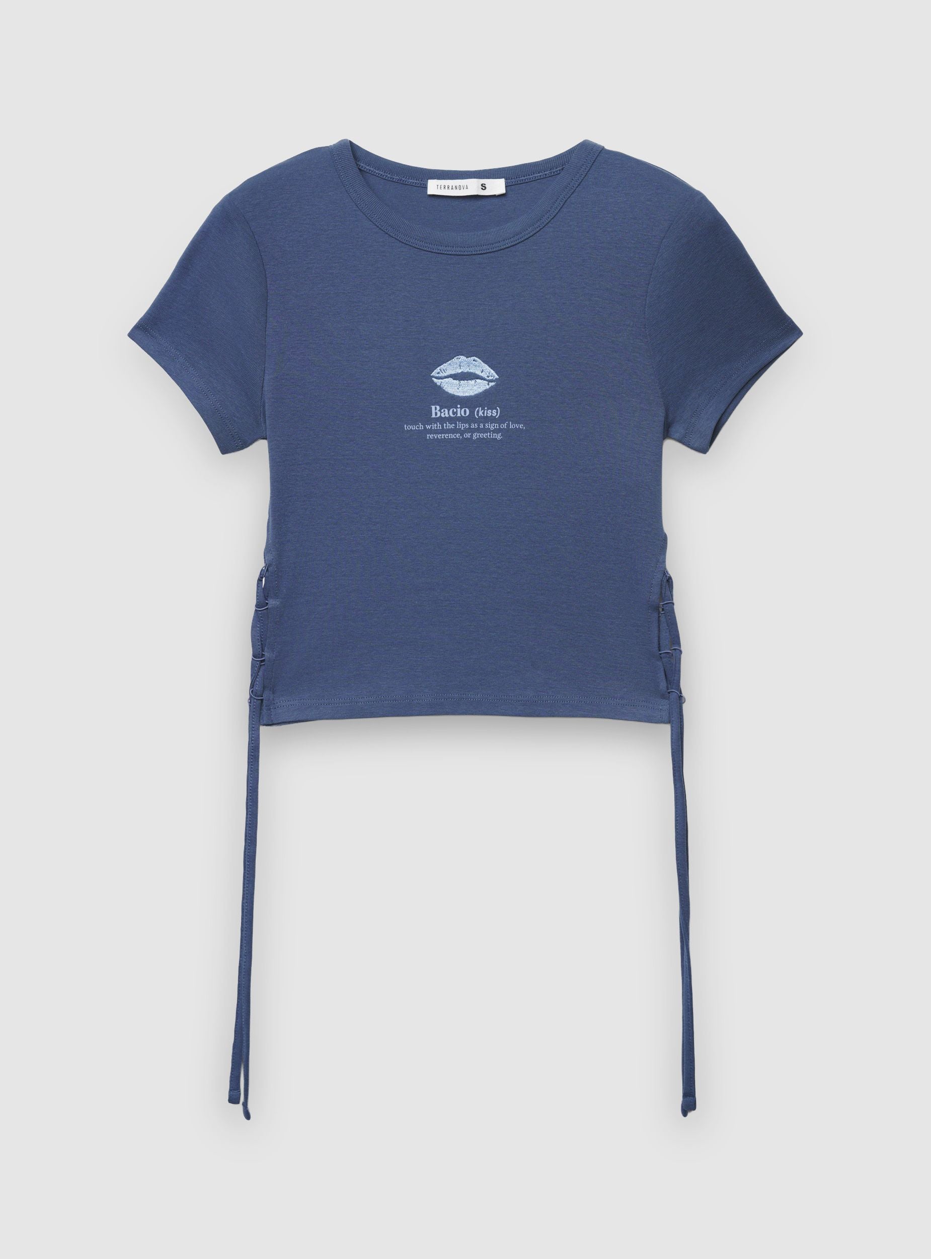 Maglietta da donna a tinta unita con ricamo frontale a tema bacio e stampa scritta. Modello crop con maniche corte e scollo tondo, impreziosito da lacci laterali che permettono di regolare l’arriccio in vita. Perfetta con jeans a vita alta, gonne midi o pantaloncini per un look casual trendy.Dettagli