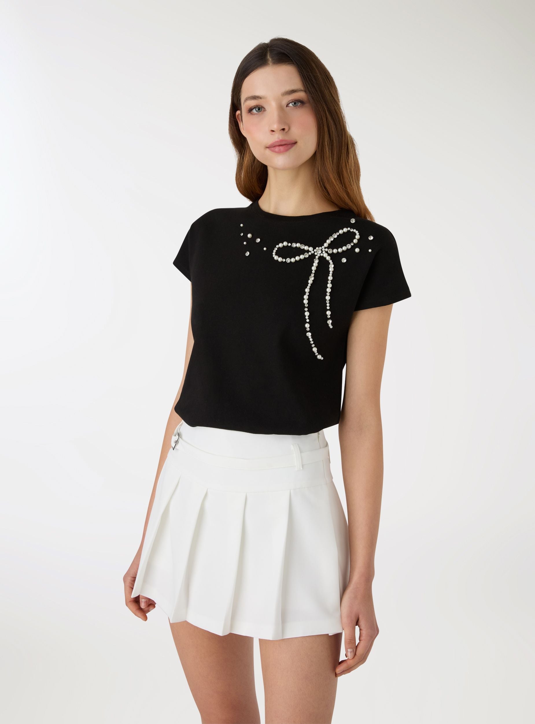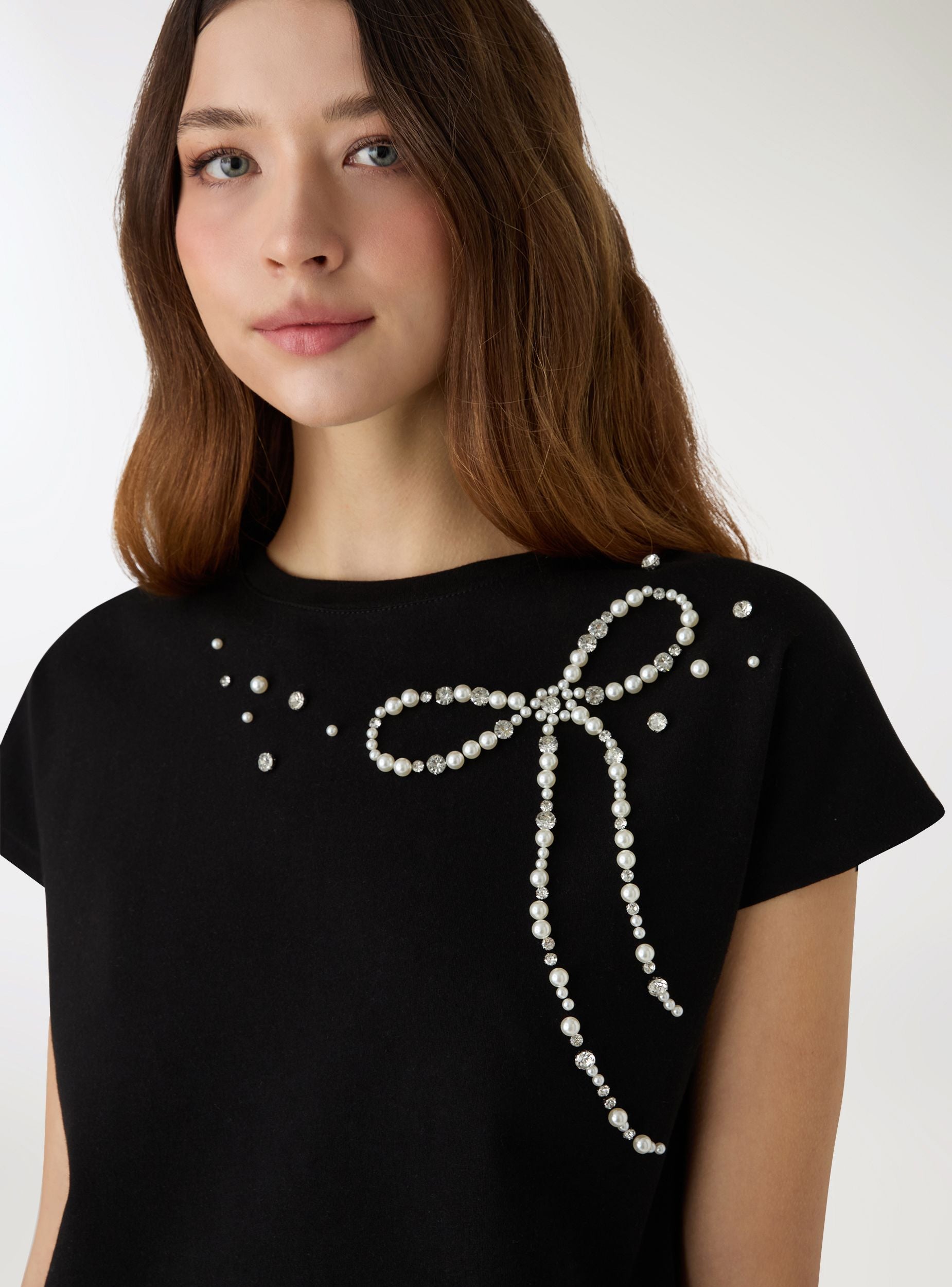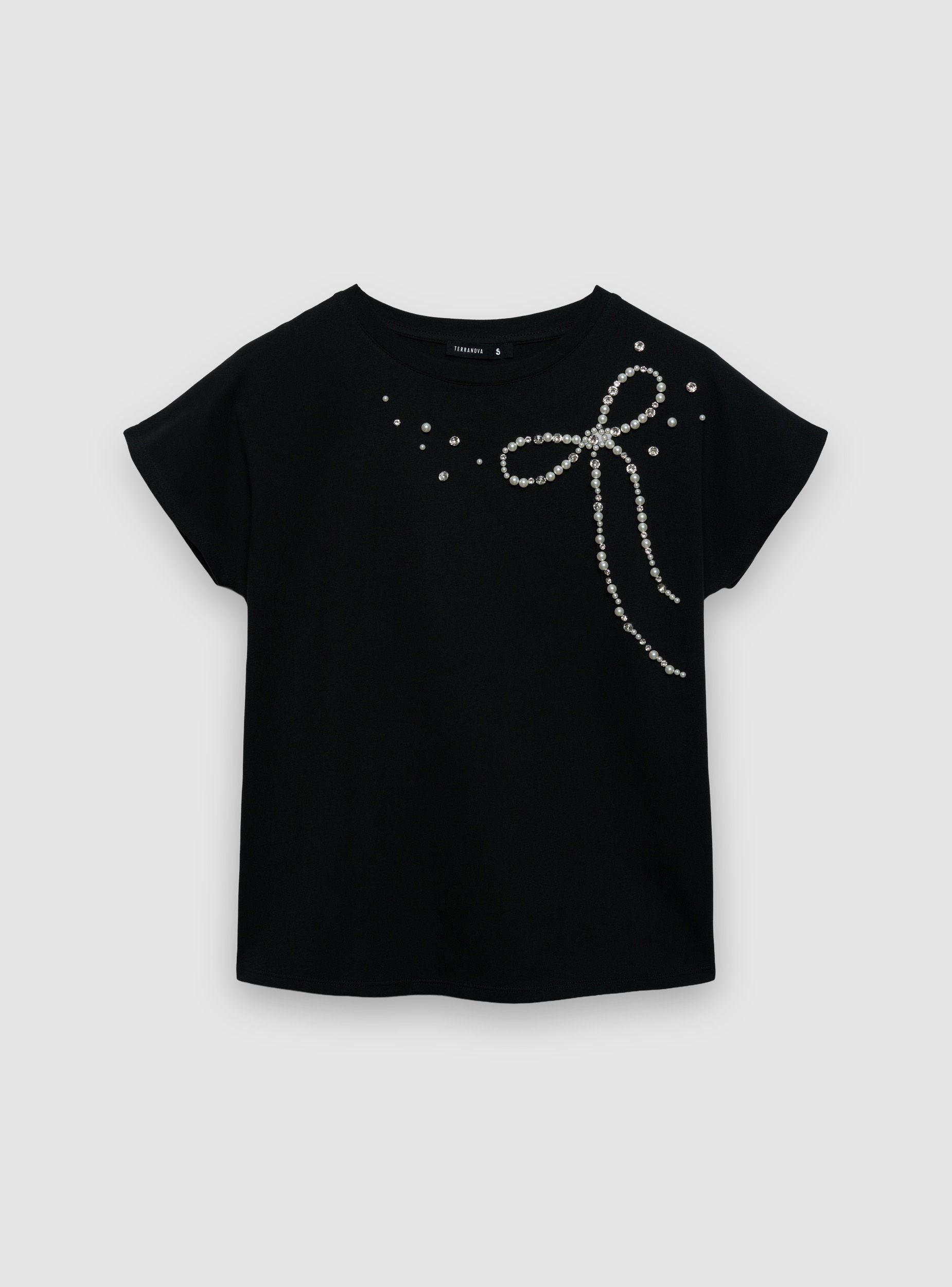 Maglietta da donna a tinta unita con maniche corte e scollo tondo, impreziosita sul davanti da applicazioni a fiocco realizzate con perle e strass. Il taglio regolare la rende comoda per ogni giorno, perfetta con jeans o gonne per un effetto femminile. Indossabile anche sotto blazer per look curati o con pantaloncini nel tempo libero.Dettagli