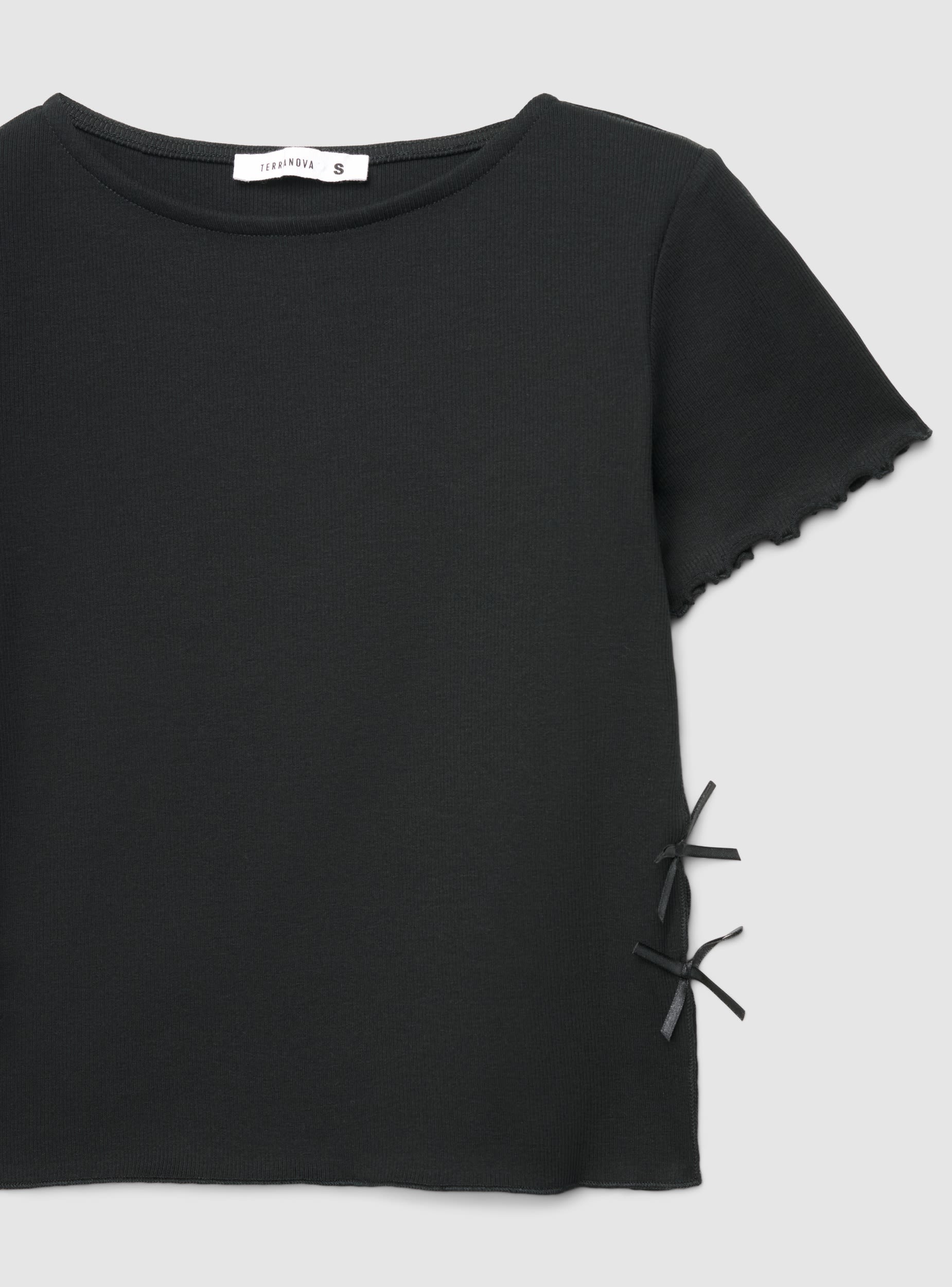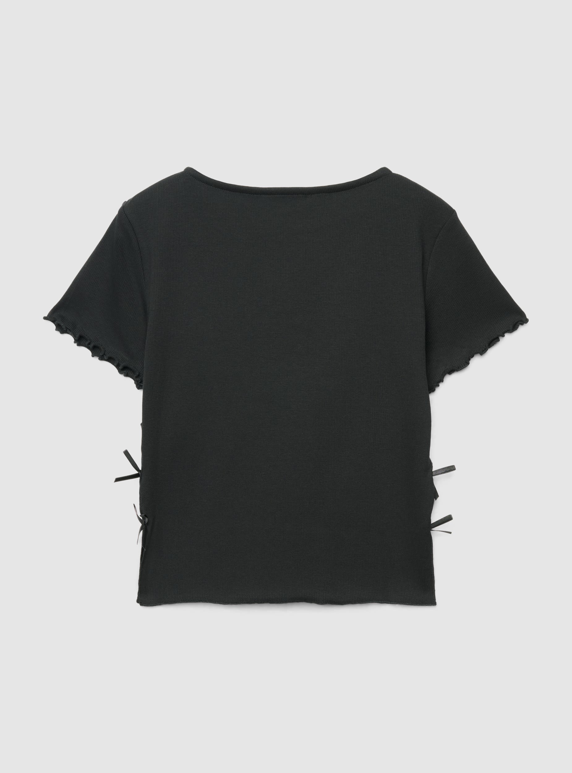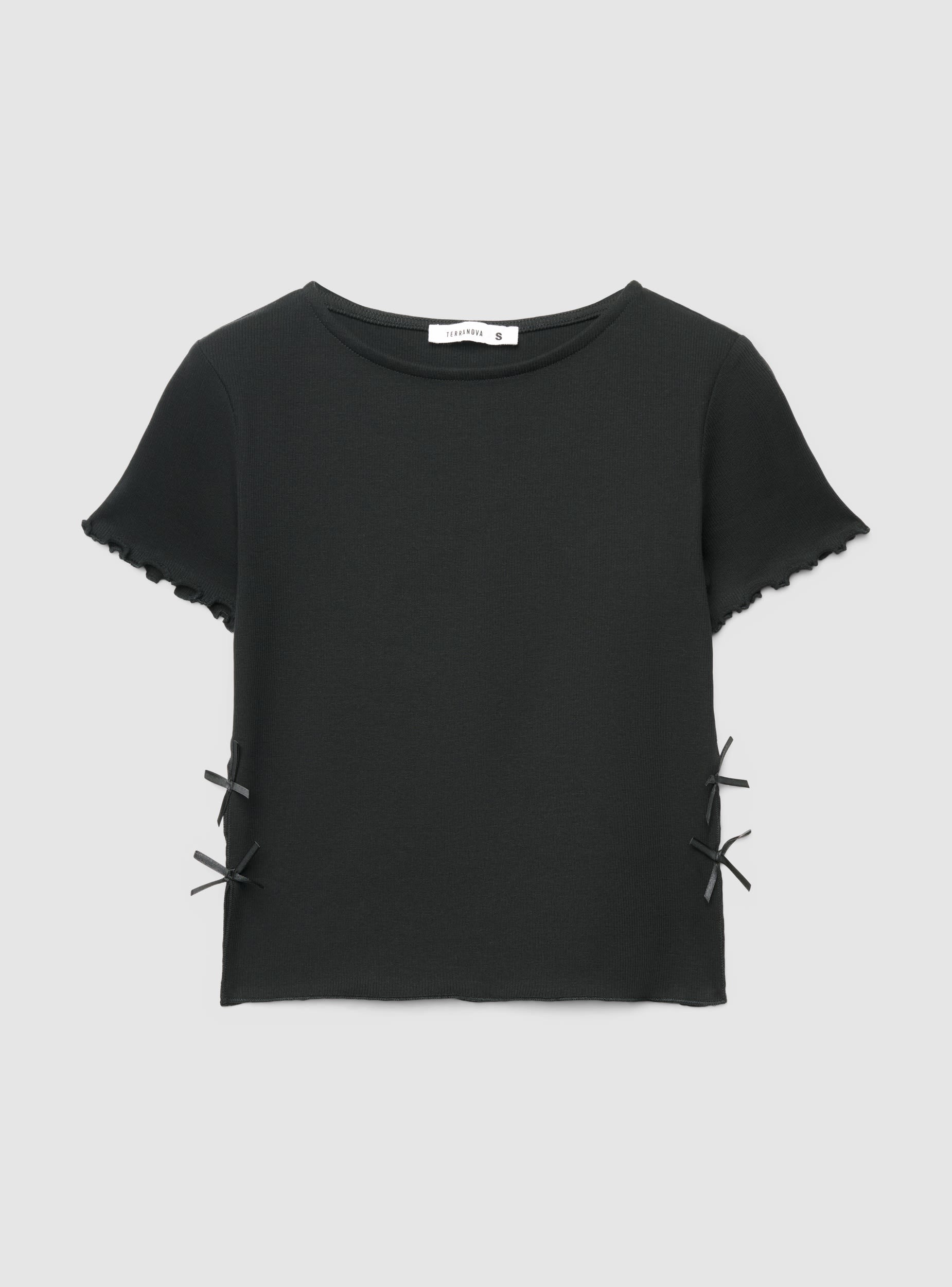 Maglietta da donna a tinta unita con scollo tondo e maniche corte. Dettagli arricciati sul bordo maniche che aggiungono un tocco femminile, mentre i piccoli fiocchi applicati ai fianchi valorizzano la silhouette. Vestibilità regular, ideale per il tempo libero e abbinata a jeans, gonne o pantaloncini. Design essenziale e versatile per outfit quotidiani.Dettagli