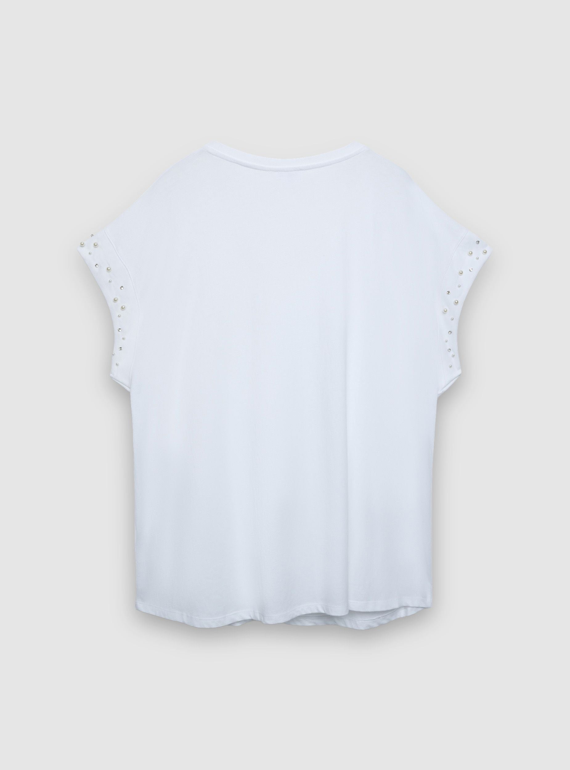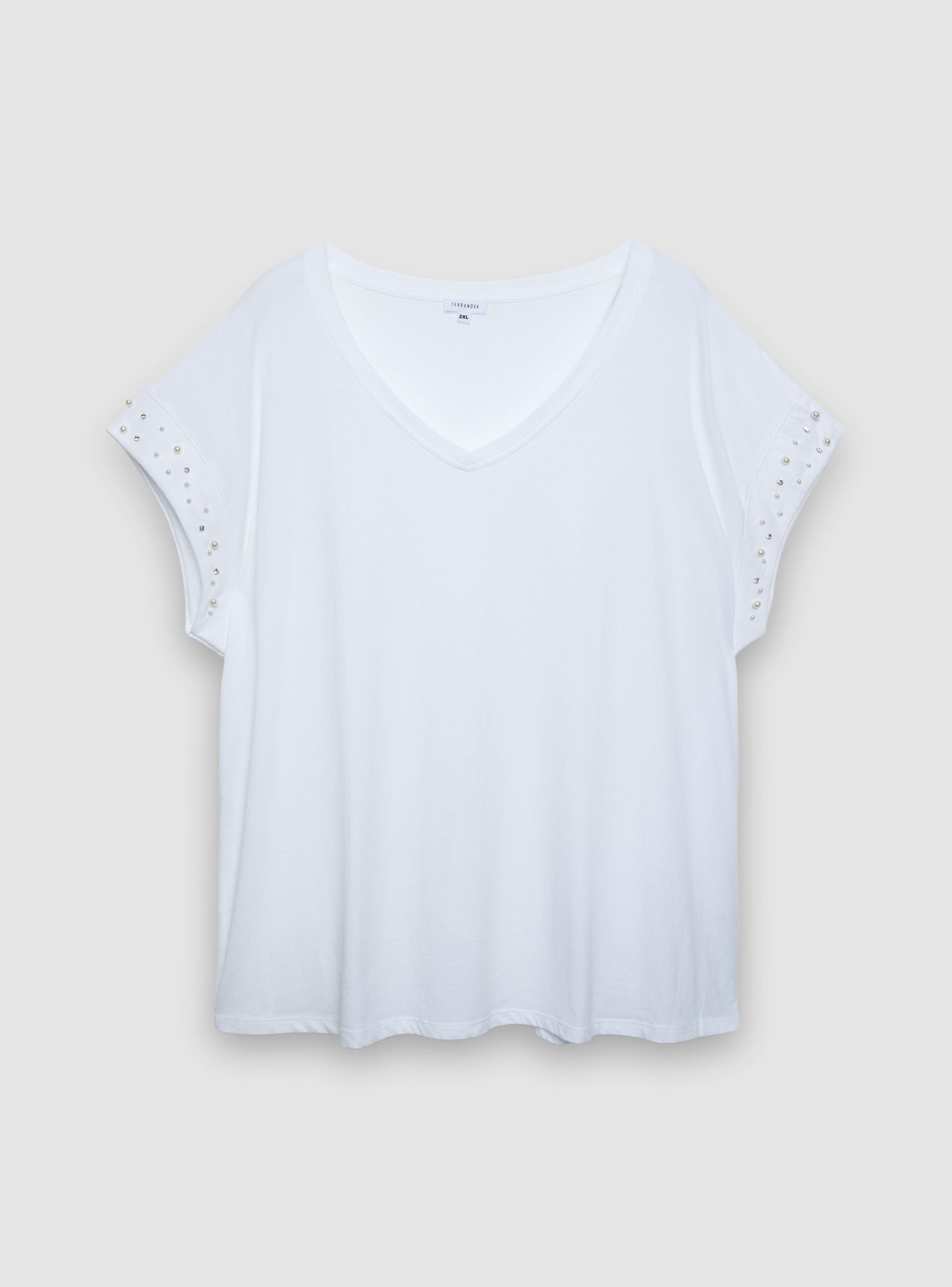 Maglietta da donna a tinta unita con scollo a V e maniche corte. Le maniche sono arricchite da applicazioni di perle e strass che donano un tocco luminoso perfetto dal giorno alla sera. Vestibilità comoda ideale con jeans, pantaloni sartoriali o gonne midi. Ideale per un look versatile che valorizza outfit casual ma curati.Dettagli