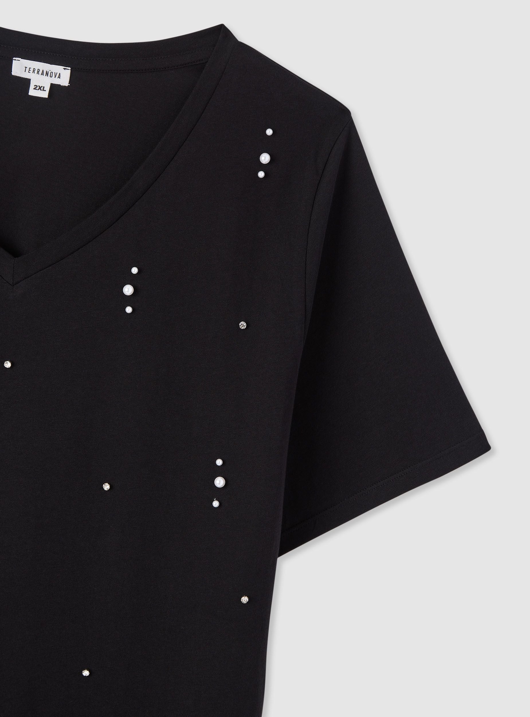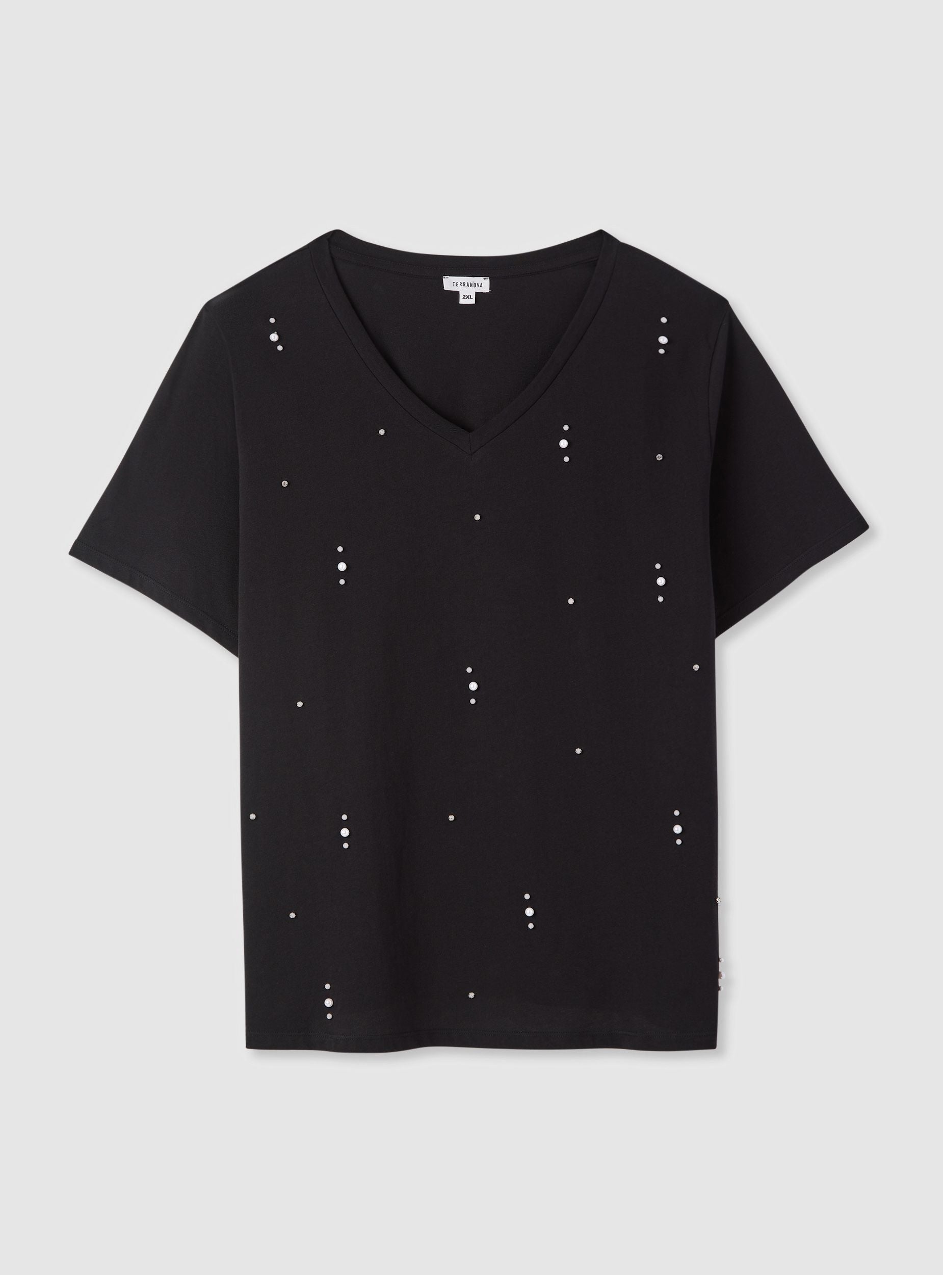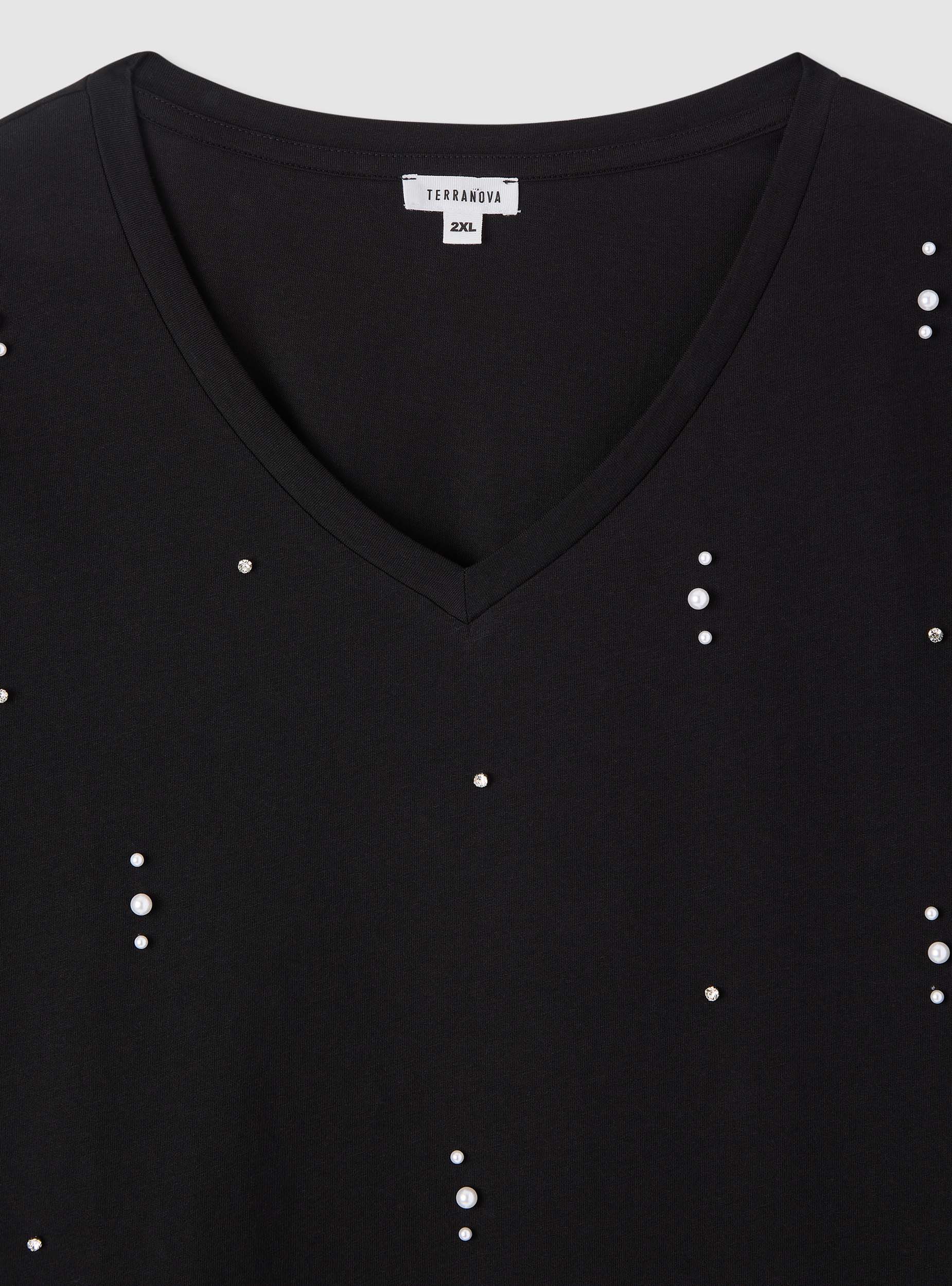 Maglietta da donna a tinta unita con scollo a V e maniche corte, decorata da piccole applicazioni di perle e strass disposte sul davanti. Perfetta per elevare look casual con jeans e sneakers o per outfit più curati con blazer e pantaloni. Vestibilità regular che cade morbida sul busto, orlo dritto e nessuna chiusura per un comfort quotidiano. Ideale dal giorno alla sera grazie al tocco luminoso delle finiture.Dettagli