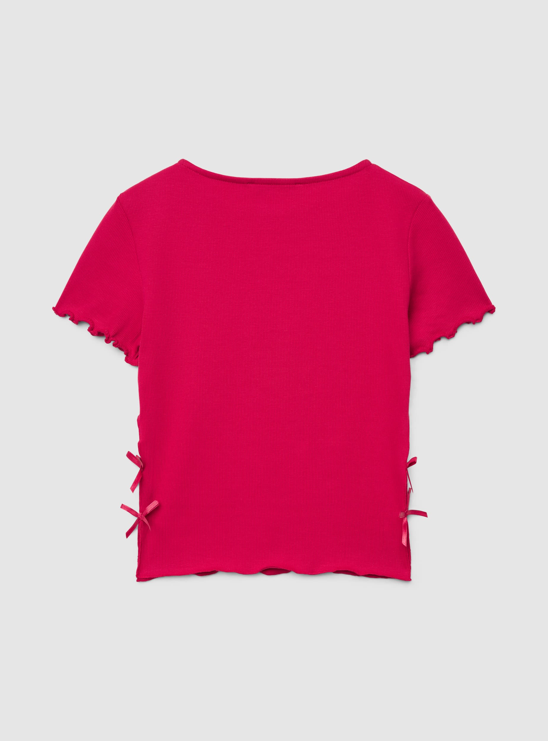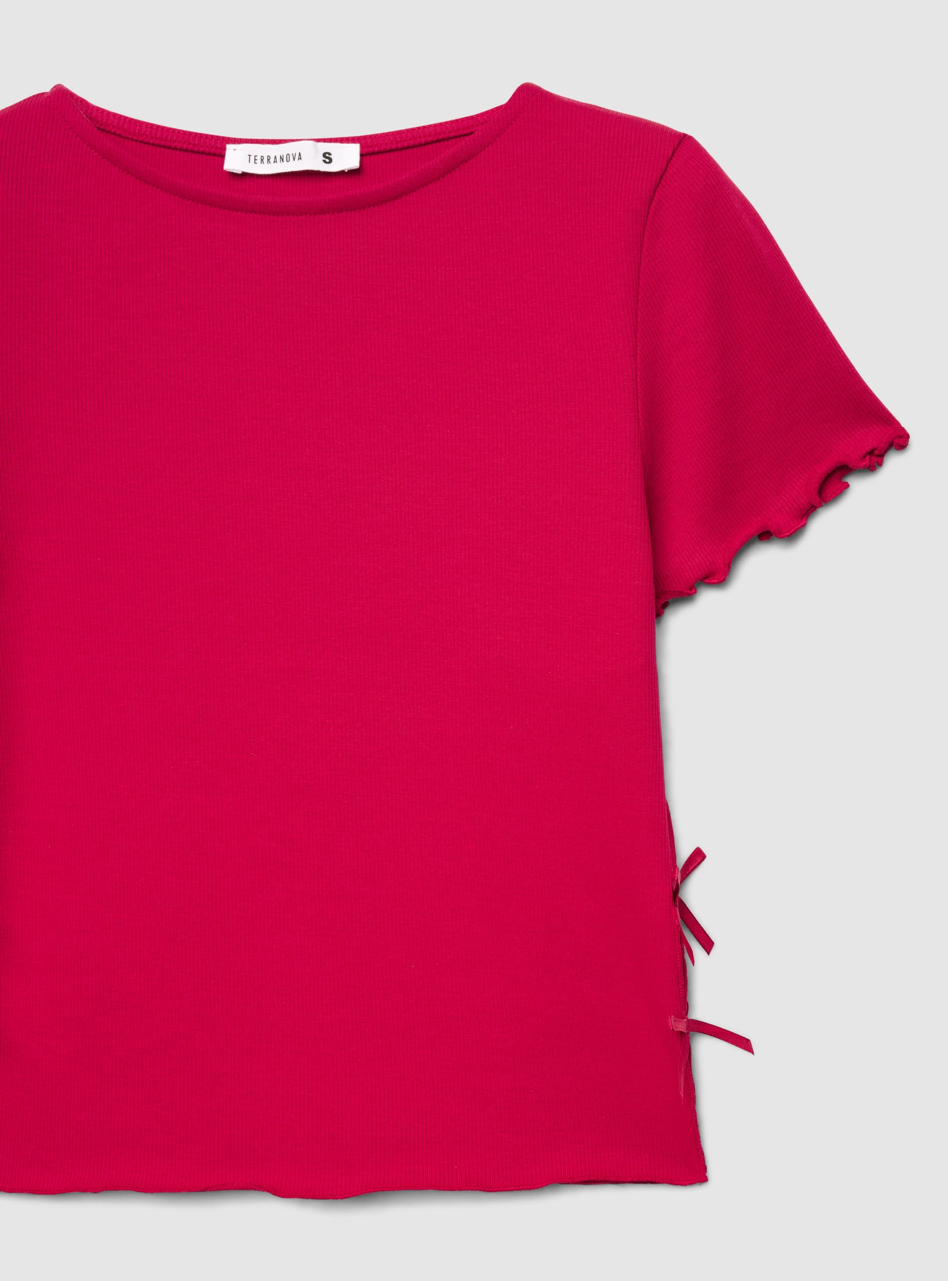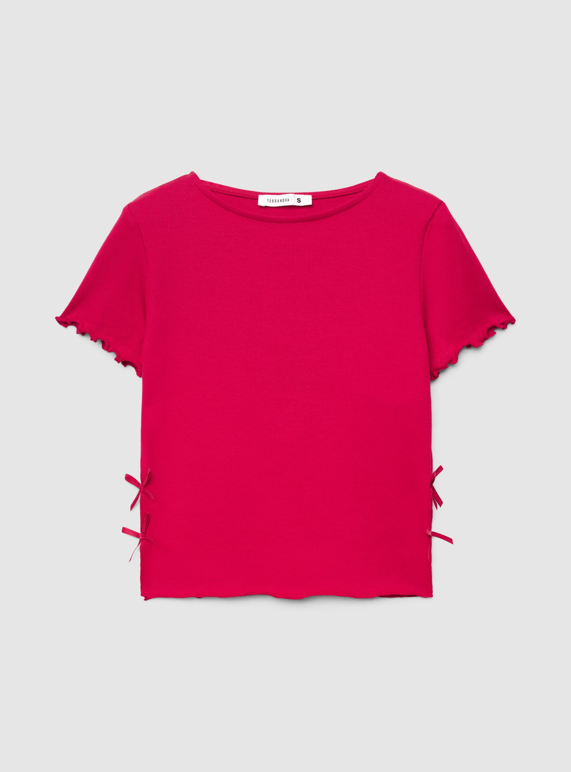 Maglietta da donna a tinta unita con scollo tondo e maniche corte. Dettagli arricciati sul bordo maniche che aggiungono un tocco femminile, mentre i piccoli fiocchi applicati ai fianchi valorizzano la silhouette. Vestibilità regular, ideale per il tempo libero e abbinata a jeans, gonne o pantaloncini. Design essenziale e versatile per outfit quotidiani.Dettagli