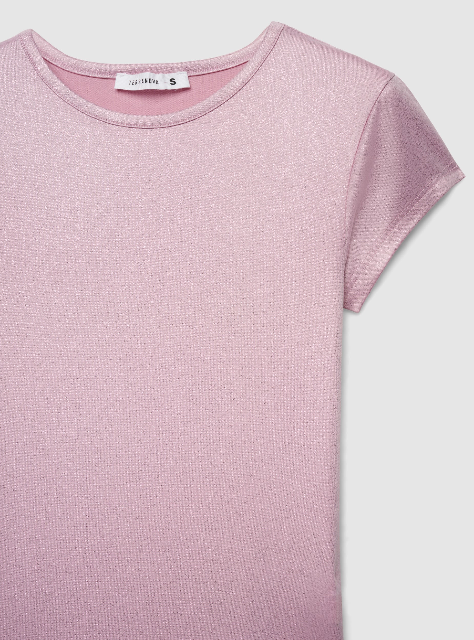 Maglietta da donna a tinta unita con effetto luccicante, ideale per dare un tocco brillante ai look quotidiani o serali. Modello con girocollo, maniche corte e vestibilità regular. Perfetta con jeans e sneakers per il giorno o con una gonna midi e sandali per un outfit più femminile. Design essenziale e finiture pulite per massima versatilità.Dettagli