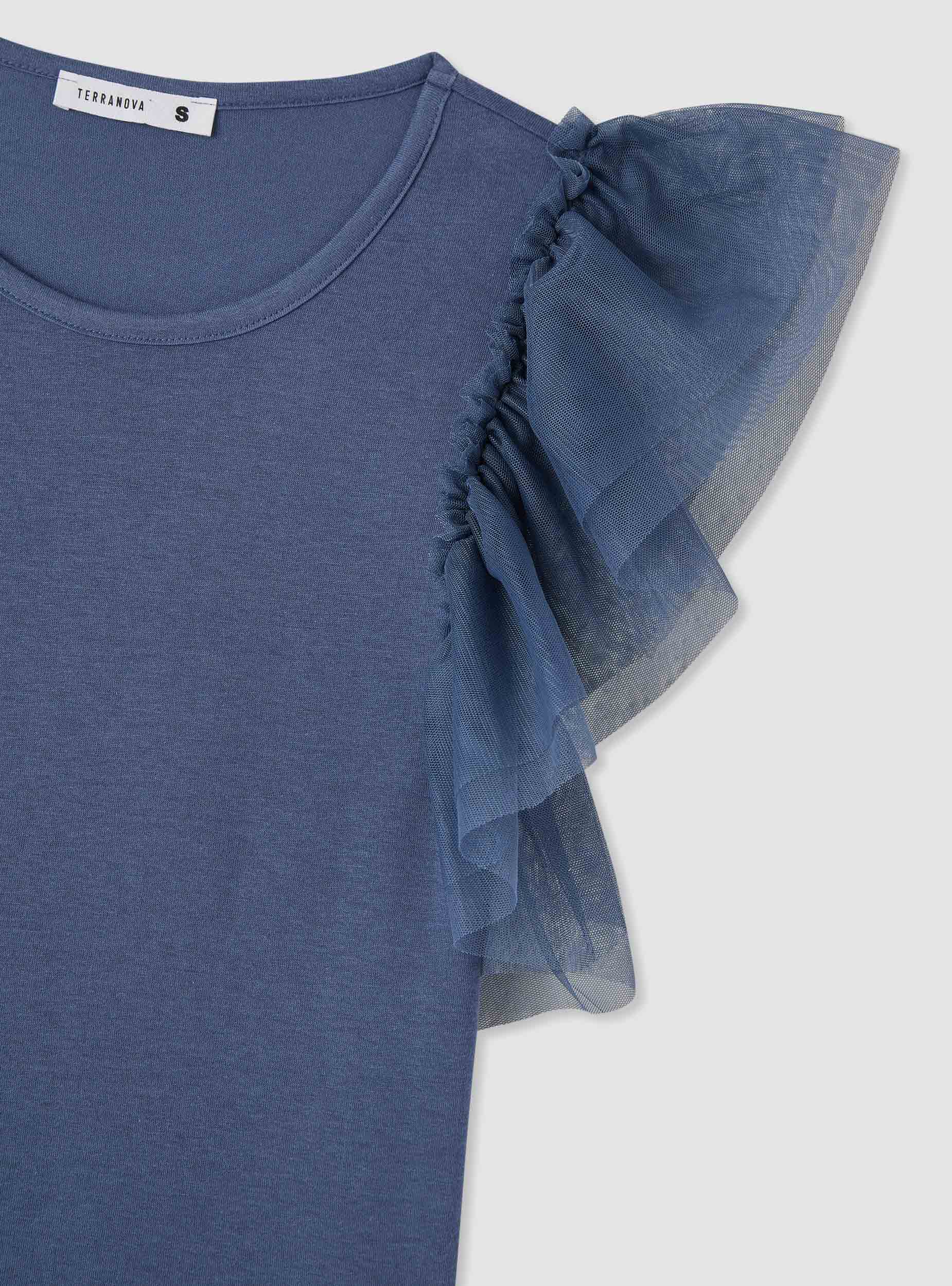 Maglietta da donna a tinta unita con girocollo e maniche corte arricciate a balze in tulle, perfetta per dare un tocco femminile ai look quotidiani. Vestibilità regular che si abbina facilmente a jeans o gonne per uscite, lavoro o serate informali.Dettagli