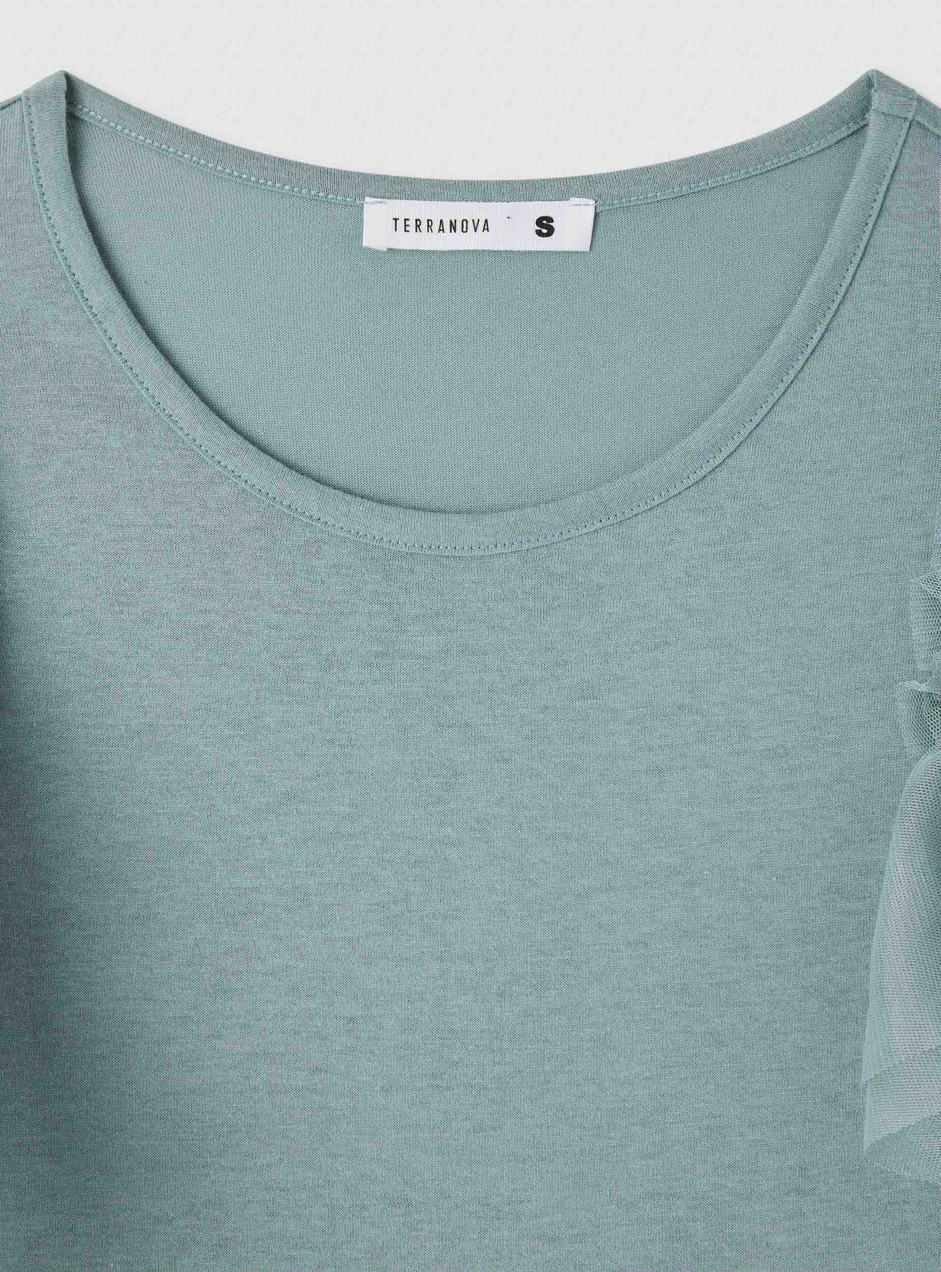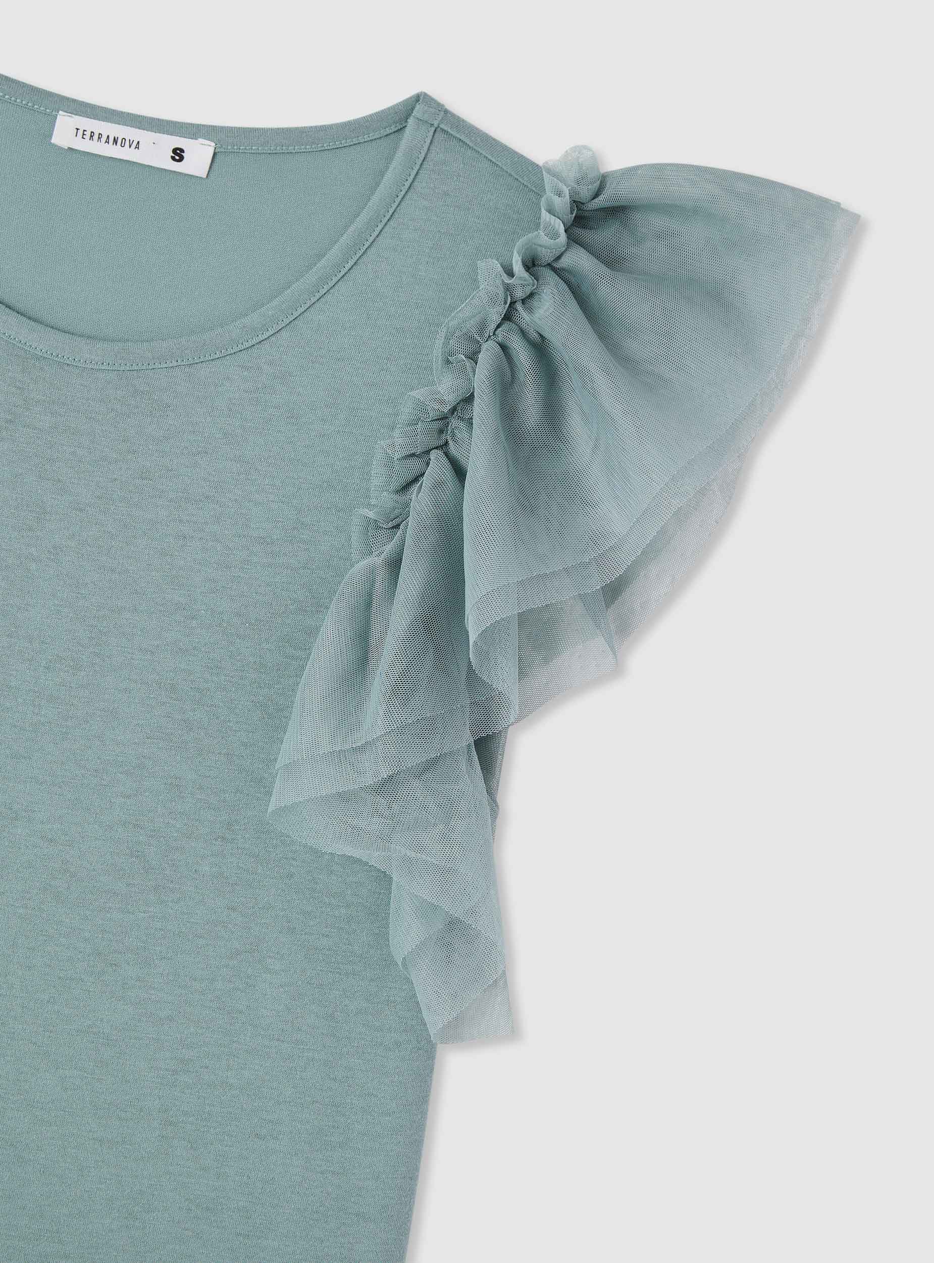 Maglietta da donna a tinta unita con girocollo e maniche corte arricciate a balze in tulle, perfetta per dare un tocco femminile ai look quotidiani. Vestibilità regular che si abbina facilmente a jeans o gonne per uscite, lavoro o serate informali.Dettagli