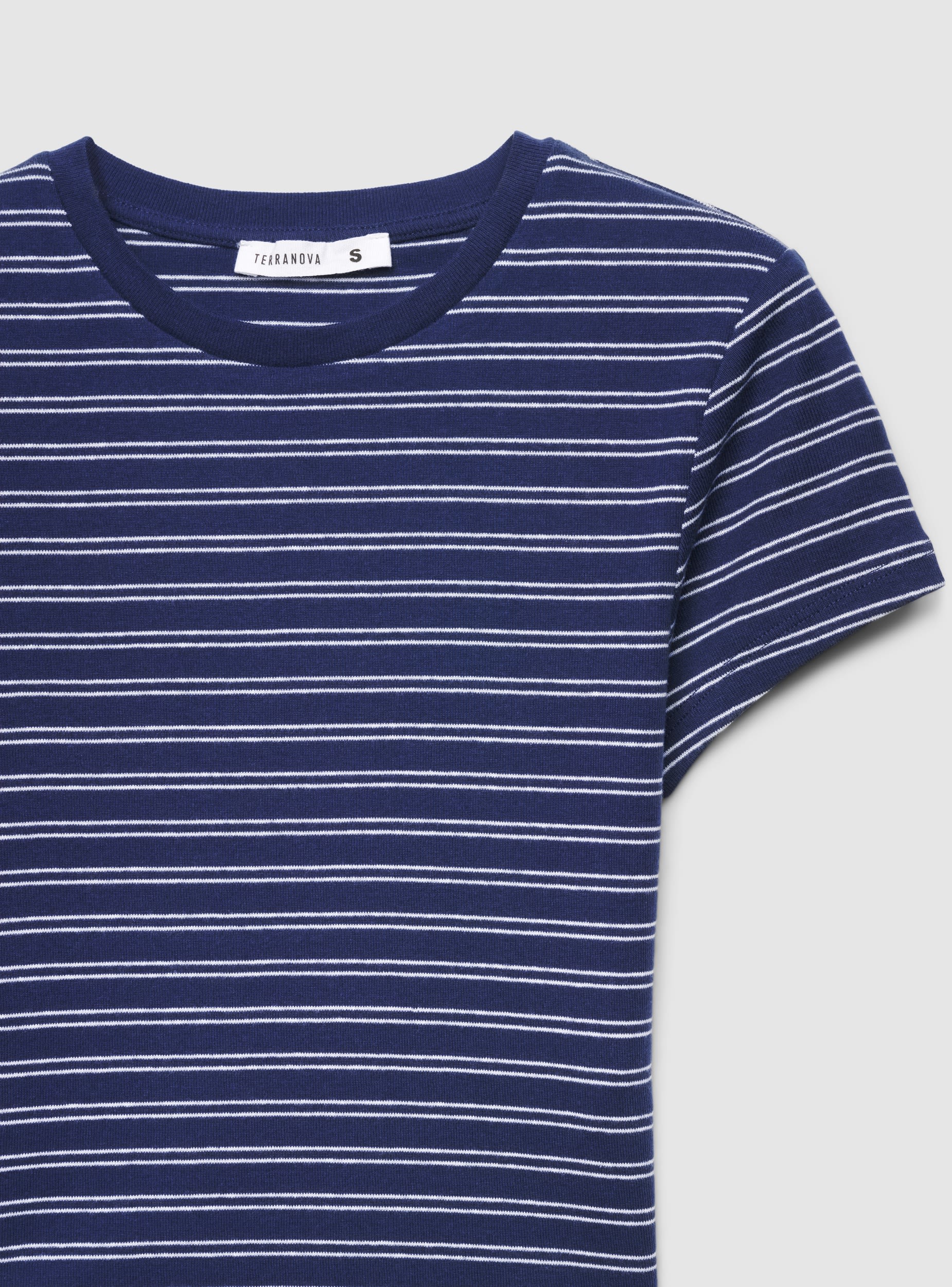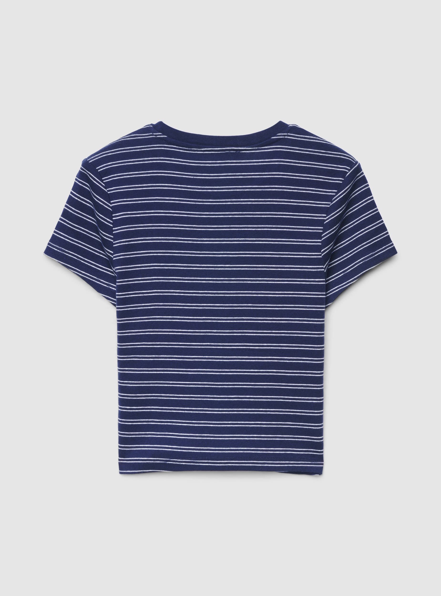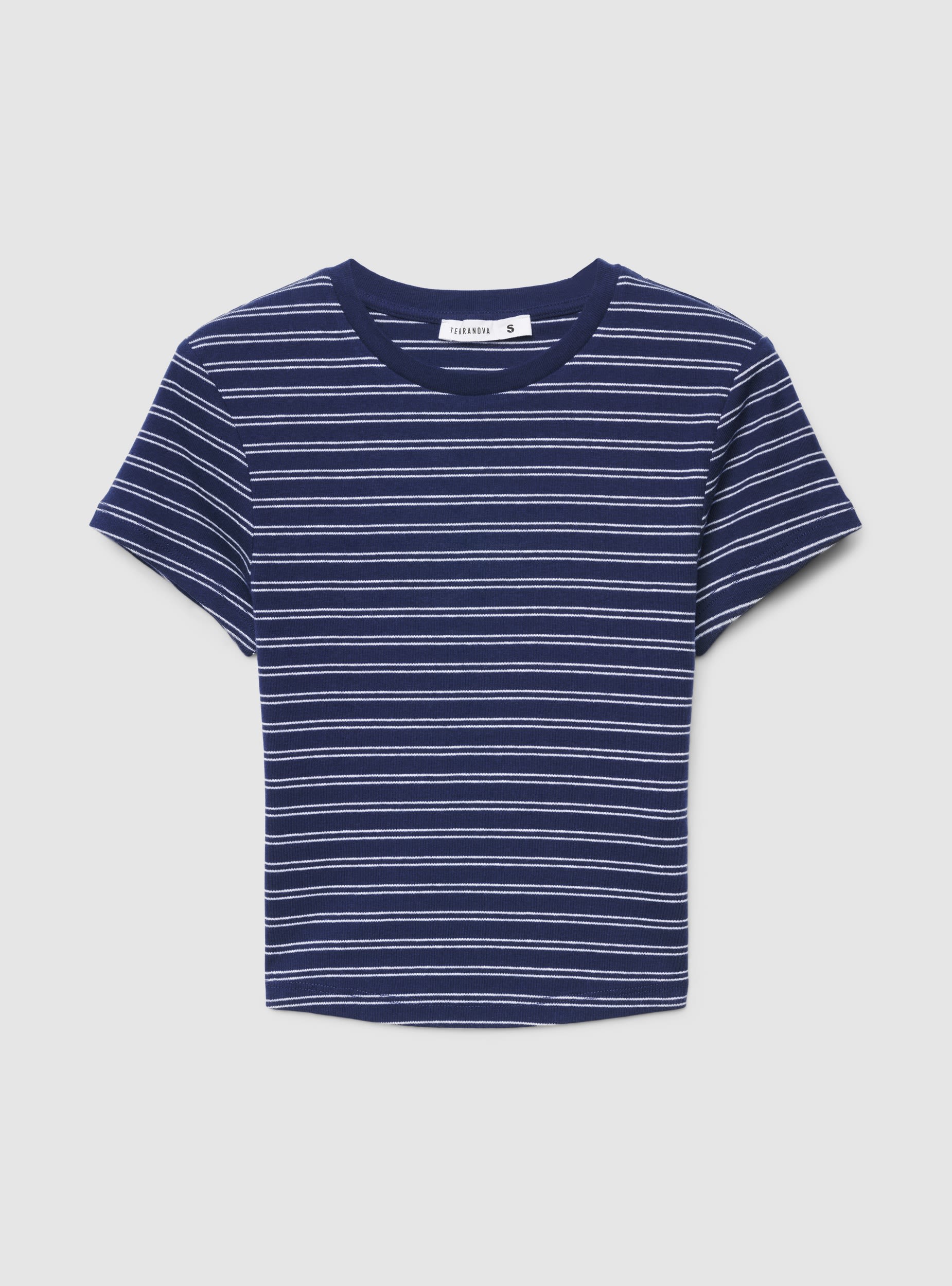 Maglietta da donna a righe con girocollo e maniche corte, taglio crop che valorizza la vita. Perfetta per look casual e urban, si abbina a jeans o pantaloncini a vita alta e sneakers. Linee pulite e vestibilità confortevole. Un capo versatile per ogni giorno, ideale per creare outfit a strati con camicie leggere o cardigan.Dettagli
