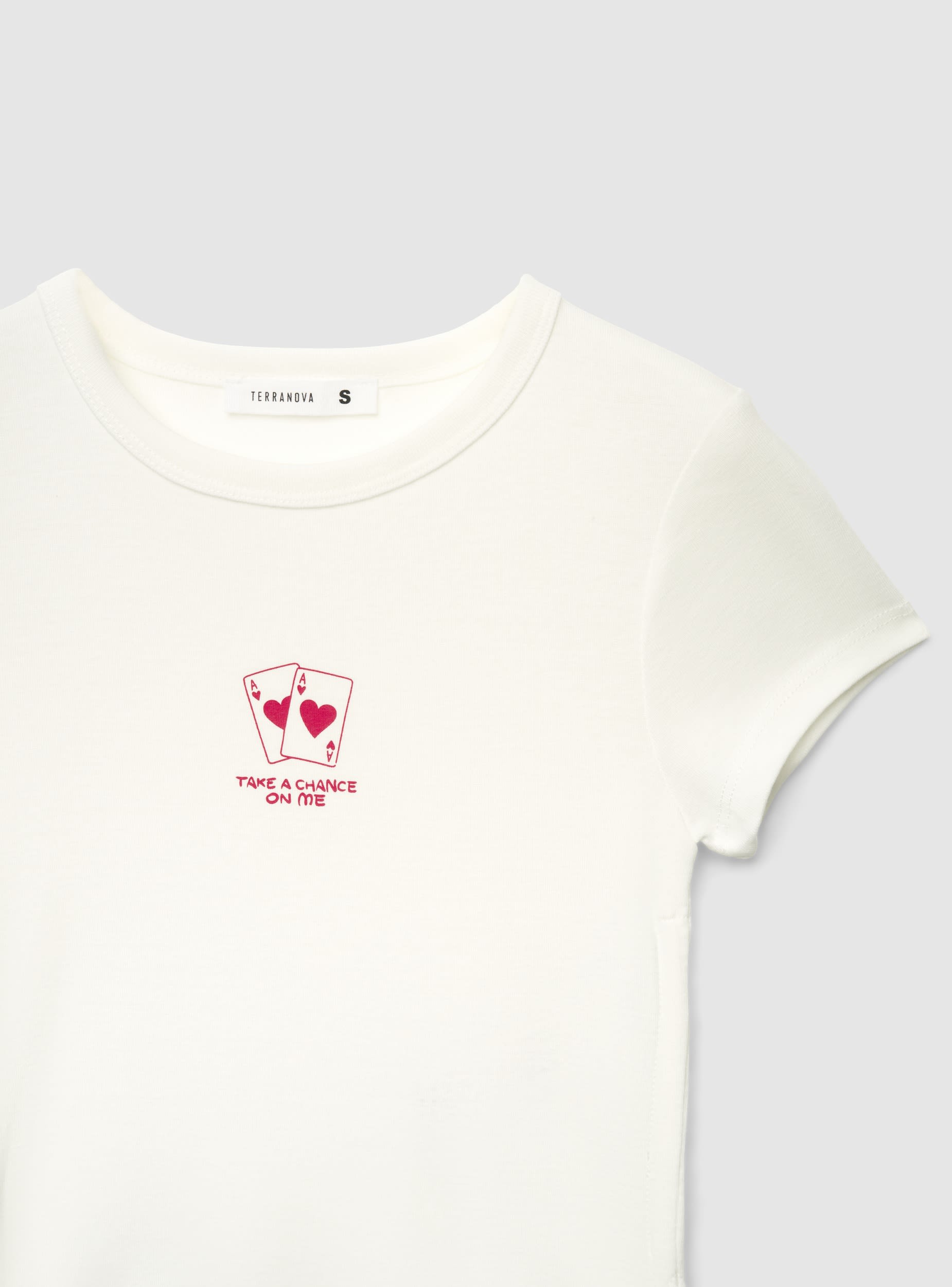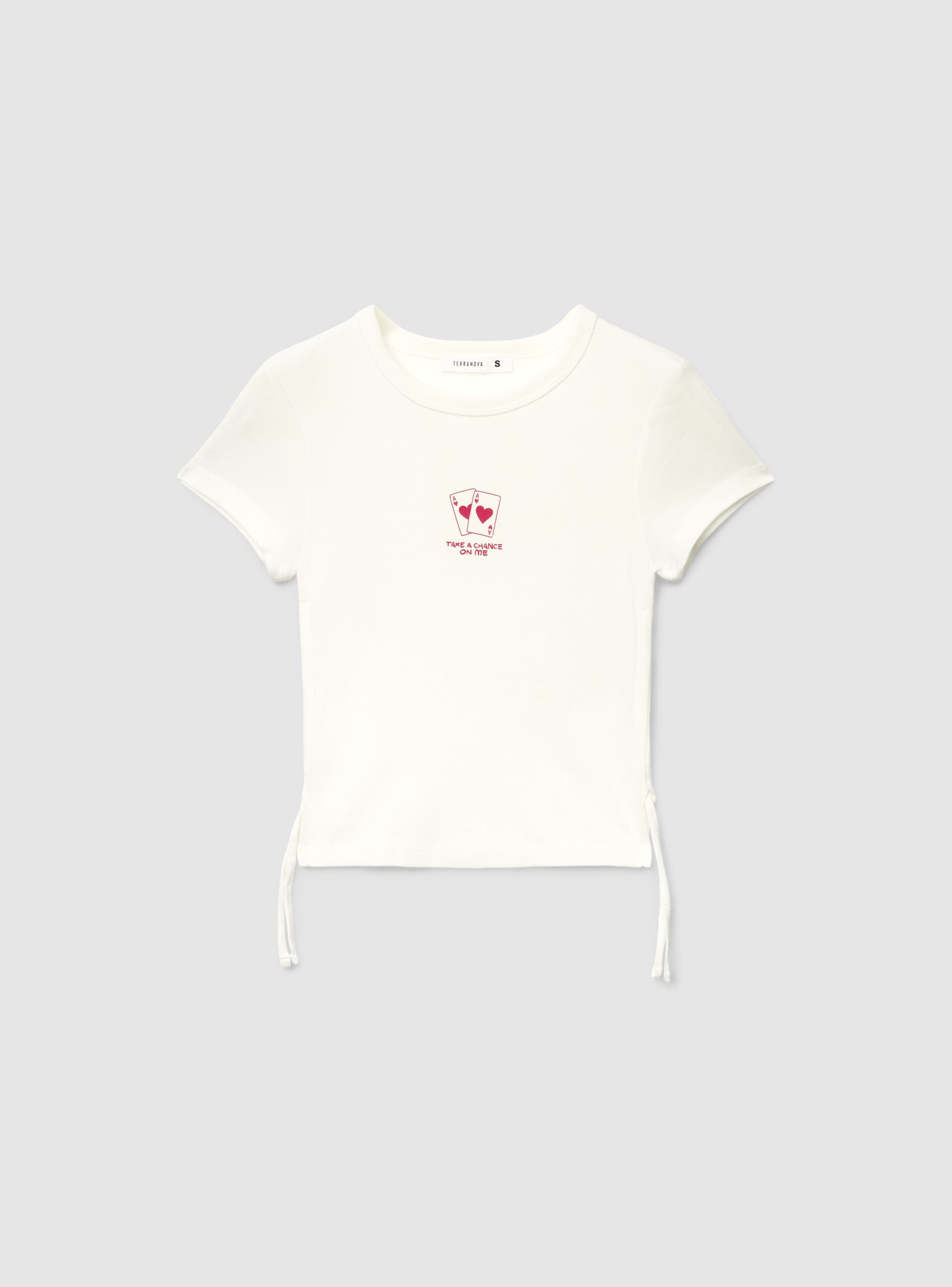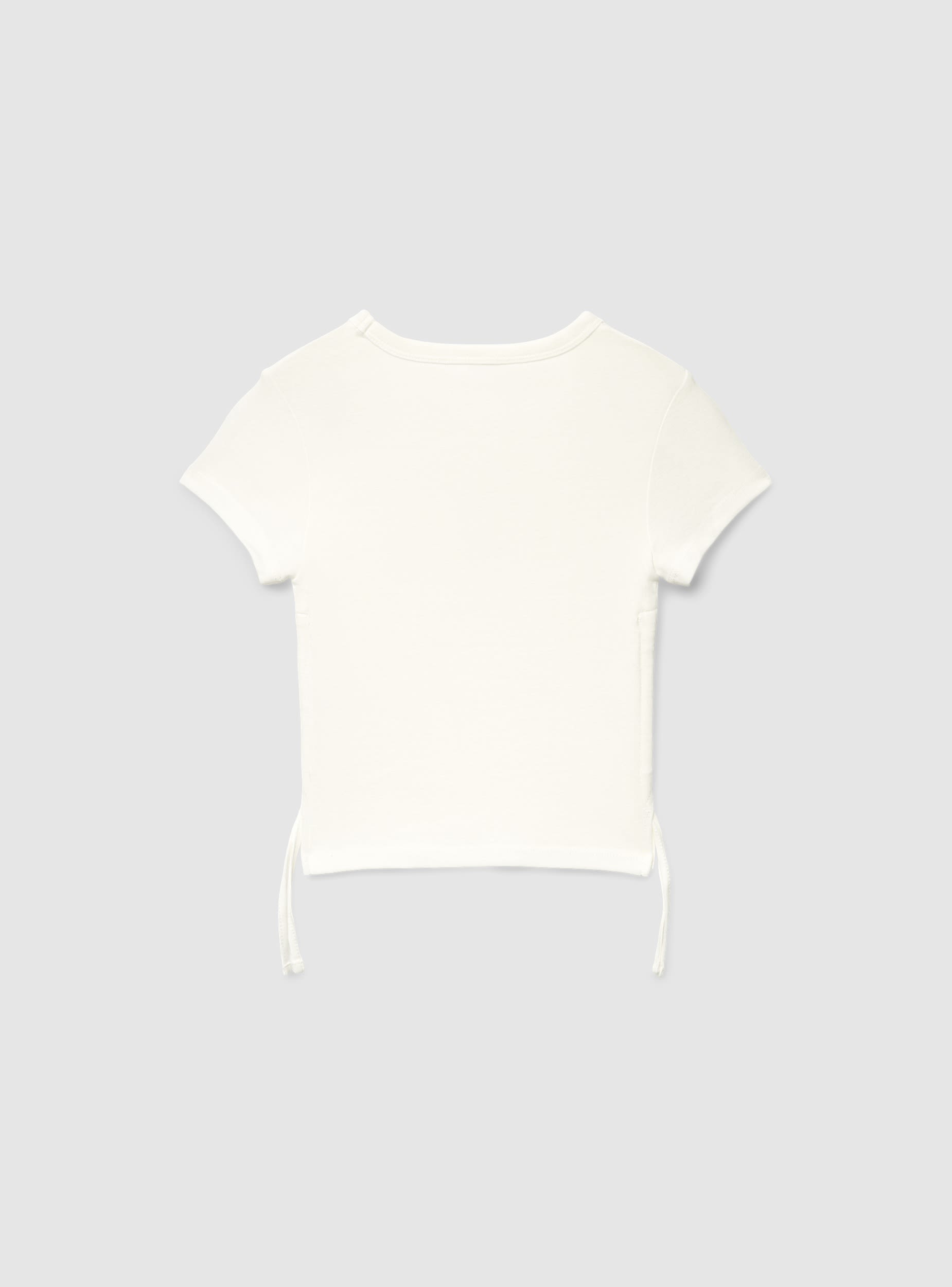 Maglietta da donna con vestibilità crop e stampa frontale. Girocollo e maniche corte. Presenta pratiche coulisse sui fianchi. Perfetta con jeans a vita alta o gonne e per look casual di tutti i giorni.Dettagli
