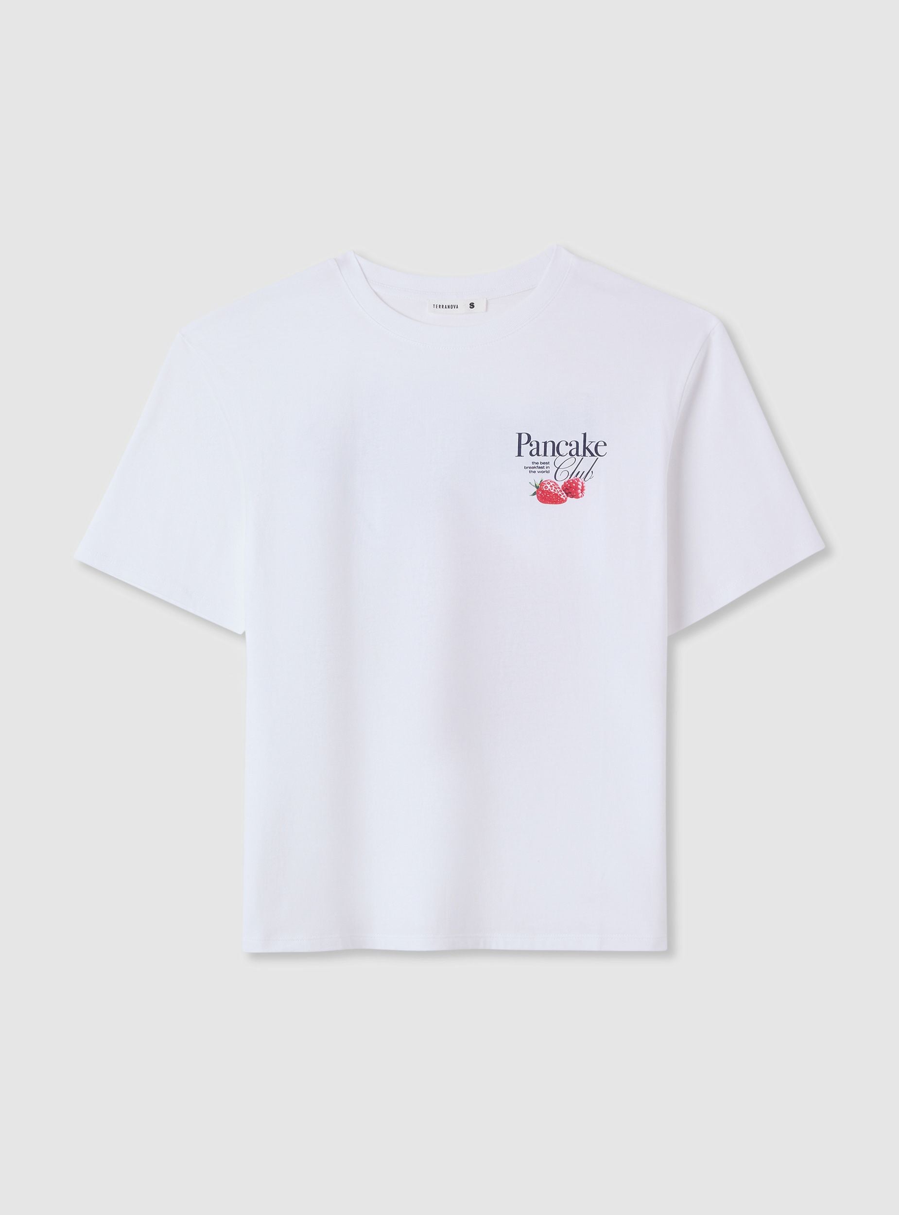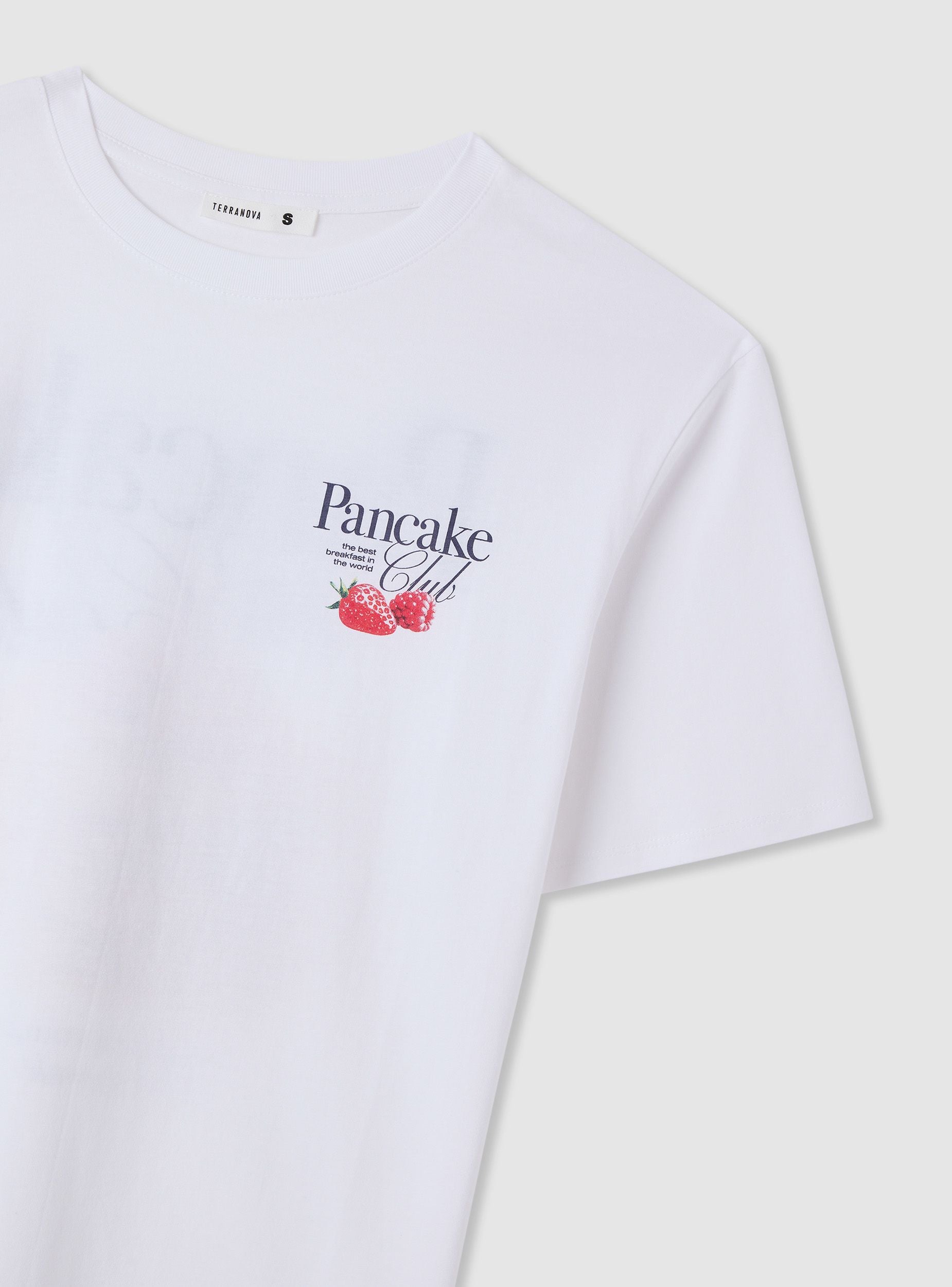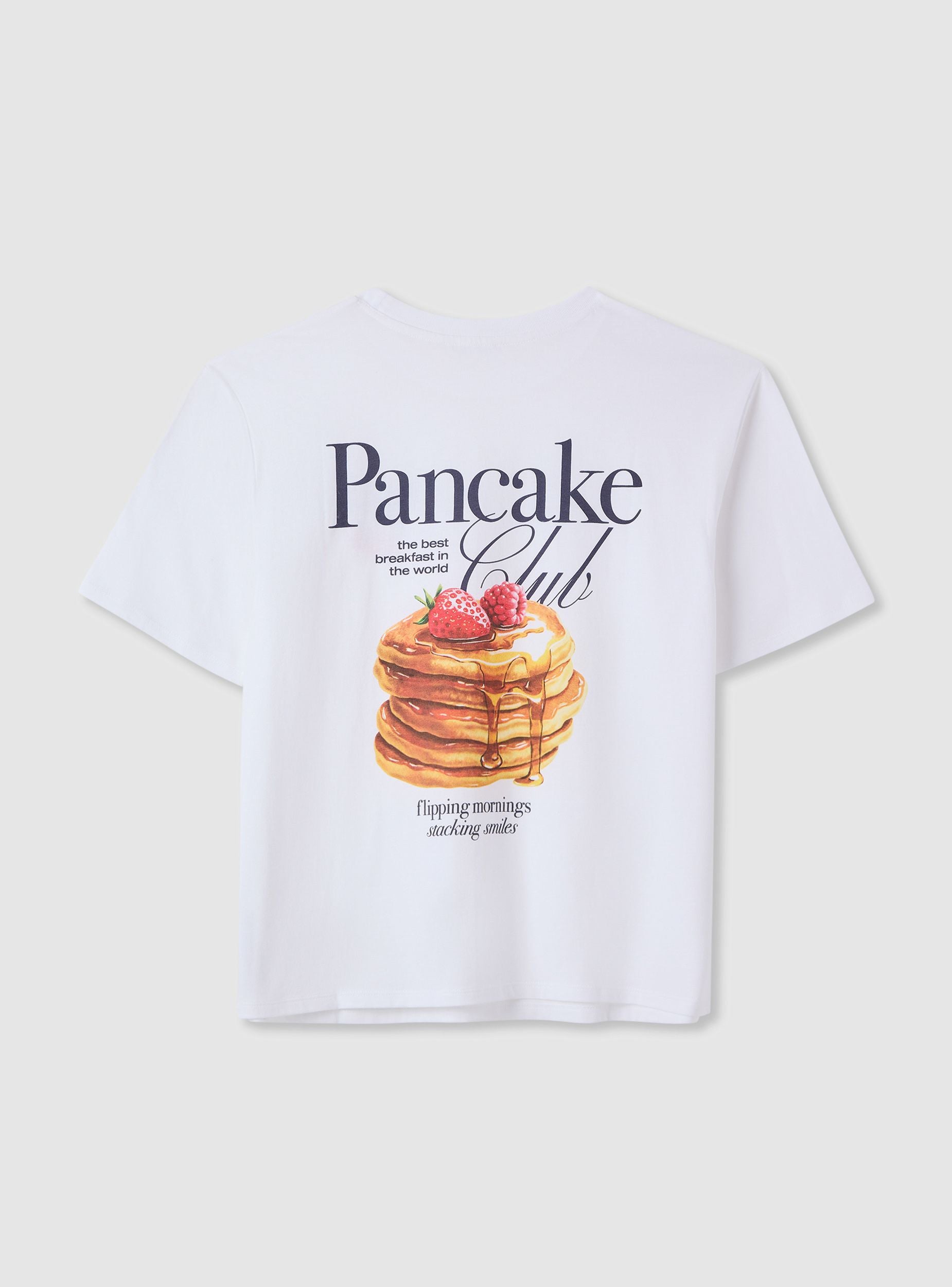 Maglietta da donna con vestibilità ampia e stampa. Modello girocollo con maniche corte, caratterizzato da grafica frontale e maxi stampa sul retro ispirata ai pancake. Perfetta per look casual con jeans, shorts o gonne a vita alta. Tessuto morbido e confortevole, ideale per il tempo libero e per aggiungere un tocco divertente agli outfit quotidiani.Dettagli