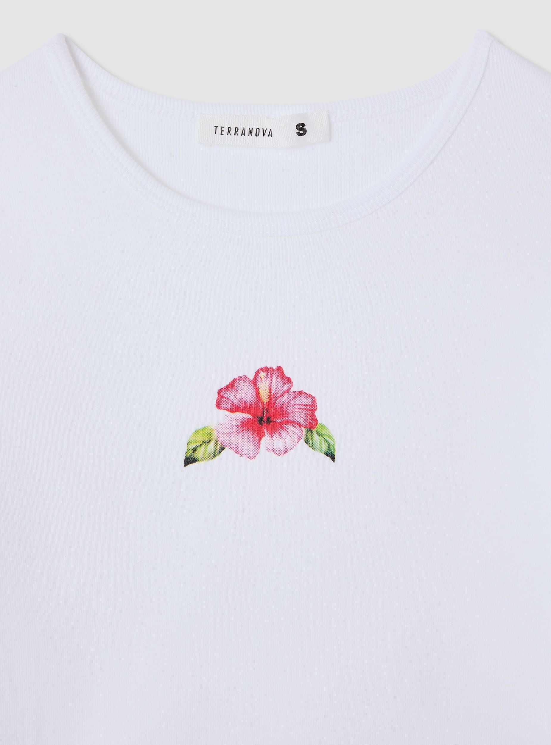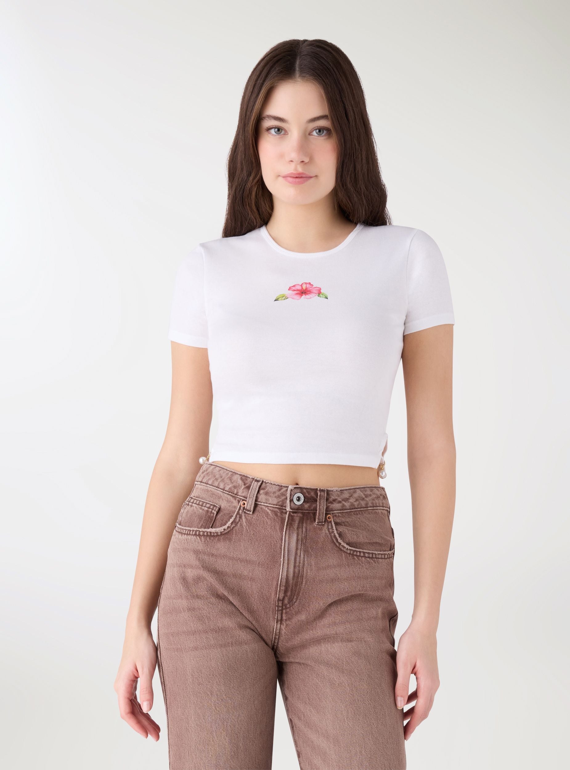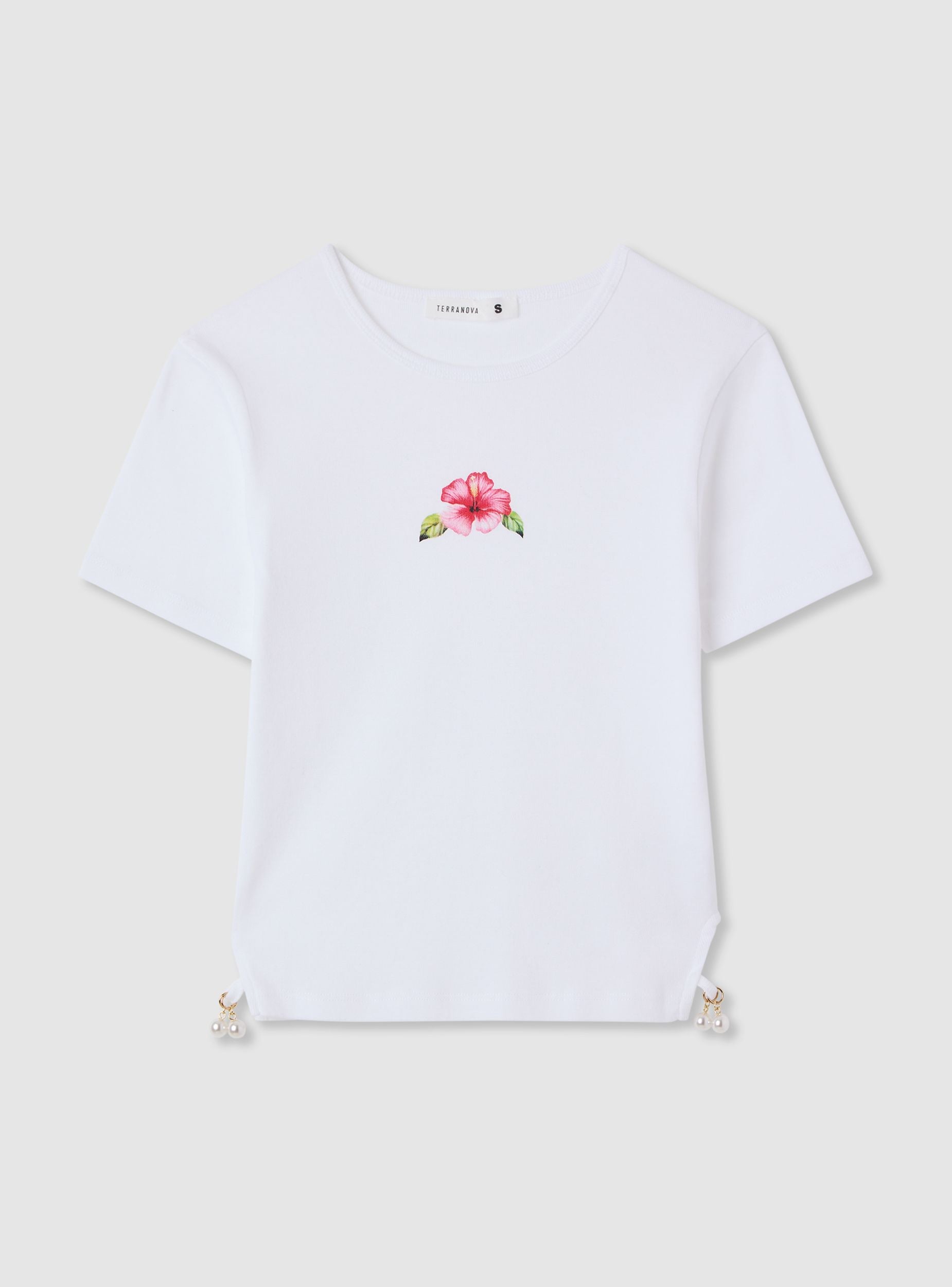 Maglietta da donna a maniche corte in tinta unita con vestibilità crop, decorata sul davanti da una piccola stampa di fiore. Girocollo e orlo con piccoli charm pendenti ai lati che aggiungono un tocco femminile. Facile da abbinare a jeans a vita alta o gonne, ideale per il tempo libero e look casual estivi. Stile essenziale con grafica discreta per outfit versatili.Dettagli