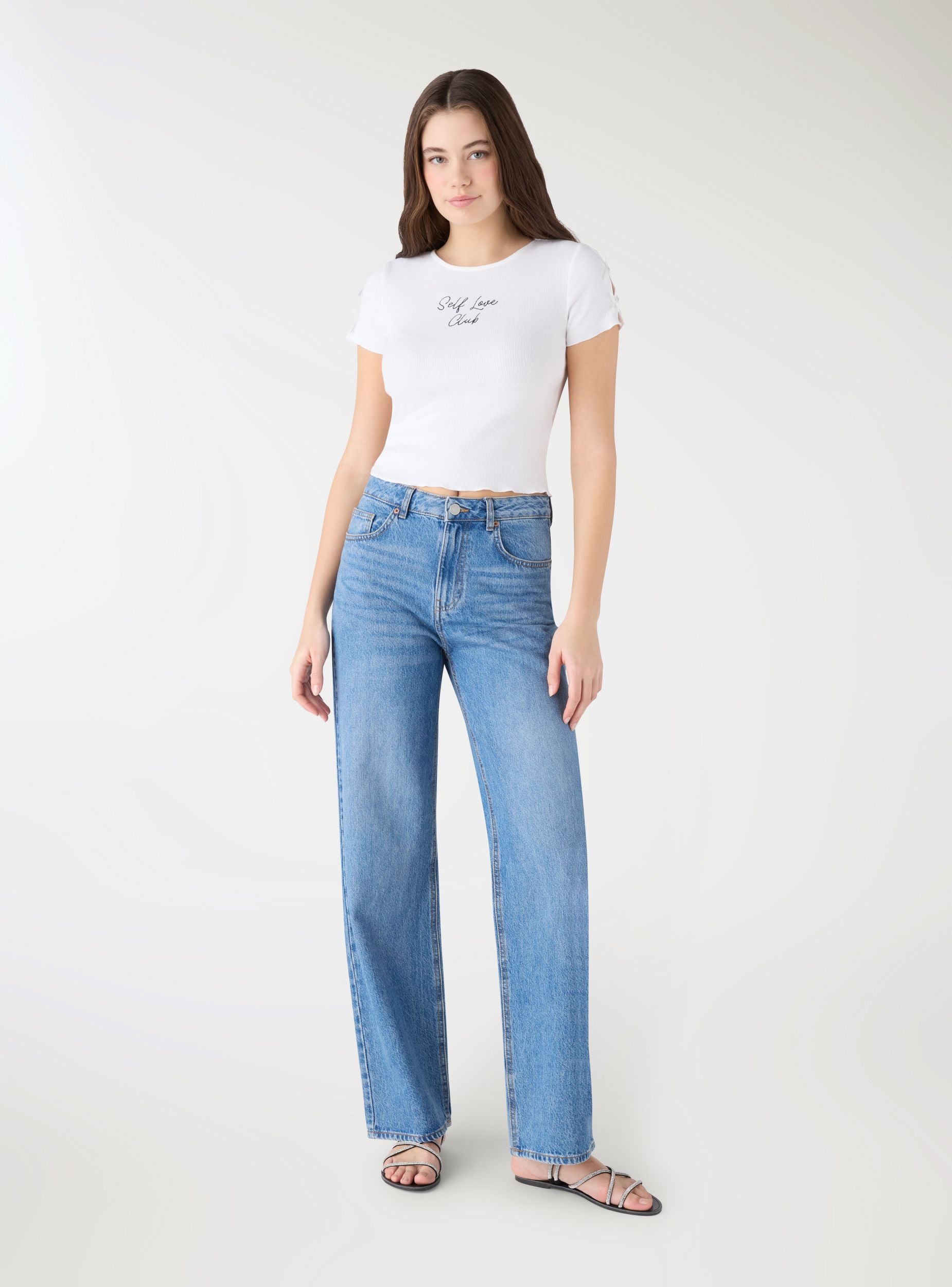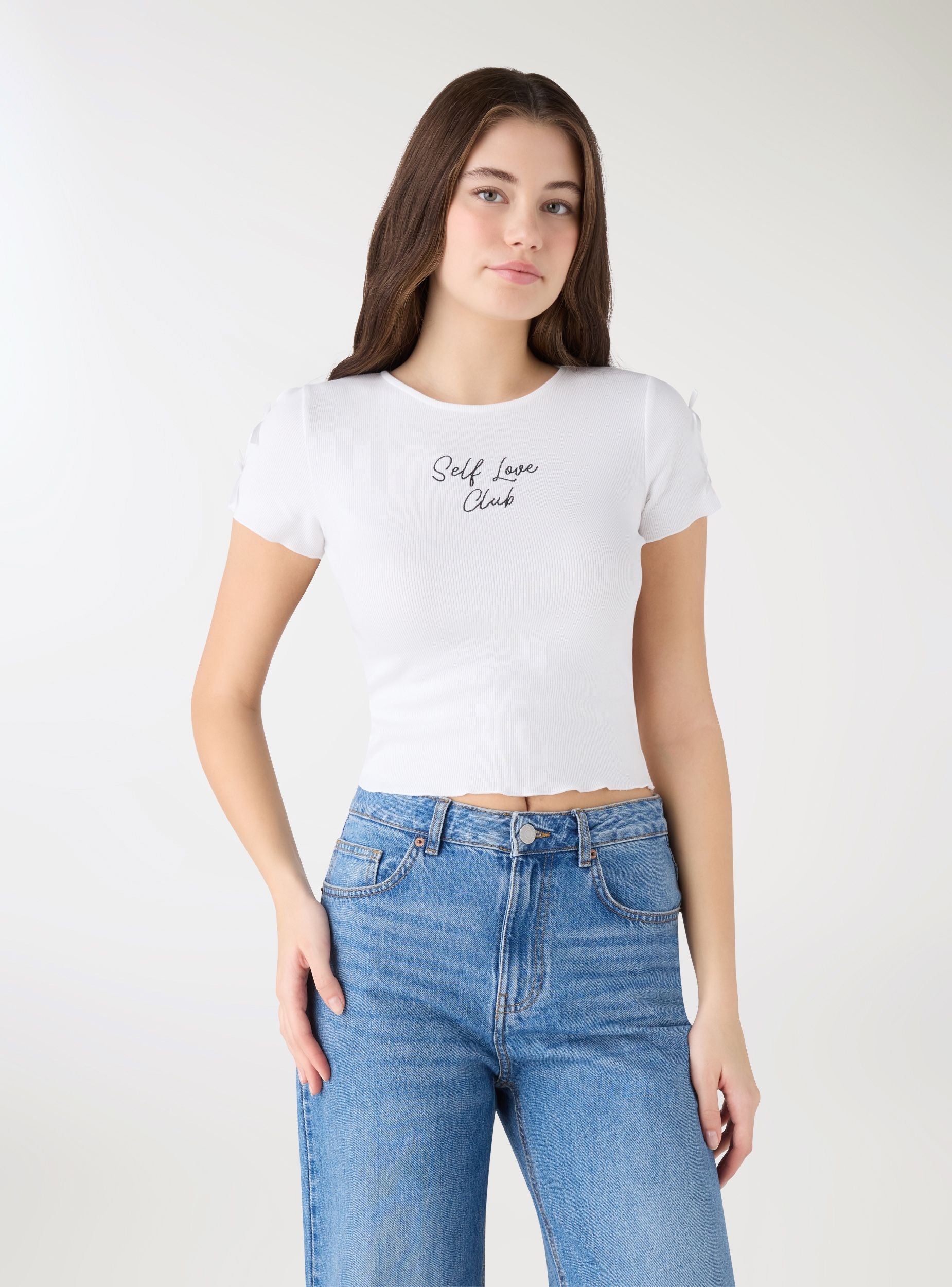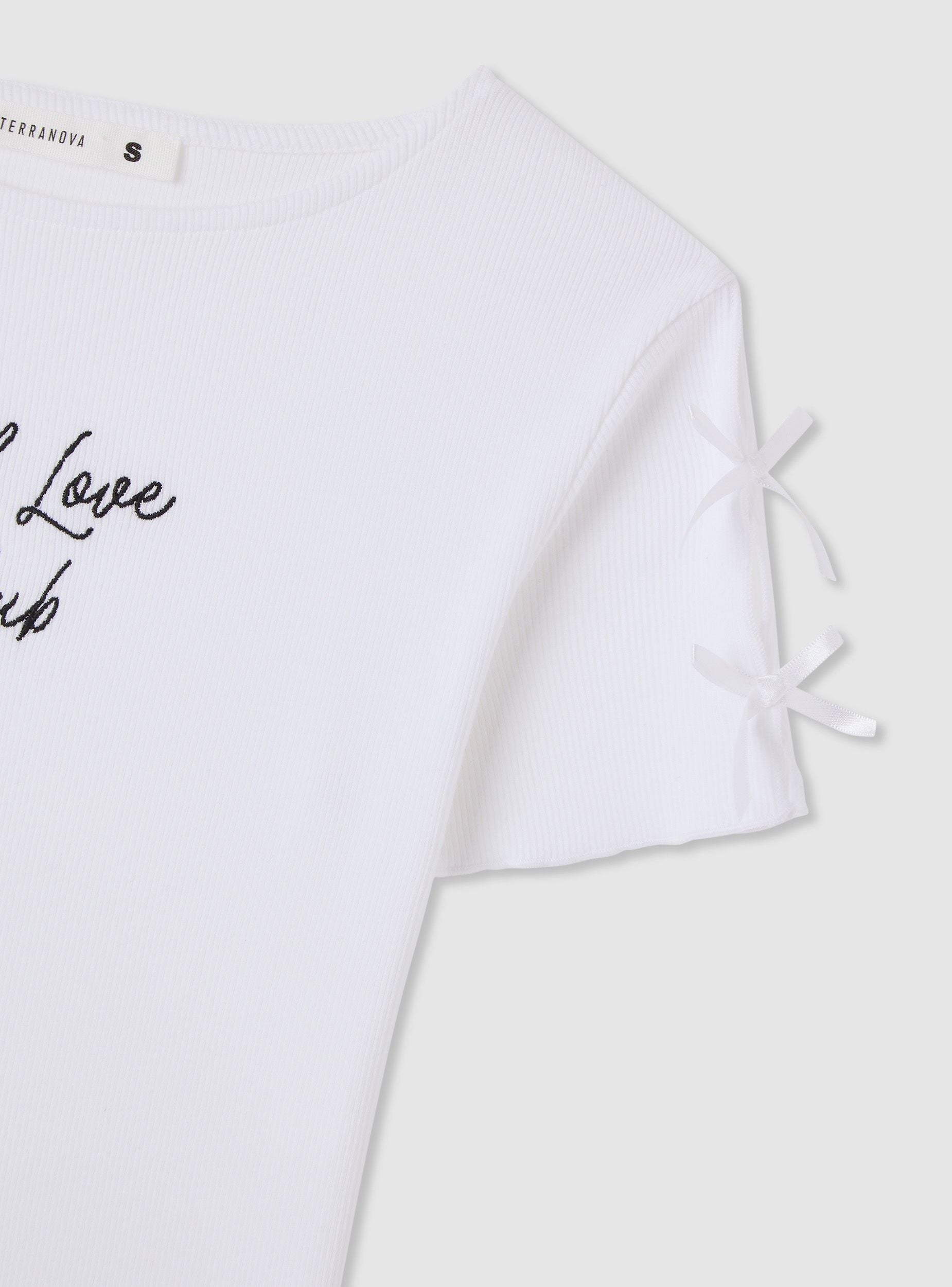 Maglietta da donna con vestibilità crop e scritta ricamata sul davanti. Girocollo e maniche corte con piccoli fiocchi applicati che aggiungono un tocco femminile. Ideale per look casual e trendy con jeans o gonne a vita alta. Perfetta per il tempo libero e per creare outfit urbani dal carattere deciso.Dettagli