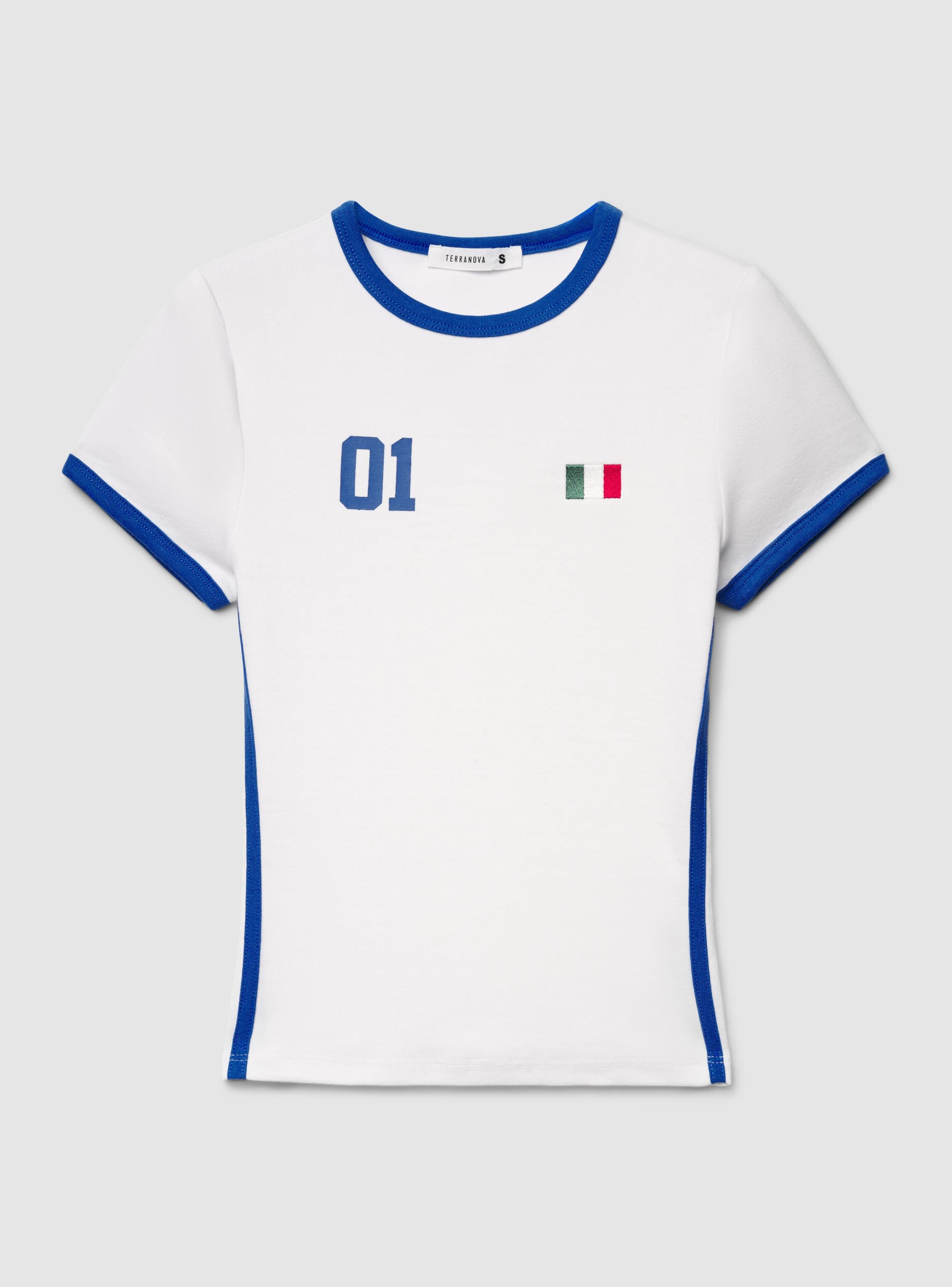 Maglietta da donna con vestibilità crop e fantasia con scritta, ispirata al calcio. Girocollo e maniche corte con bordi a contrasto, piccola bandiera ricamata sul petto e numero stampato. Perfetta per il tempo libero o per tifare, si abbina a jeans, shorts o una gonna sportiva.Dettagli