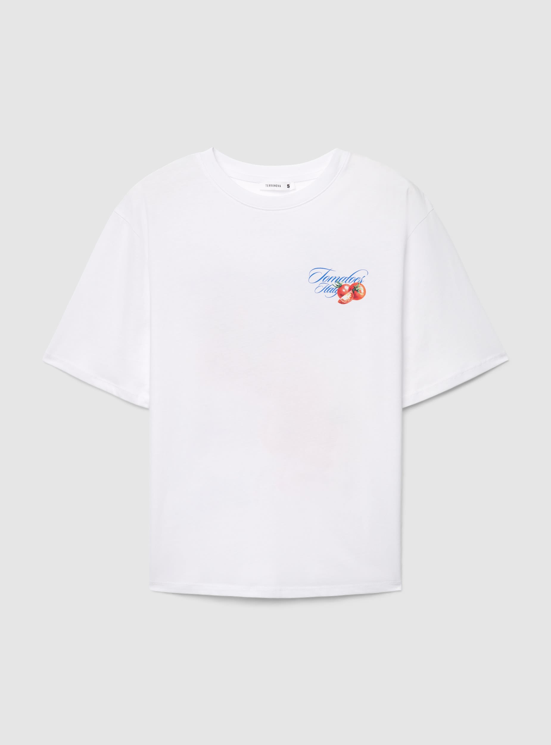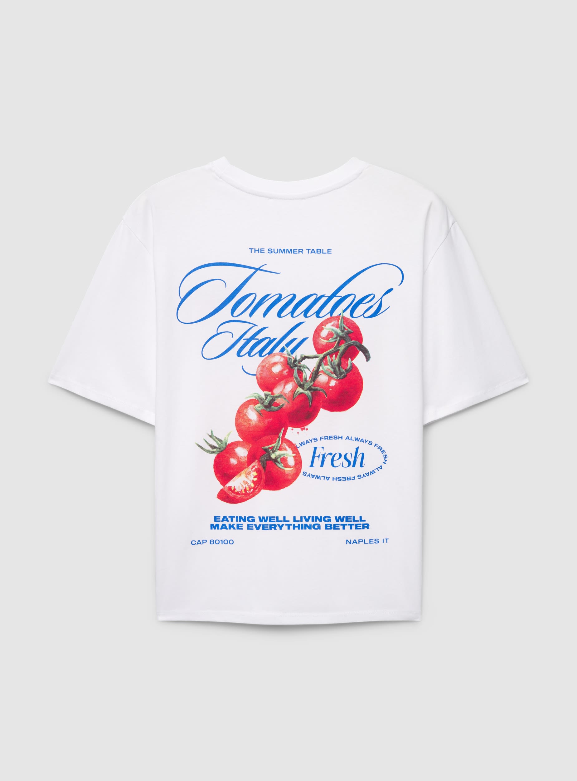 Maglietta da donna a maniche corte con vestibilità ampia. Presenta girocollo e grafica stampata con pomodori e scritte sul fronte e sul retro, ideale per look casual e urban. Perfetta con jeans o pantaloncini per il tempo libero.Dettagli