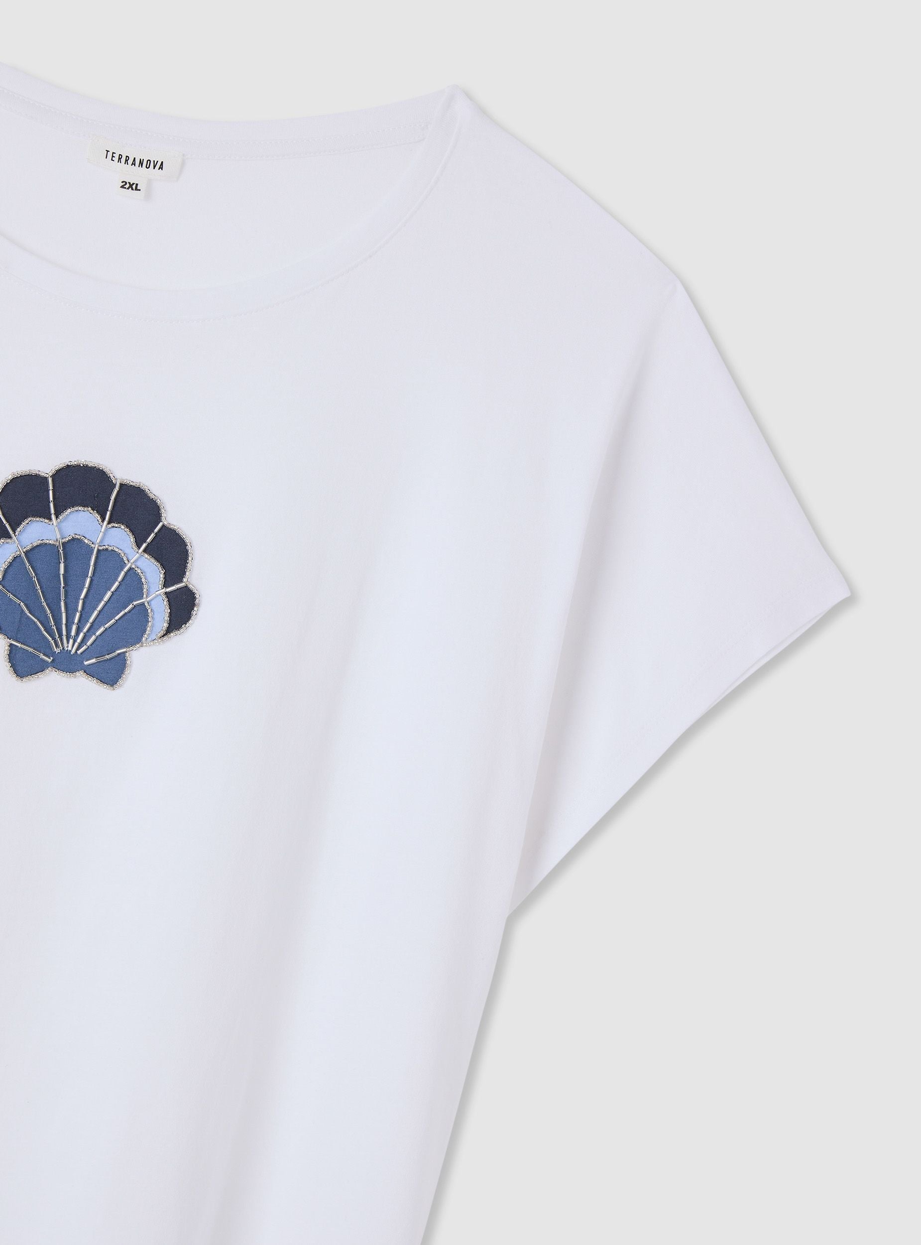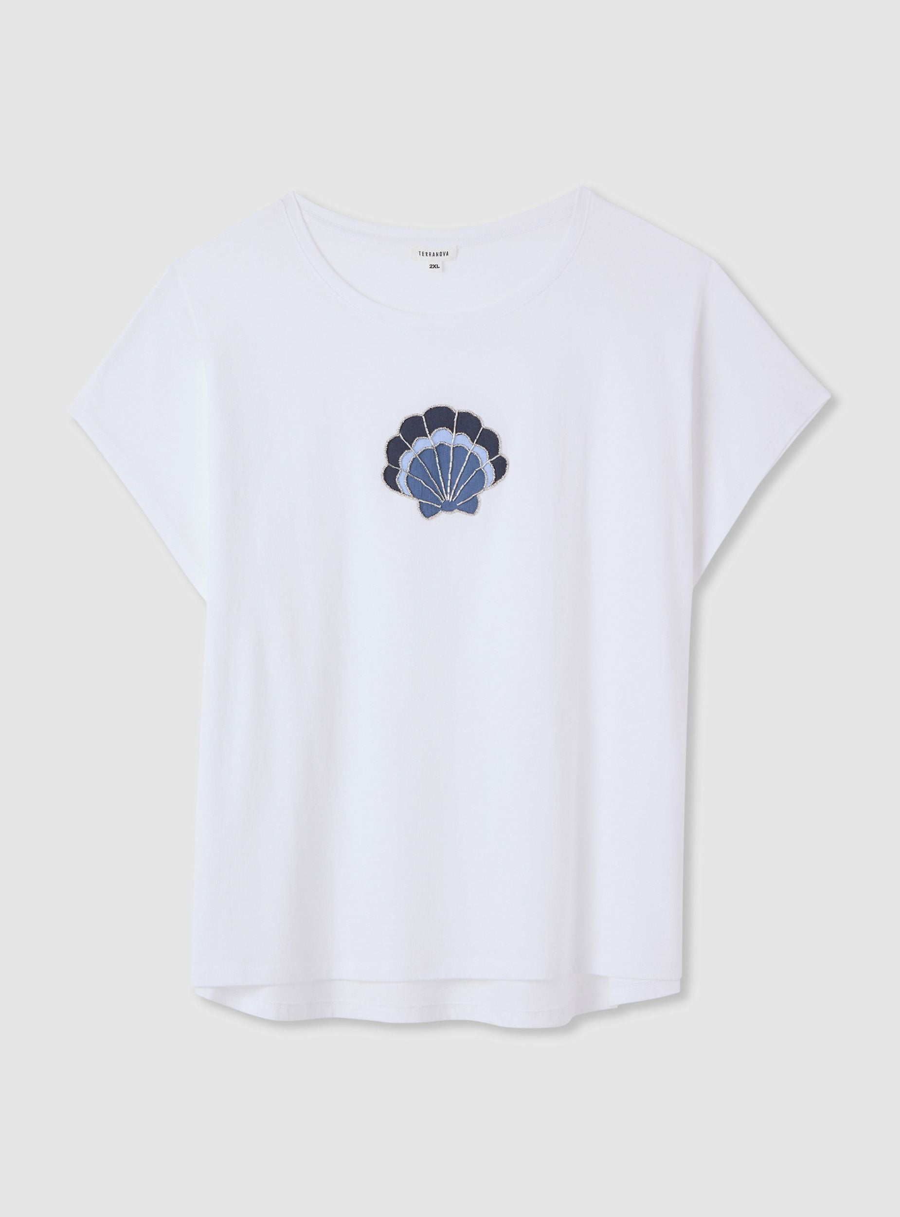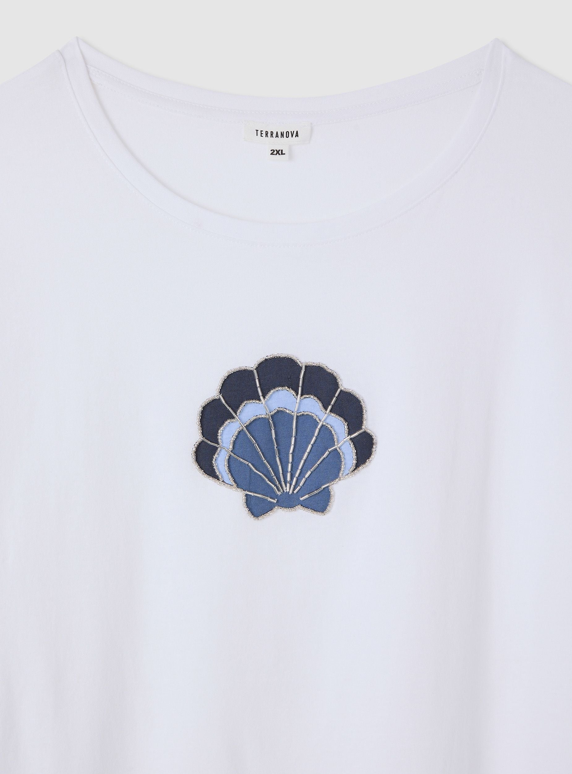 Maglietta da donna con vestibilità ampia e maniche corte a spalla scesa. Collo rotondo e ricamo frontale a tema marino con conchiglie e stella marina che aggiunge un tocco estivo. Facile da abbinare a jeans o gonne per look casual da giorno, perfetta anche con shorts e sandali per il tempo libero. Tessuto a tinta unita con ricamo in evidenza, ideale per rinnovare outfit quotidiani con un dettaglio femminile.Dettagli