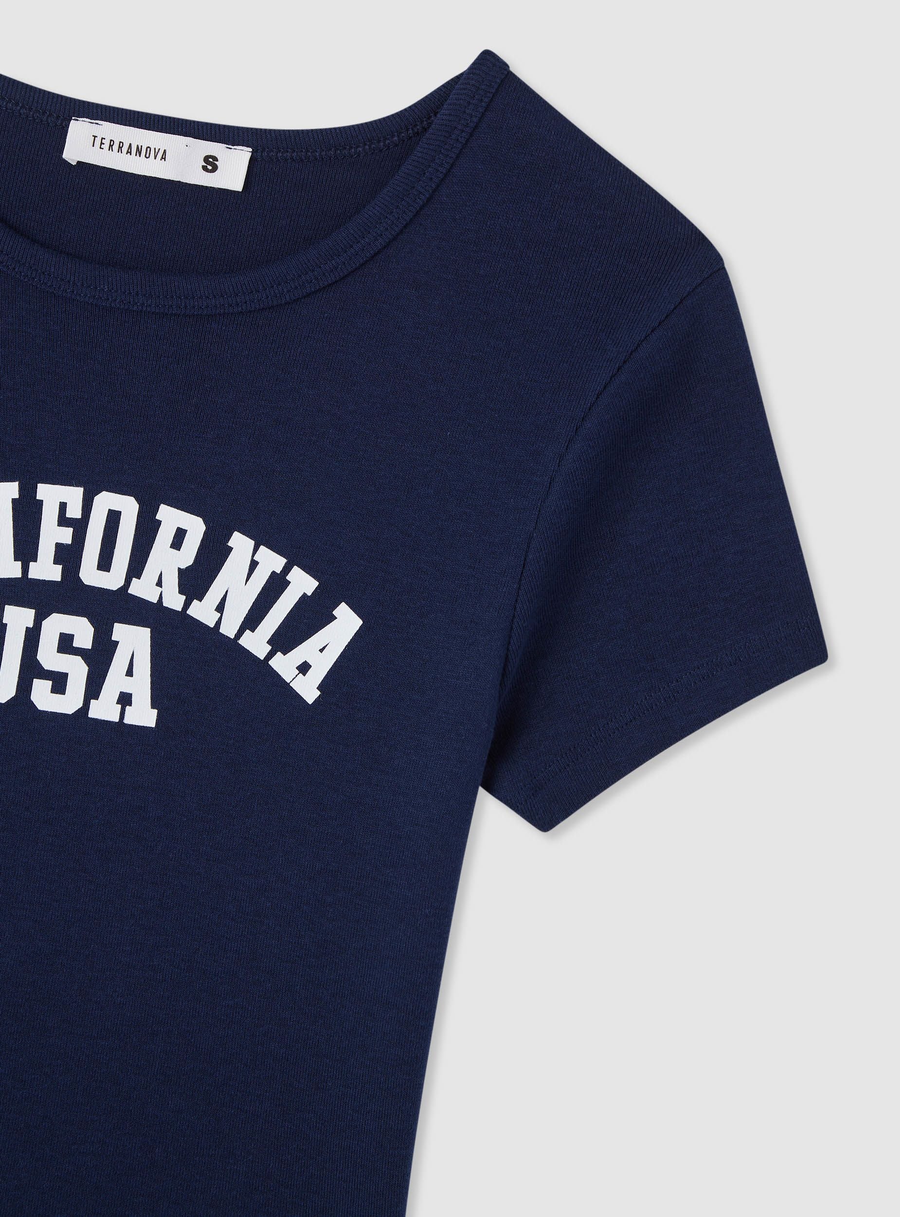 Maglietta da donna a tinta unita con scritta in stile college. Modello crop con maniche corte e girocollo, ideale per look urban con jeans a vita alta o gonne e sneakers. La vestibilità segue il taglio corto per valorizzare la silhouette. Perfetta per il tempo libero e abbinamenti a strati con overshirt o cardigan, il design essenziale aggiunge carattere grazie alla stampa frontale.Dettagli