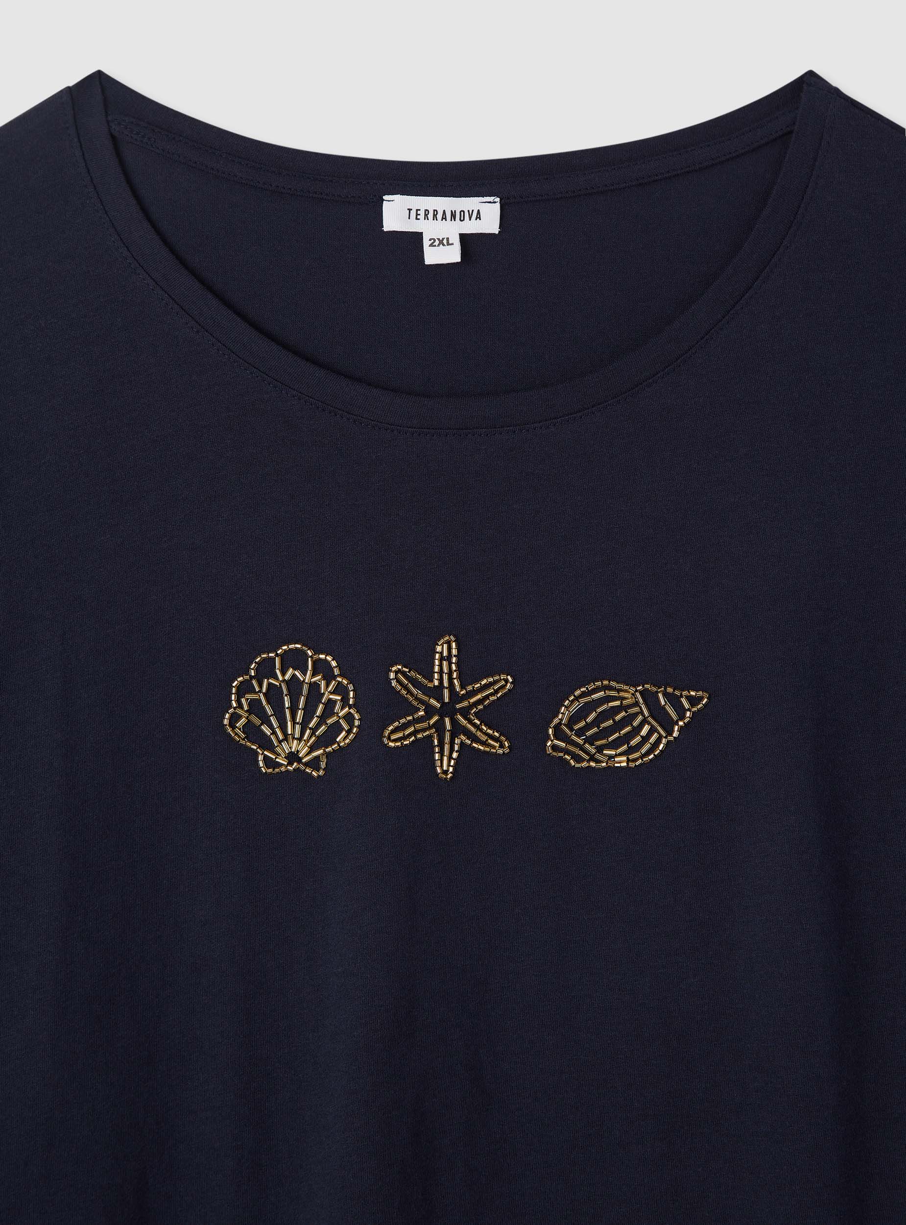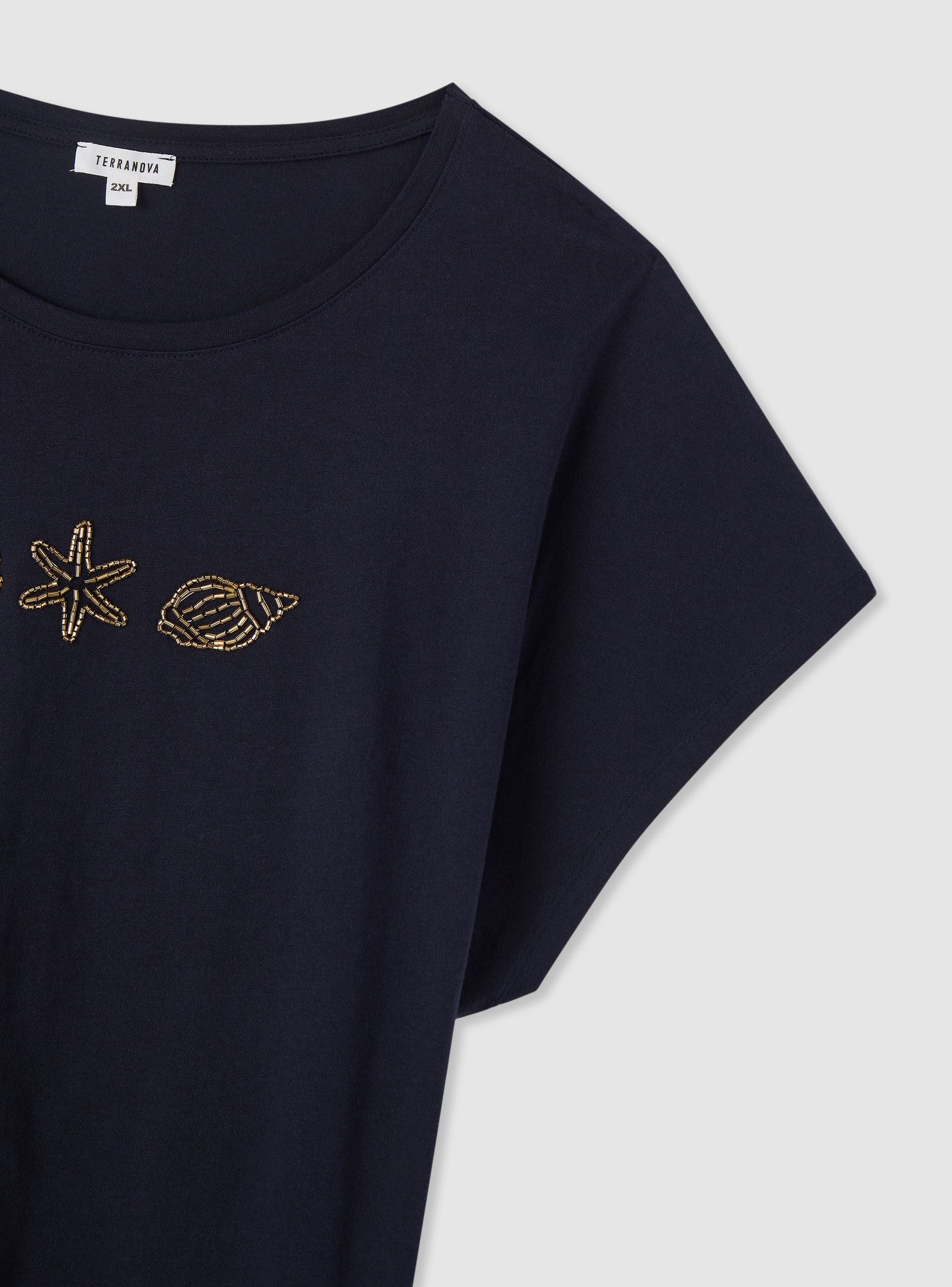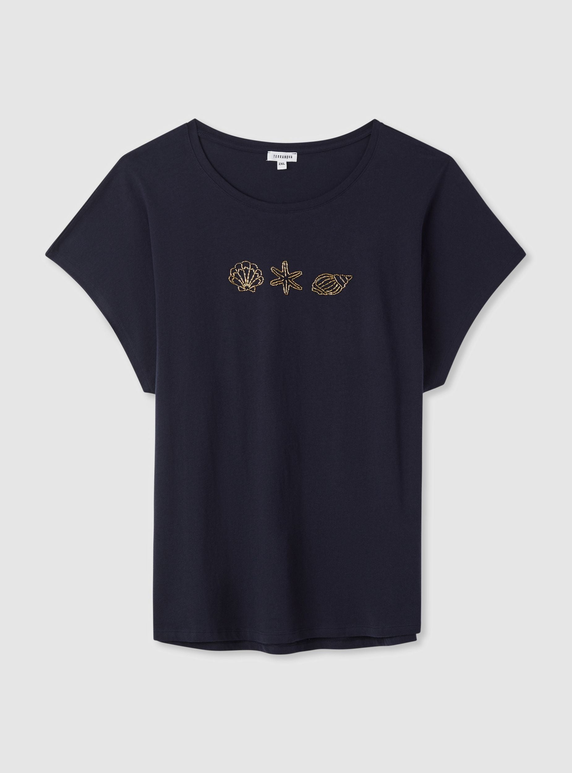Maglietta da donna con vestibilità ampia e maniche corte a spalla scesa. Collo rotondo e ricamo frontale a tema marino con conchiglie e stella marina che aggiunge un tocco estivo. Facile da abbinare a jeans o gonne per look casual da giorno, perfetta anche con shorts e sandali per il tempo libero. Tessuto a tinta unita con ricamo in evidenza, ideale per rinnovare outfit quotidiani con un dettaglio femminile.Dettagli
