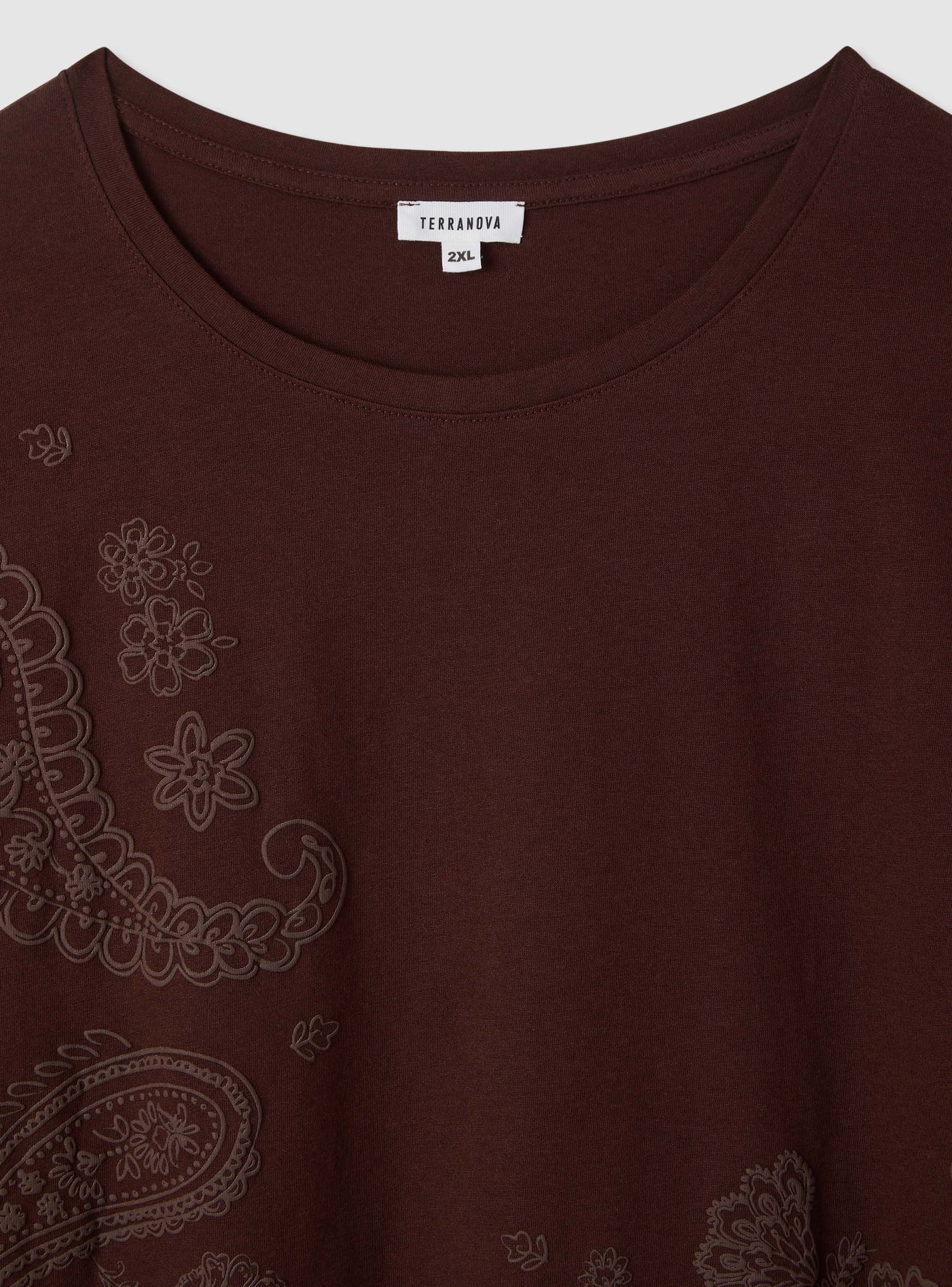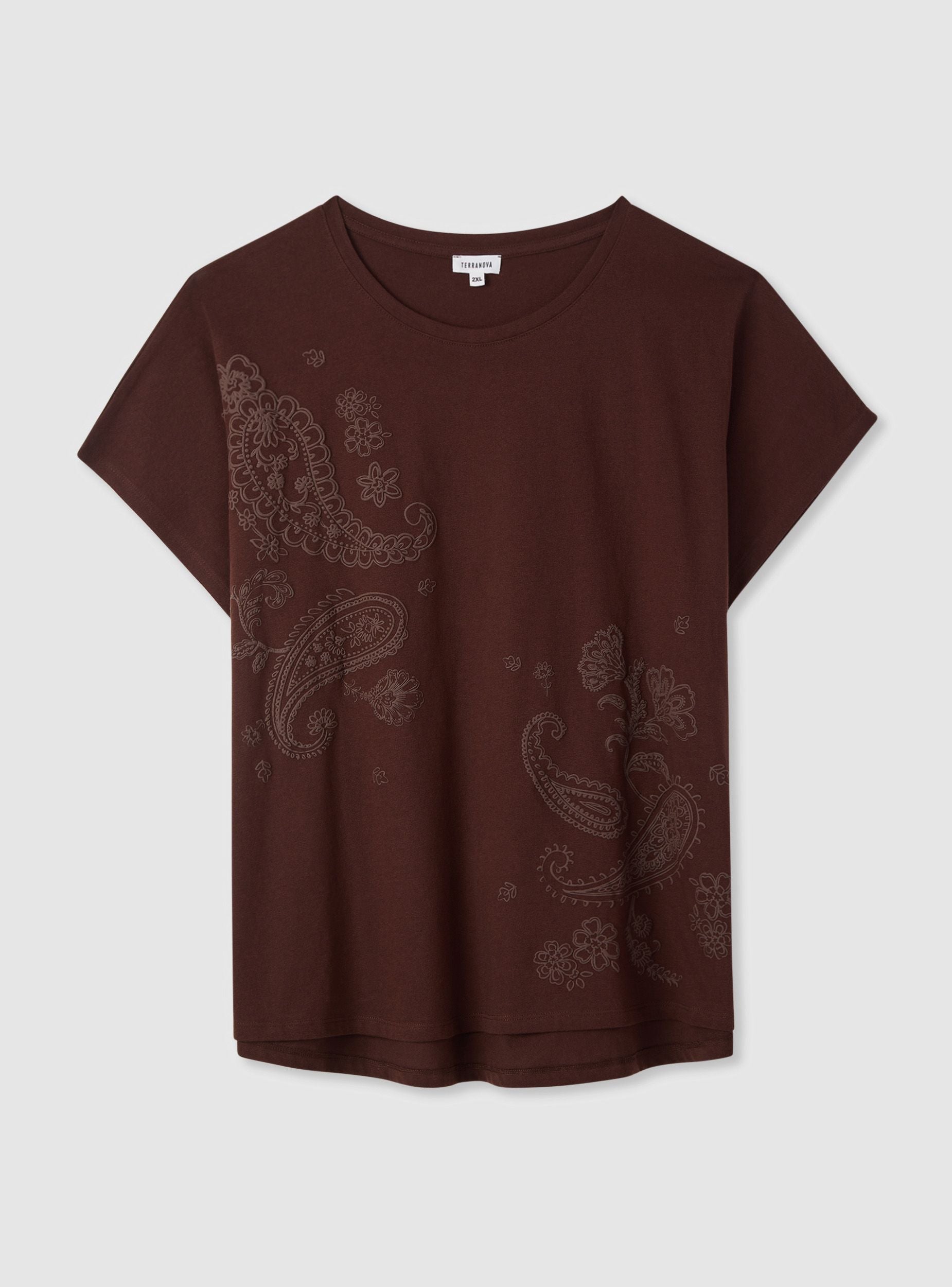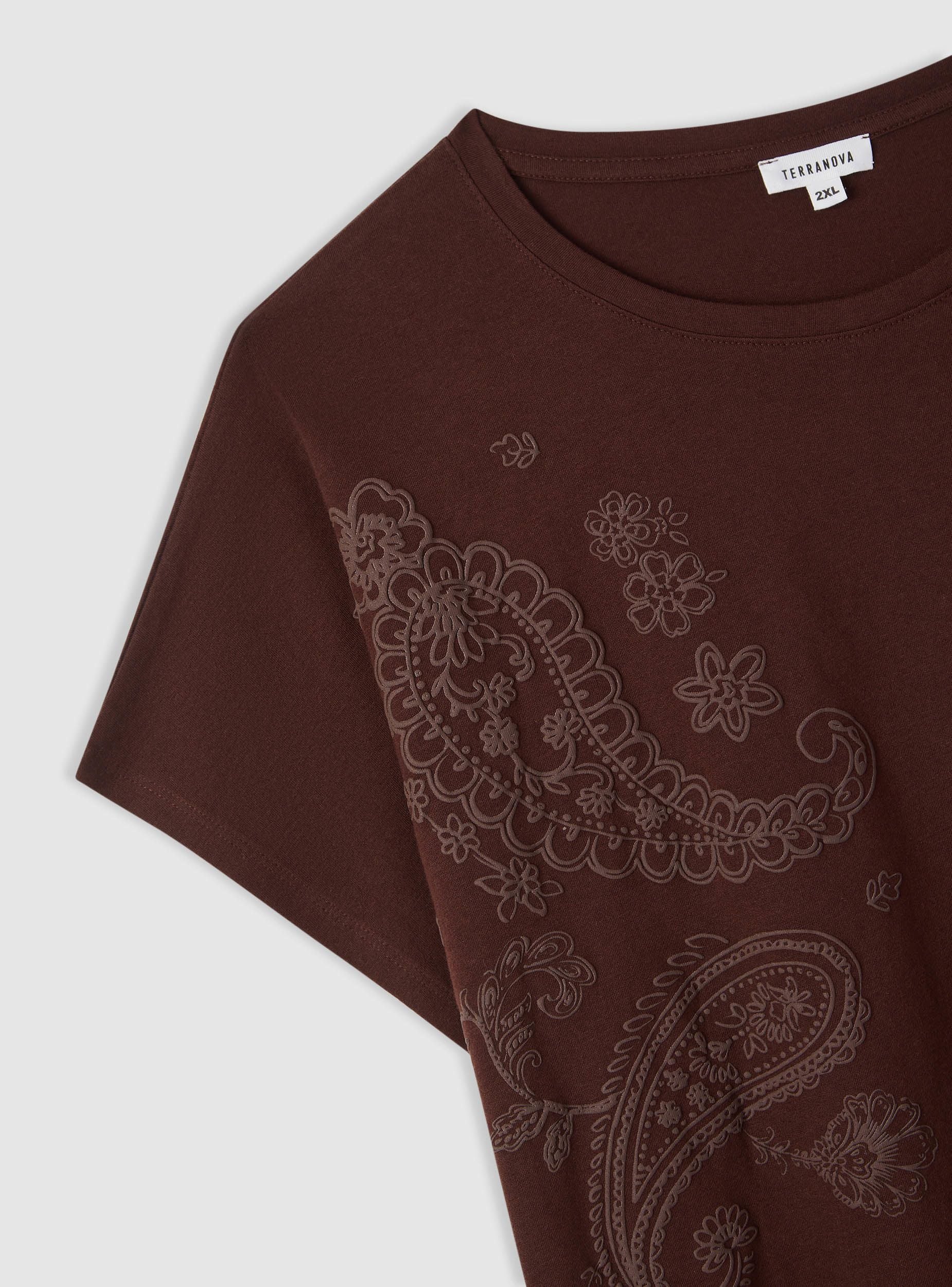 Maglietta da donna a maniche corte con stampa in rilievo dal motivo paisley all over, ideale per look casual e urban. Collo tondo e spalla leggermente scesa per una vestibilità comoda che cade dritta sui fianchi. Perfetta con jeans o pantaloni fluidi, si indossa sotto blazer leggeri o cardigan per completare l’outfit. Modello a tinta unita con grafica tono su tono che aggiunge carattere senza eccessi.Dettagli
