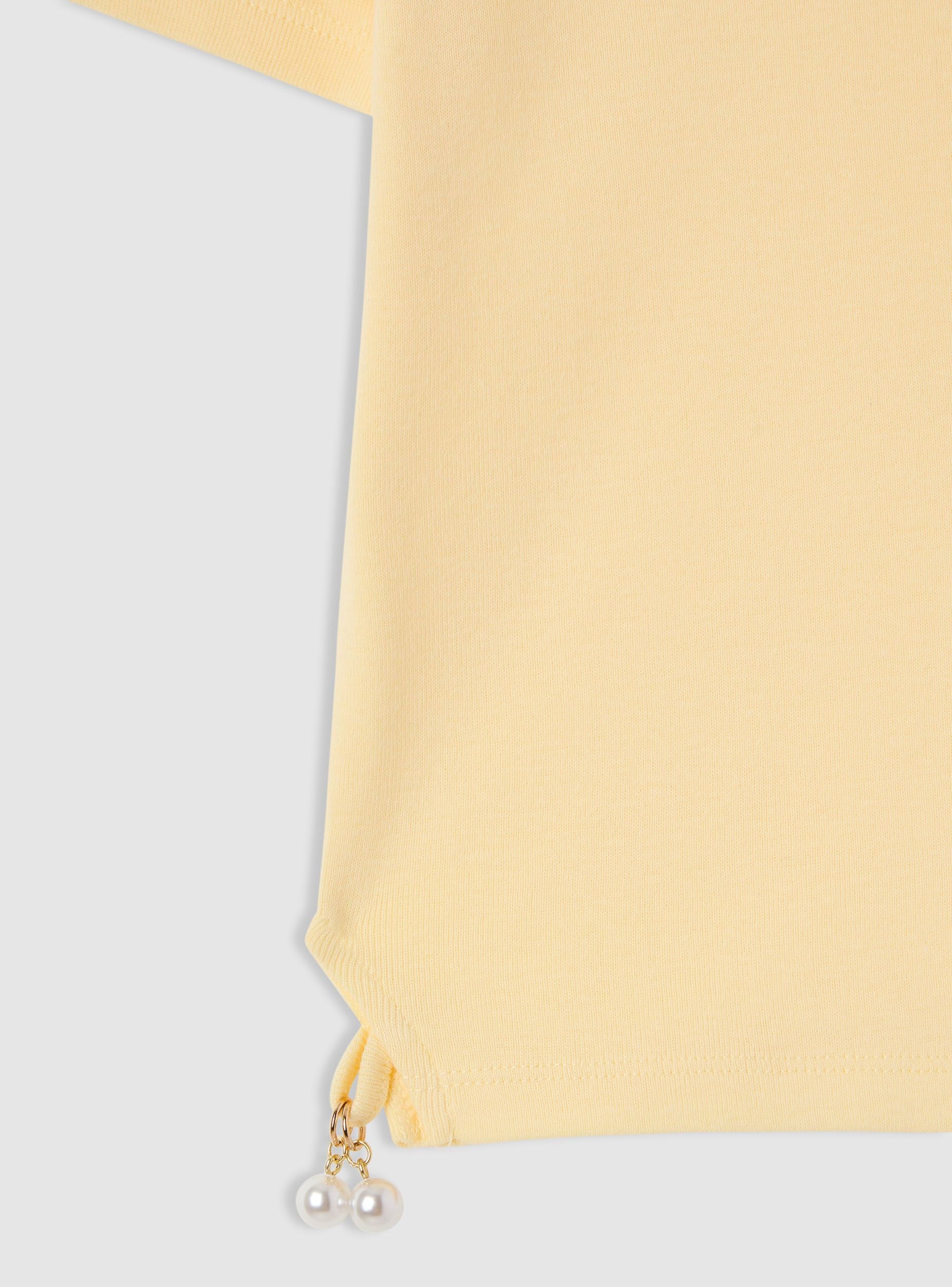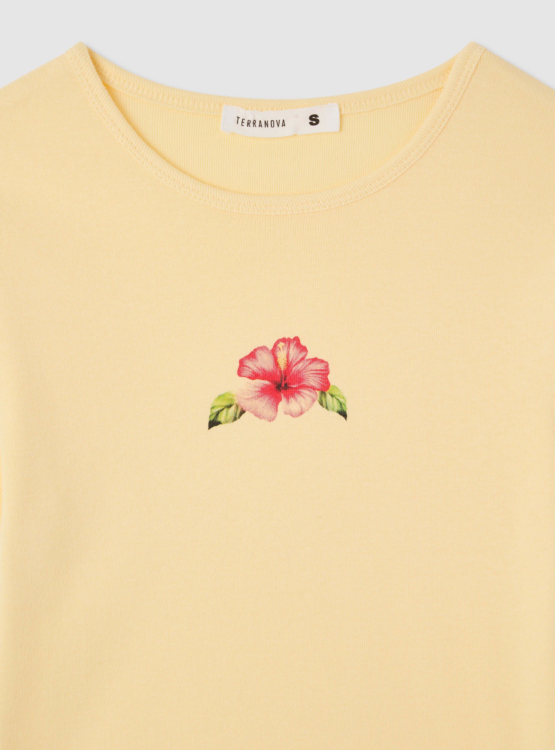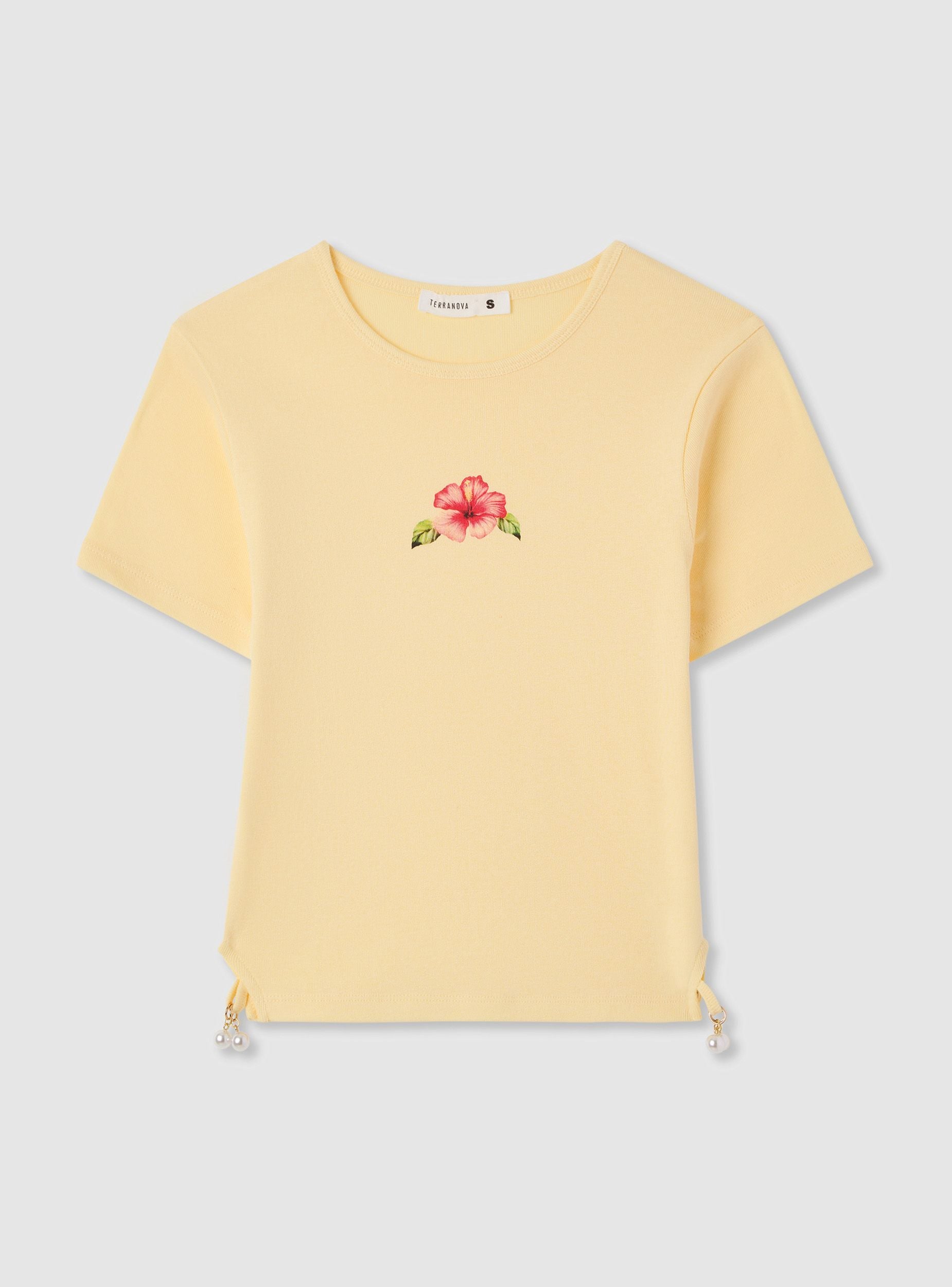 Maglietta da donna crop con girocollo e maniche corte, pensata per look estivi e street. La stampa hibiscus al centro aggiunge un tocco tropicale, mentre i piccoli cut-out ai lati del fondo con charm pendenti effetto perla valorizzano la linea. Perfetta con jeans a vita alta o gonne, per uscite informali e weekend.Dettagli