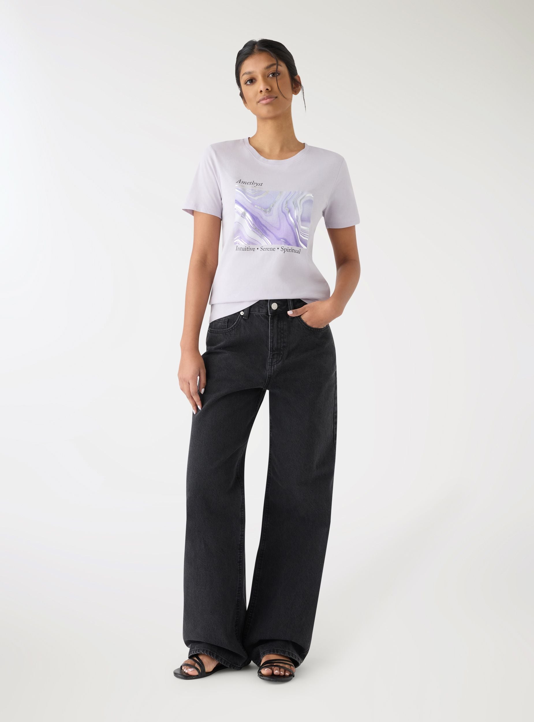Maglietta da donna con stampa frontale a tema minerale e dettagli con effetto luccicante. Girocollo, maniche corte e vestibilità regular perfetta per il tempo libero. Facile da abbinare a jeans o gonne per un look casual, si indossa sotto giacche leggere o felpe senza zip. Il design pulito esalta la grafica con scritta, rendendola ideale per outfit quotidiani.Dettagli