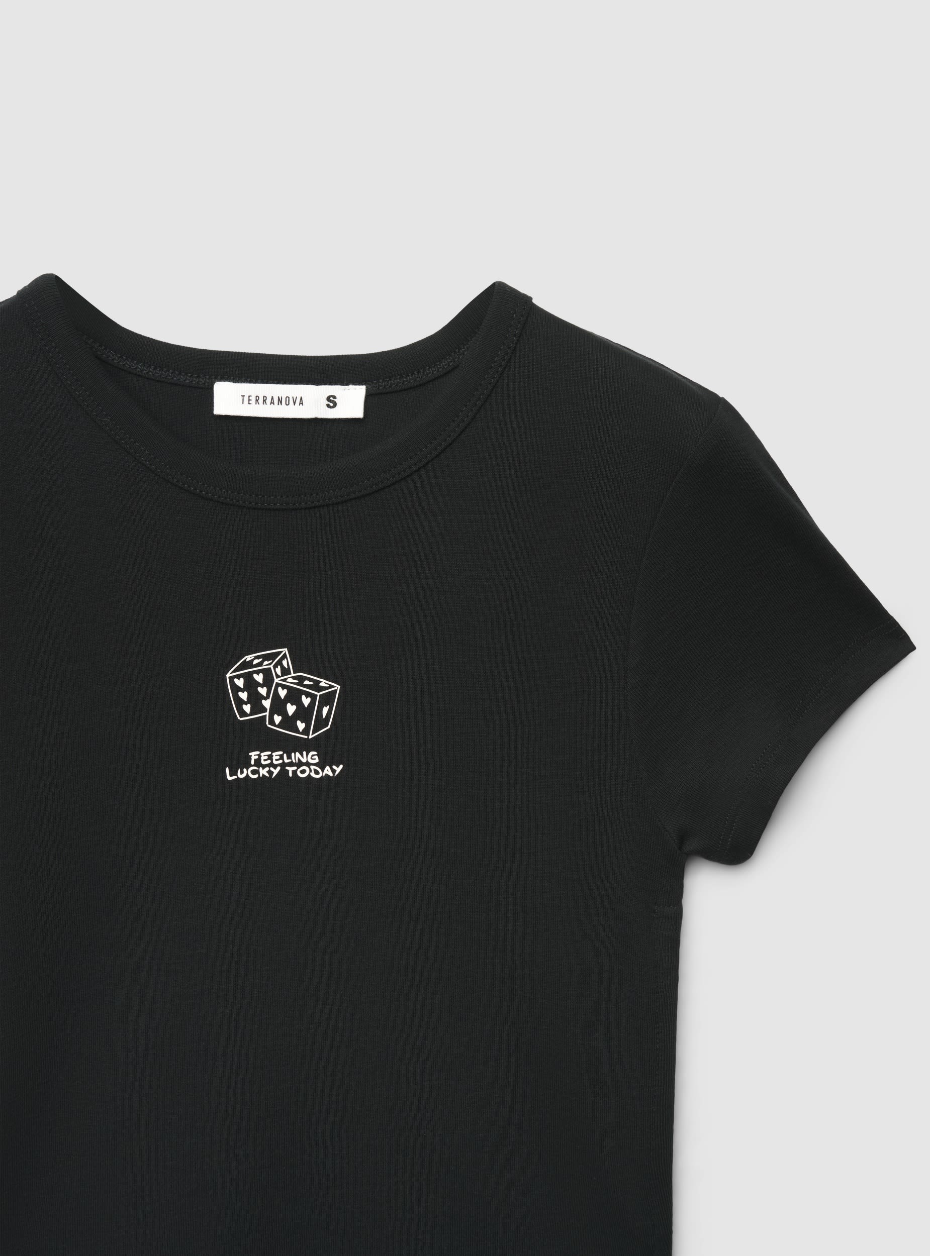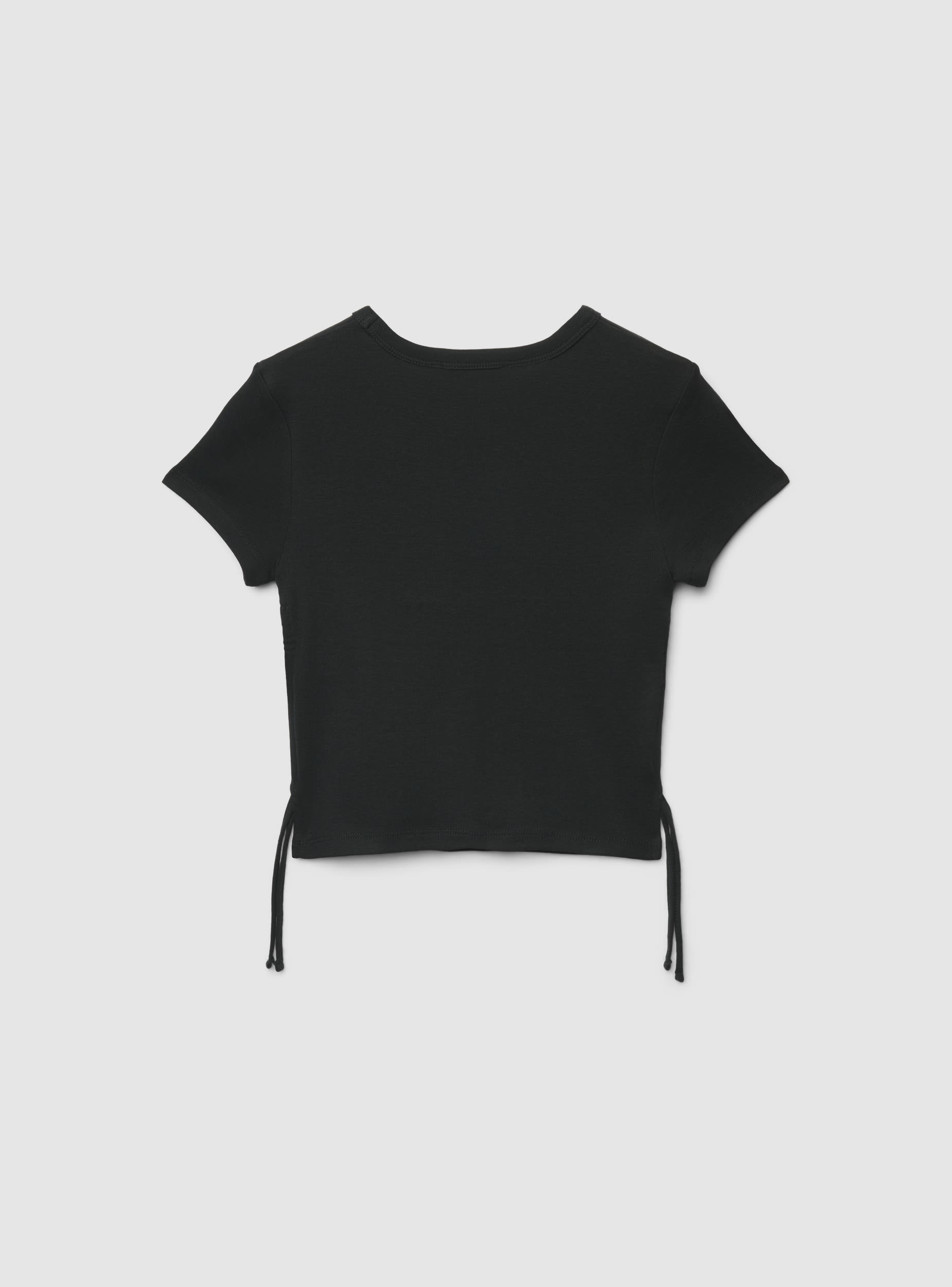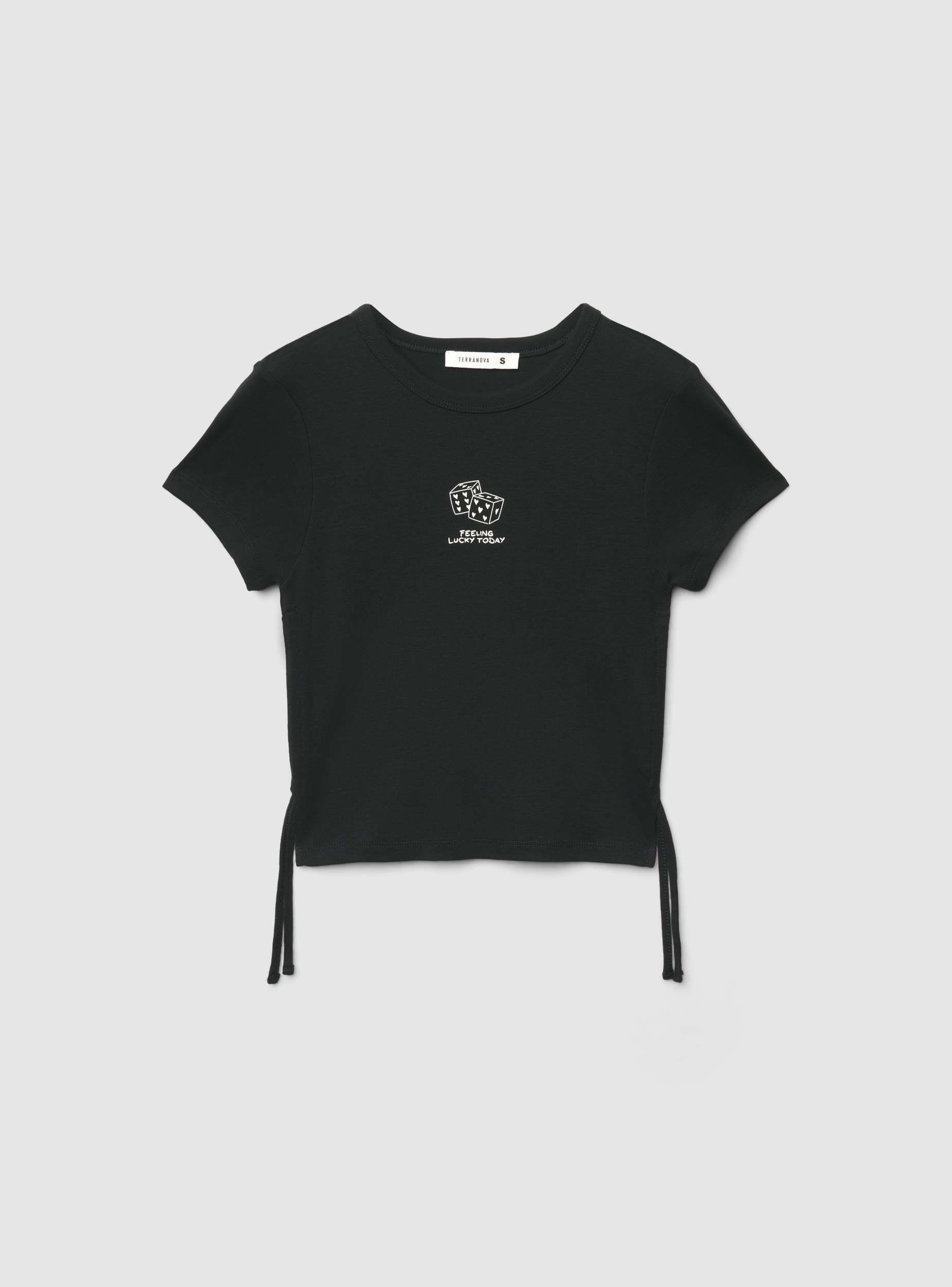 Maglietta da donna con vestibilità crop e stampa frontale. Girocollo e maniche corte. Presenta pratiche coulisse sui fianchi. Perfetta con jeans a vita alta o gonne e per look casual di tutti i giorni.Dettagli