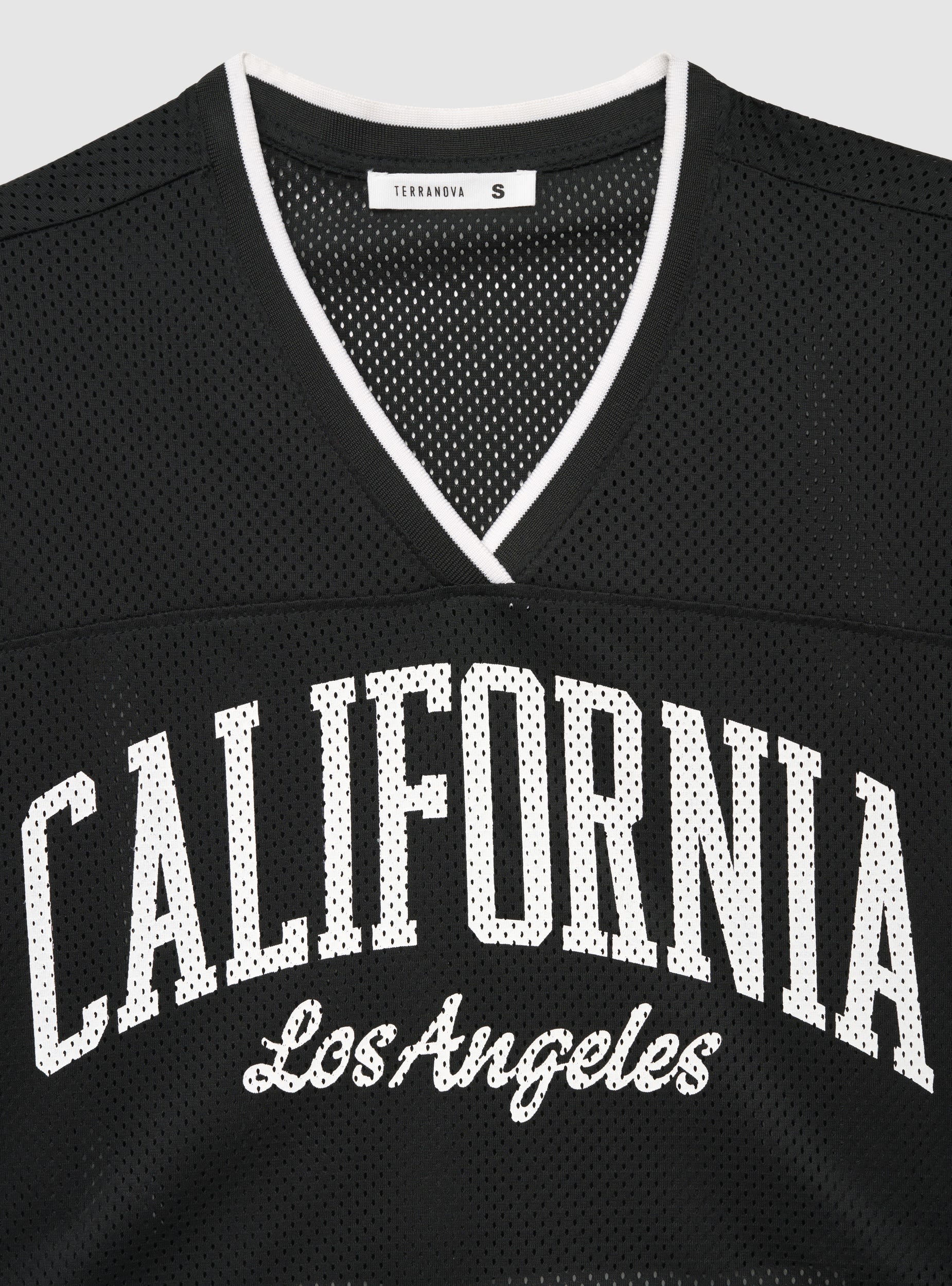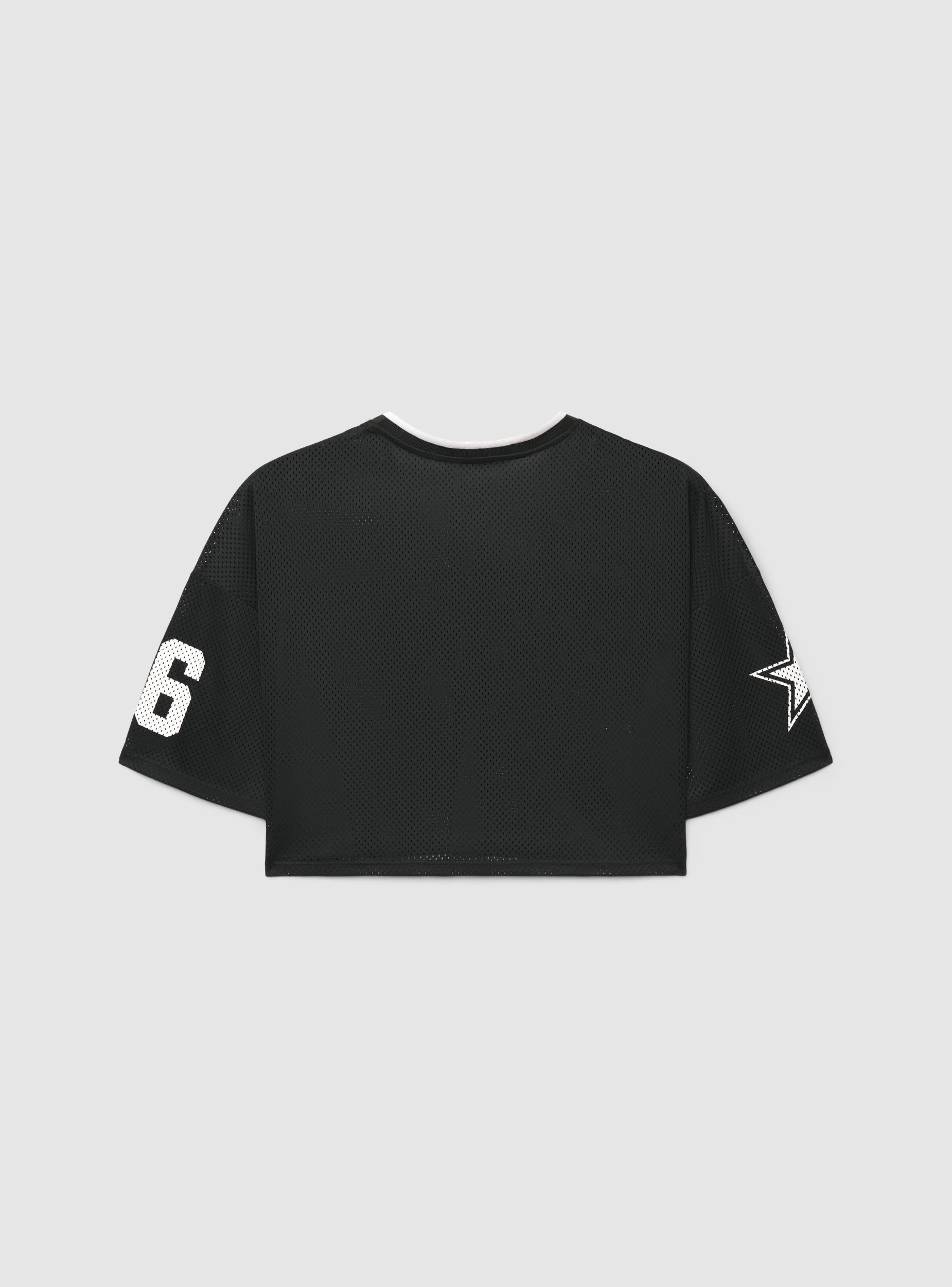 Maglietta da donna in stile jersey, con vestibilità crop e scollo a V rifinito a contrasto. Il design a rete dona un tocco sportivo e leggero, mentre la stampa con scritta sul davanti e i dettagli con numero e stella sulle maniche aggiungono carattere. Ideale con jeans a vita alta o pantaloni tuta per look street e tempo libero.Dettagli