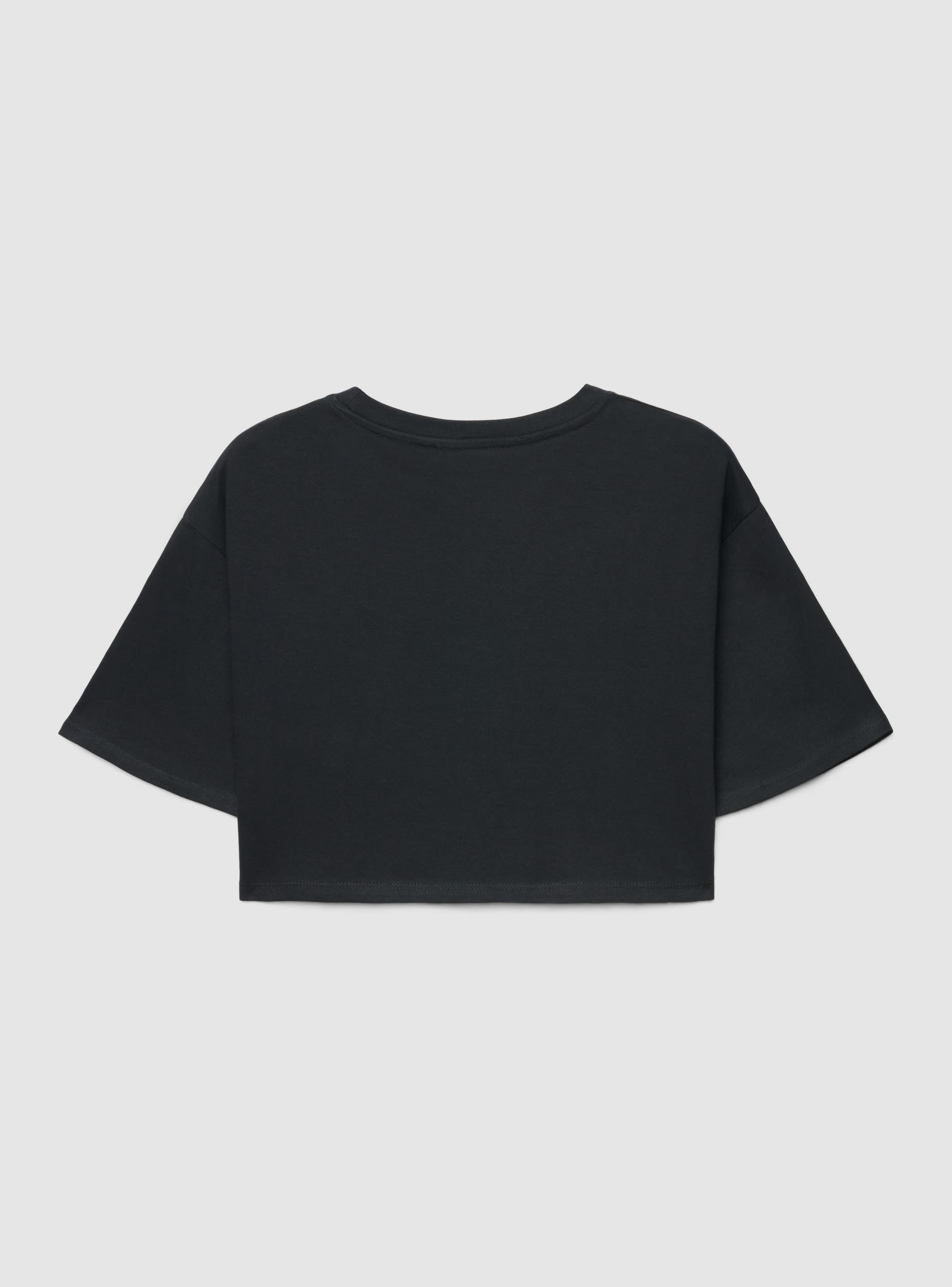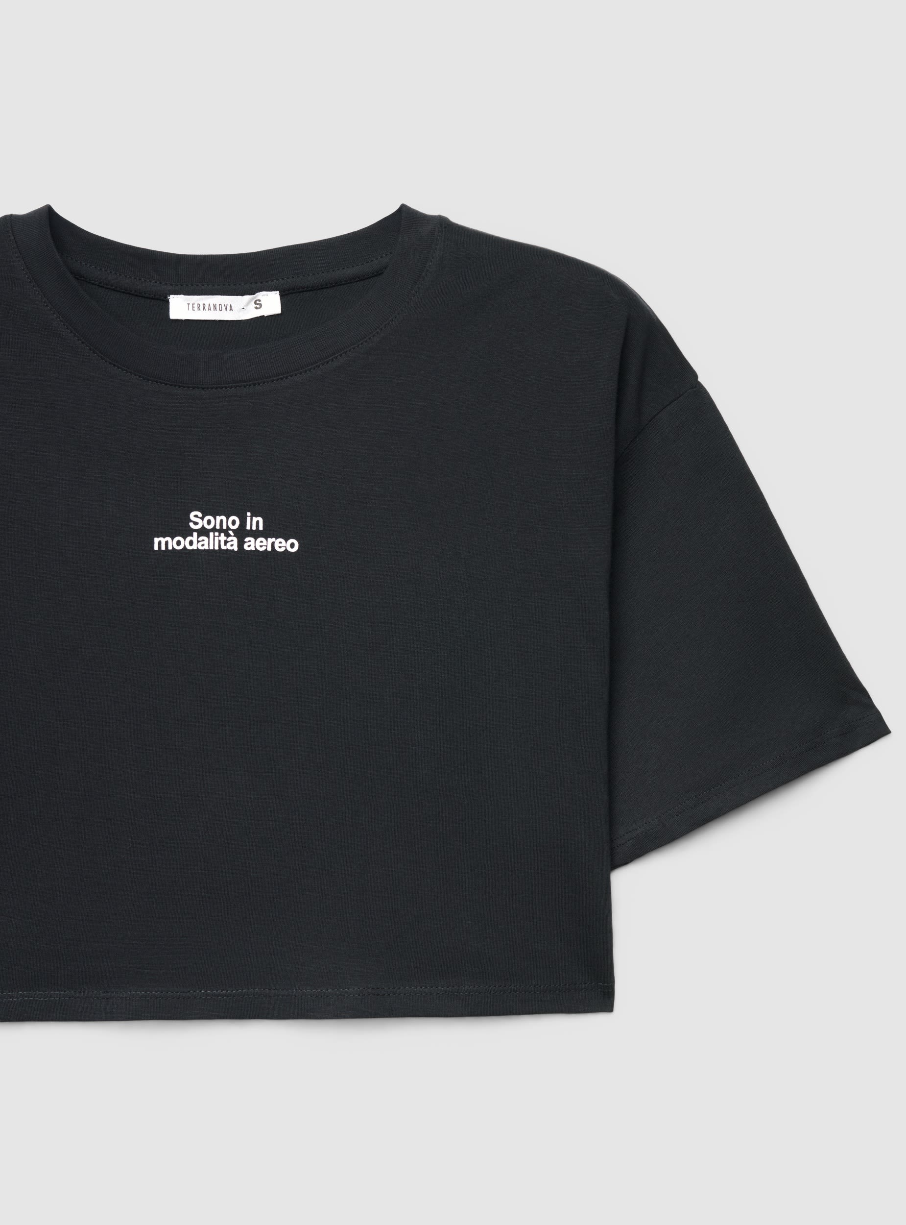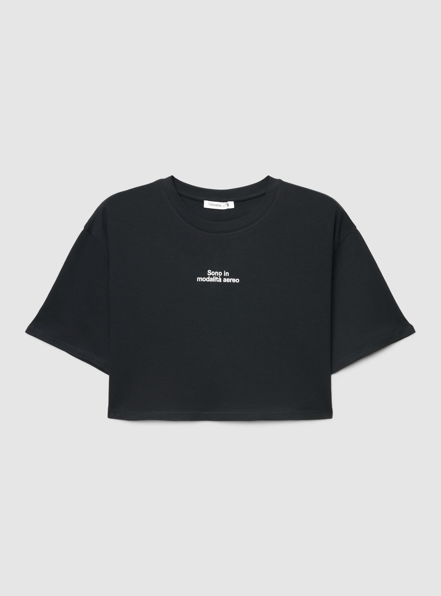 Maglietta da donna a tinta unita con scritta sul davanti. Modello crop con vestibilità ampia, maniche corte e girocollo, ideale per look casual e urban. Perfetta con jeans a vita alta, shorts o gonne, aggiunge un tocco ironico ai tuoi outfit quotidiani. Il taglio corto valorizza la silhouette e si abbina bene a layer leggeri come camicie aperte o giacche. Stampa frontale minimal per uno stile trendy.Dettagli