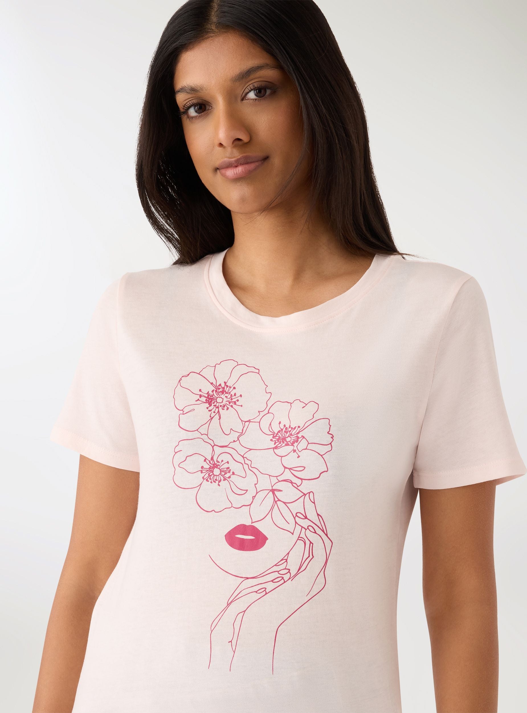 Maglietta da donna con stampa frontale di volto impreziosito da dettagli romantici in stile line art. Modello a maniche corte con scollo rotondo e vestibilità regular, facile da abbinare a jeans, gonne o pantaloncini per look casual e trendy. Perfetta per il tempo libero e le uscite di tutti i giorni, aggiunge un tocco romantico al tuo outfit.Dettagli