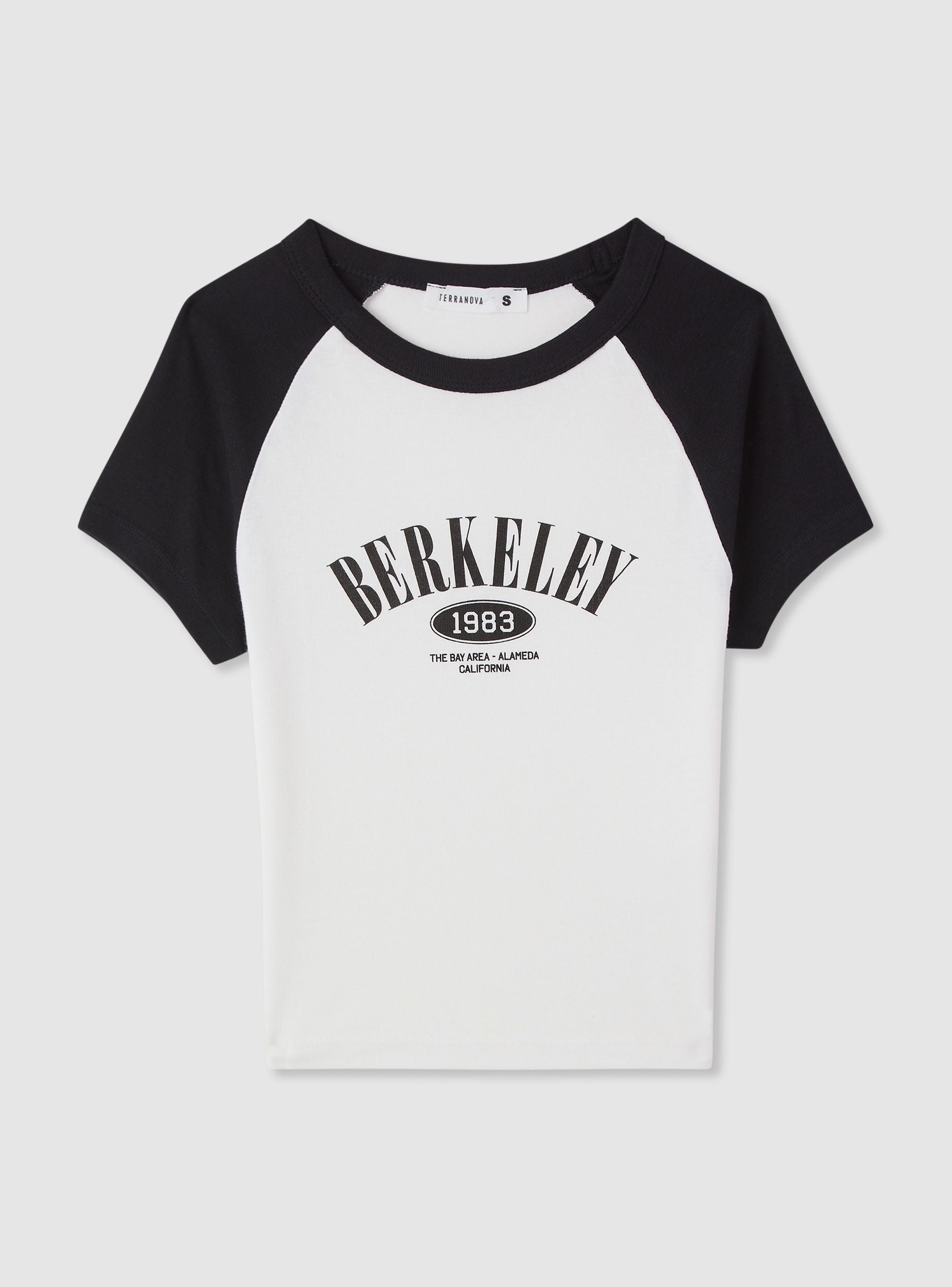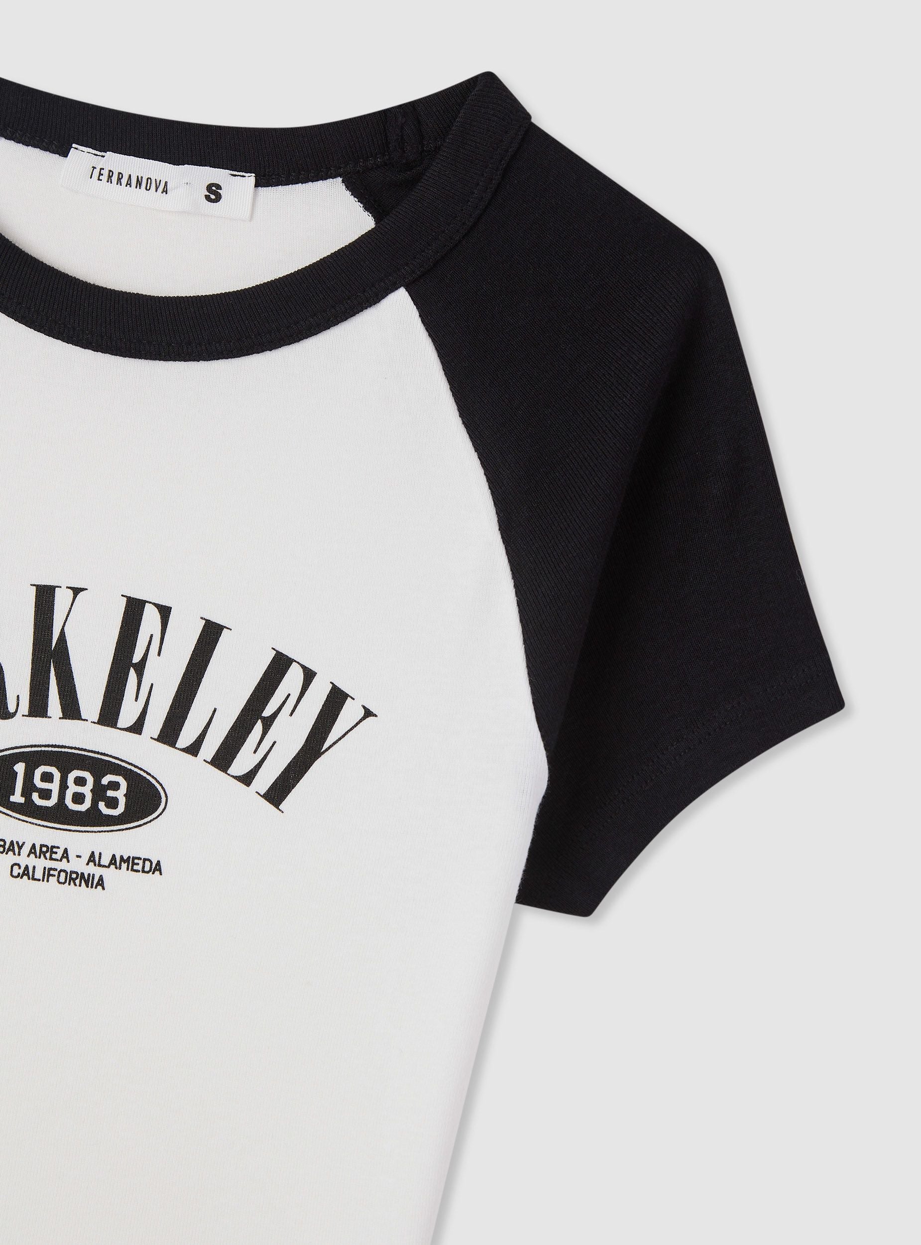 Maglietta da donna a maniche corte con vestibilità crop e stampa college sul davanti, tinta unita con maniche a contrasto. Girocollo e taglio raglan che valorizza spalle e linee. Ideale per look casual con jeans o pantaloncini e sneakers. Perfetta per il tempo libero e per creare outfit urbani dal carattere sportivo.Dettagli