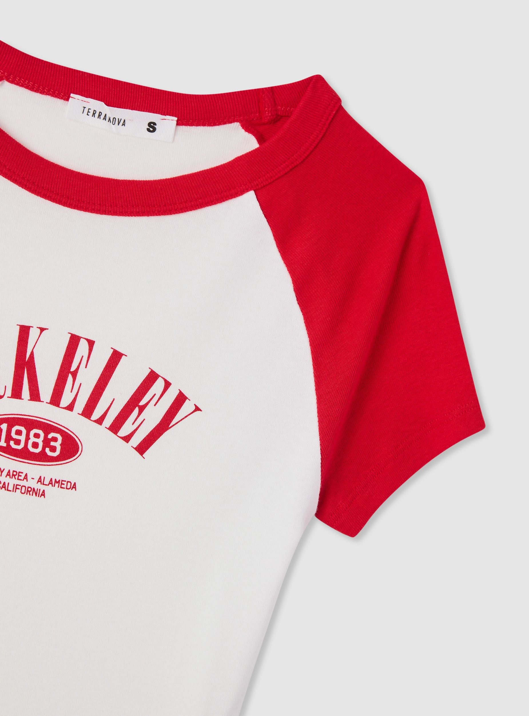 Maglietta da donna a maniche corte con vestibilità crop e stampa college sul davanti, tinta unita con maniche a contrasto. Girocollo e taglio raglan che valorizza spalle e linee. Ideale per look casual con jeans o pantaloncini e sneakers. Perfetta per il tempo libero e per creare outfit urbani dal carattere sportivo.Dettagli