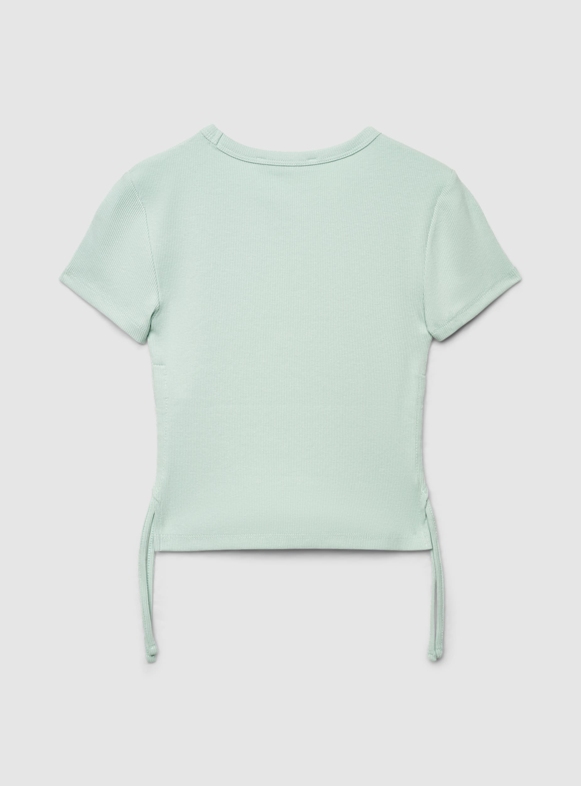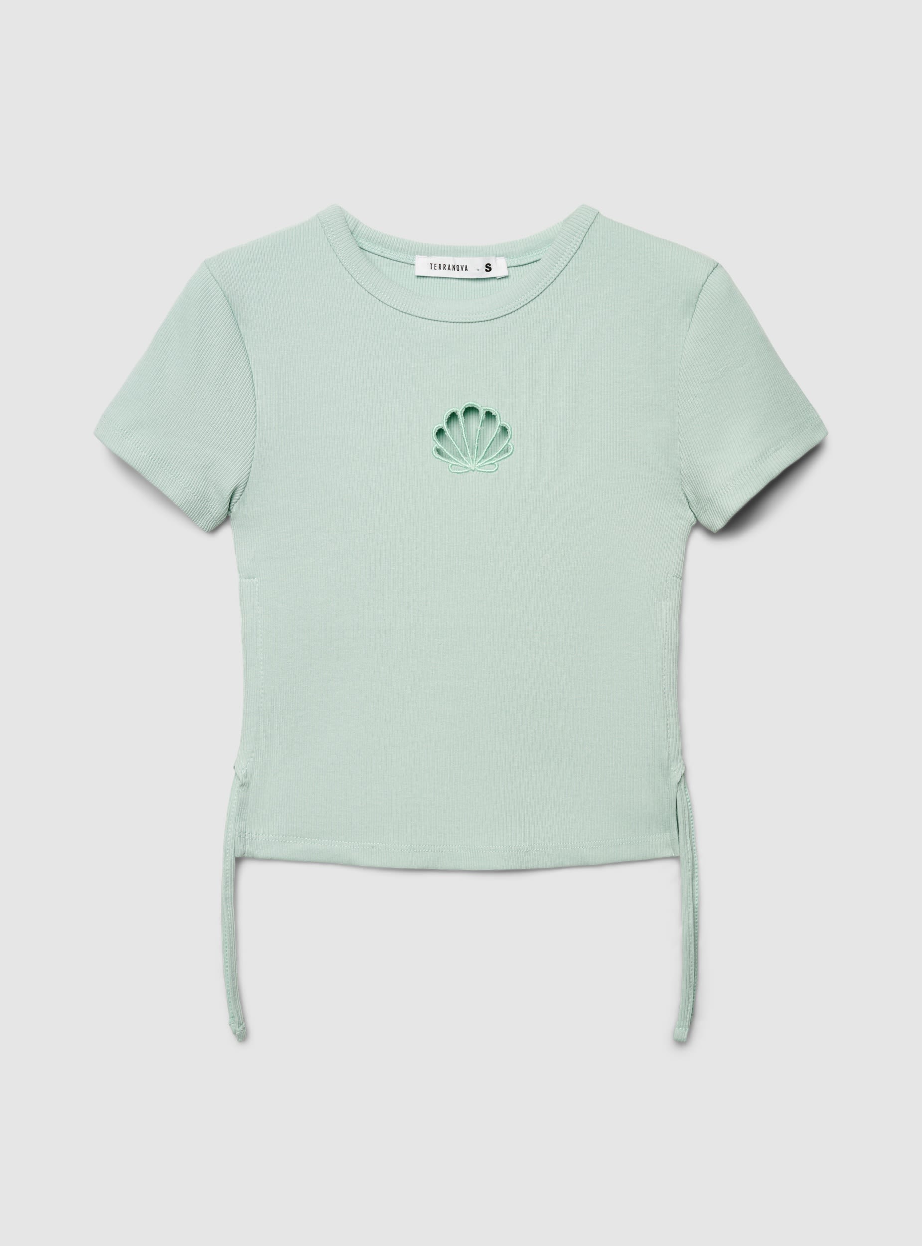 Maglietta da donna a tinta unita dal taglio crop, ideale per look estivi e abbinamenti con jeans o gonne a vita alta. Il modello presenta girocollo e maniche corte, linea aderente e dettagli cut-out ai fianchi con coulisse e lacci regolabili. Sul davanti spicca un piccolo ricamo a conchiglia che aggiunge un tocco distintivo.Dettagli