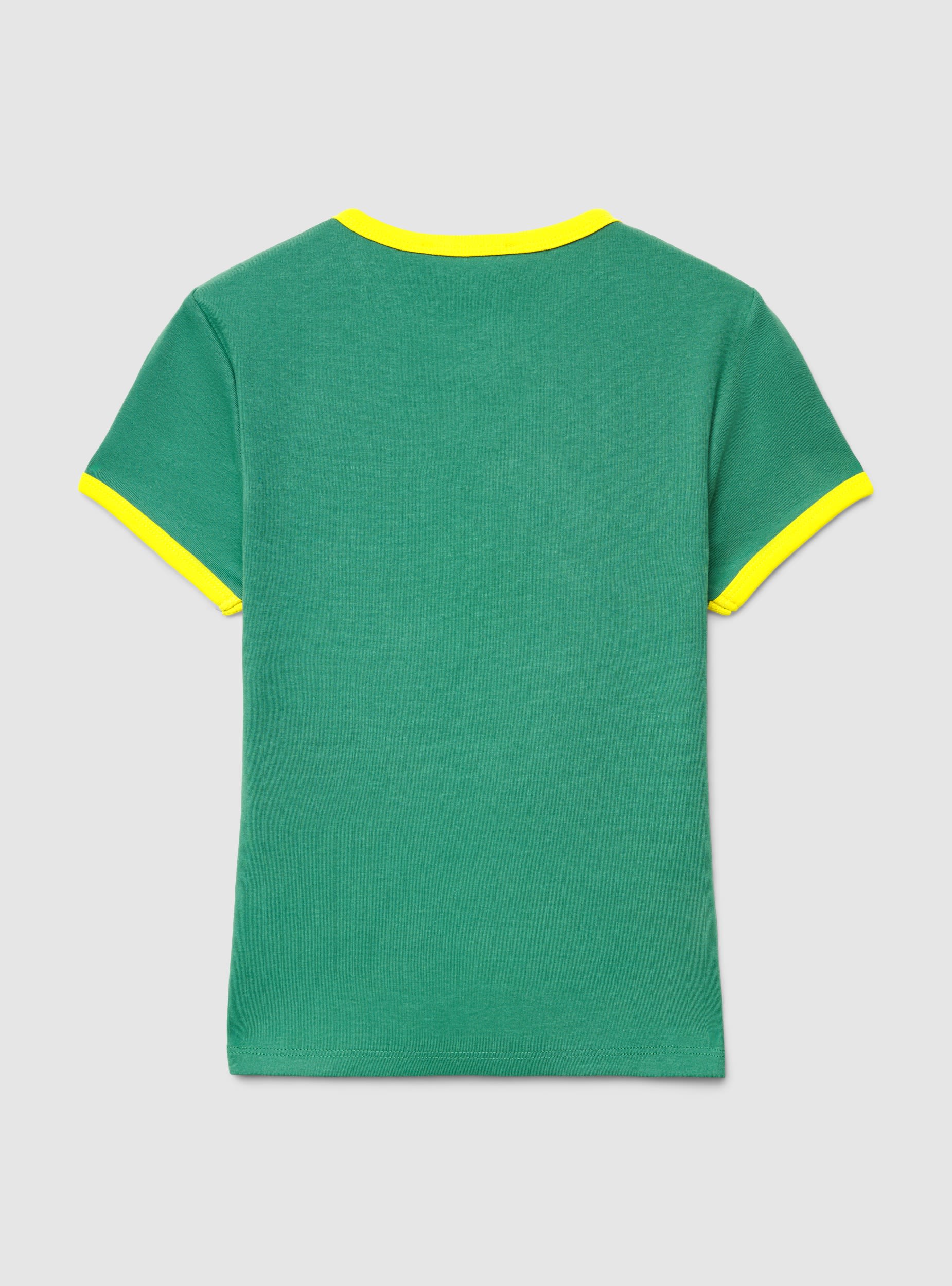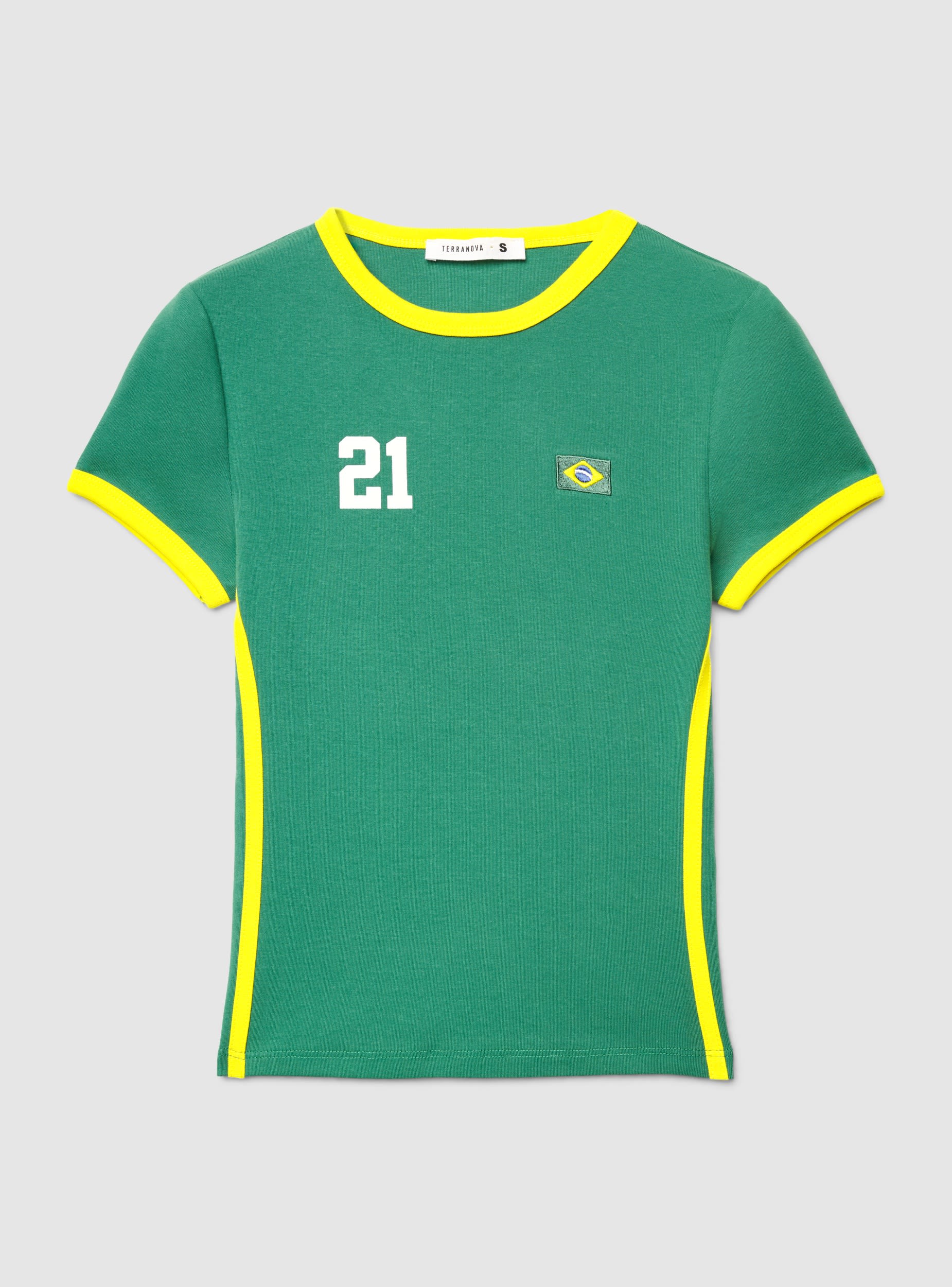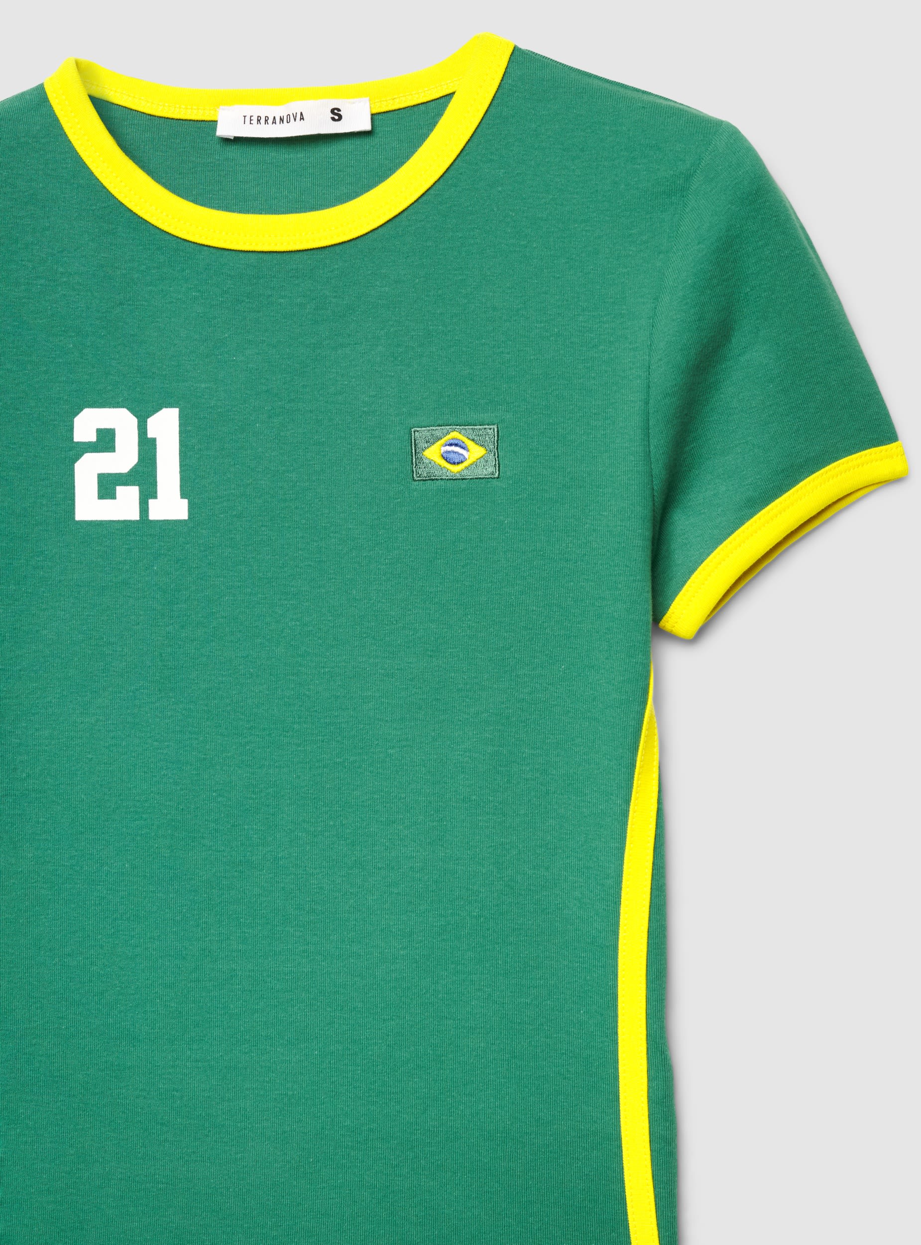 Maglietta da donna con vestibilità crop e fantasia con scritta, ispirata al calcio. Girocollo e maniche corte con bordi a contrasto, piccola bandiera ricamata sul petto e numero stampato. Perfetta per il tempo libero o per tifare, si abbina a jeans, shorts o una gonna sportiva.Dettagli