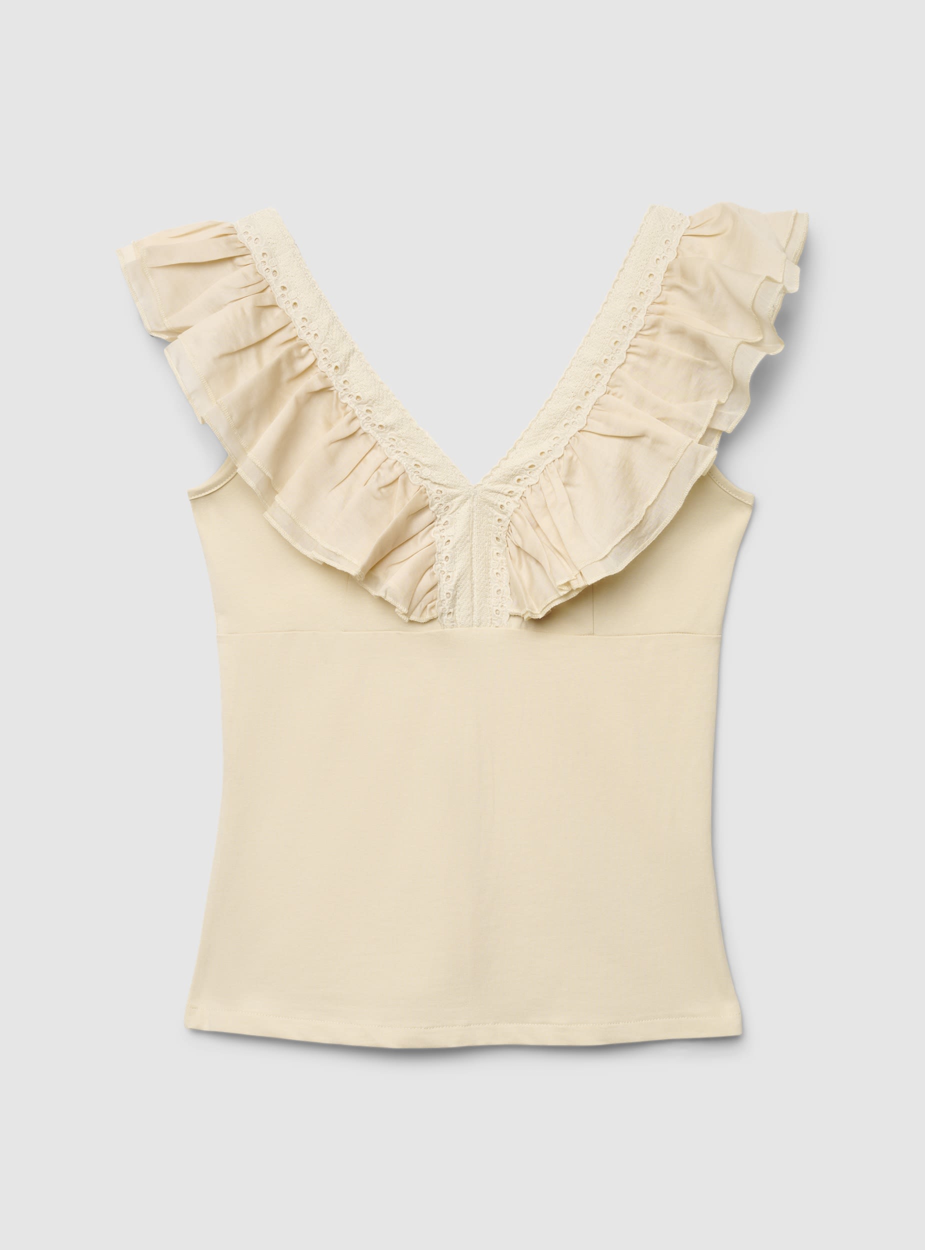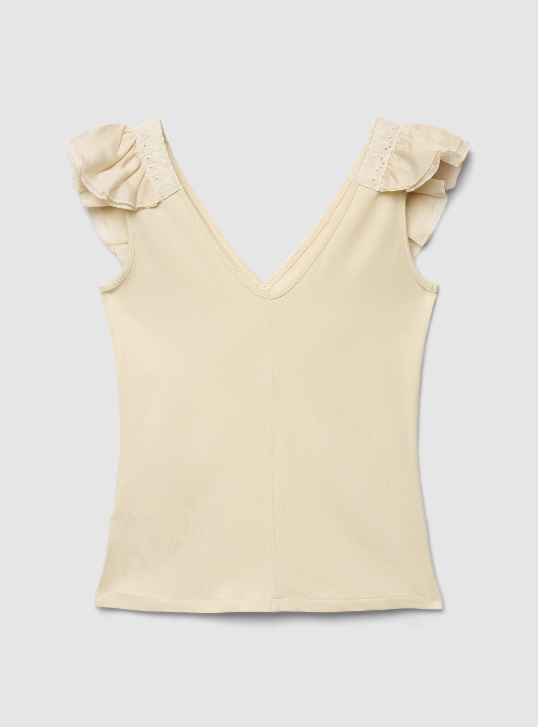 Top da donna a tinta unita con vestibilità aderente e scollo a V profondo valorizzato da ampi volant sul davanti con profilo ricamato. Modello senza maniche, ideale da indossare con jeans, pantaloni sartoriali o gonne per look casual e trendy. Perfetta per la bella stagione e per outfit da giorno o da sera con accessori minimal.Dettagli