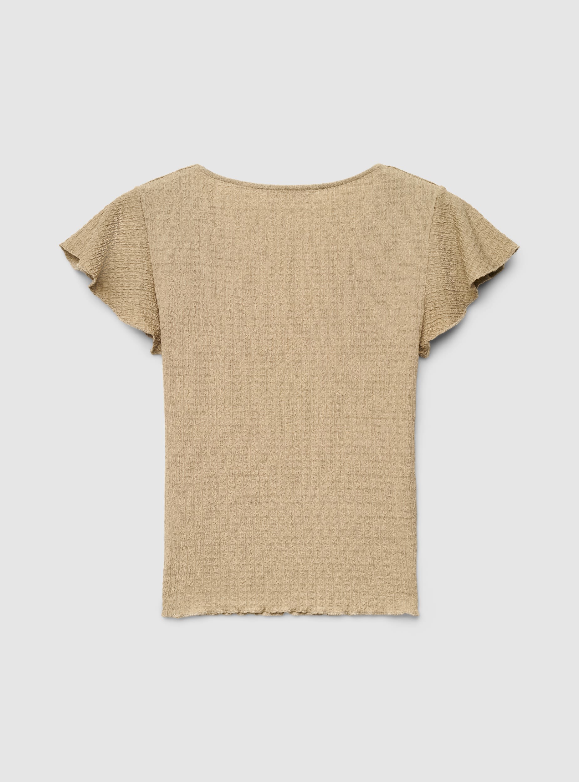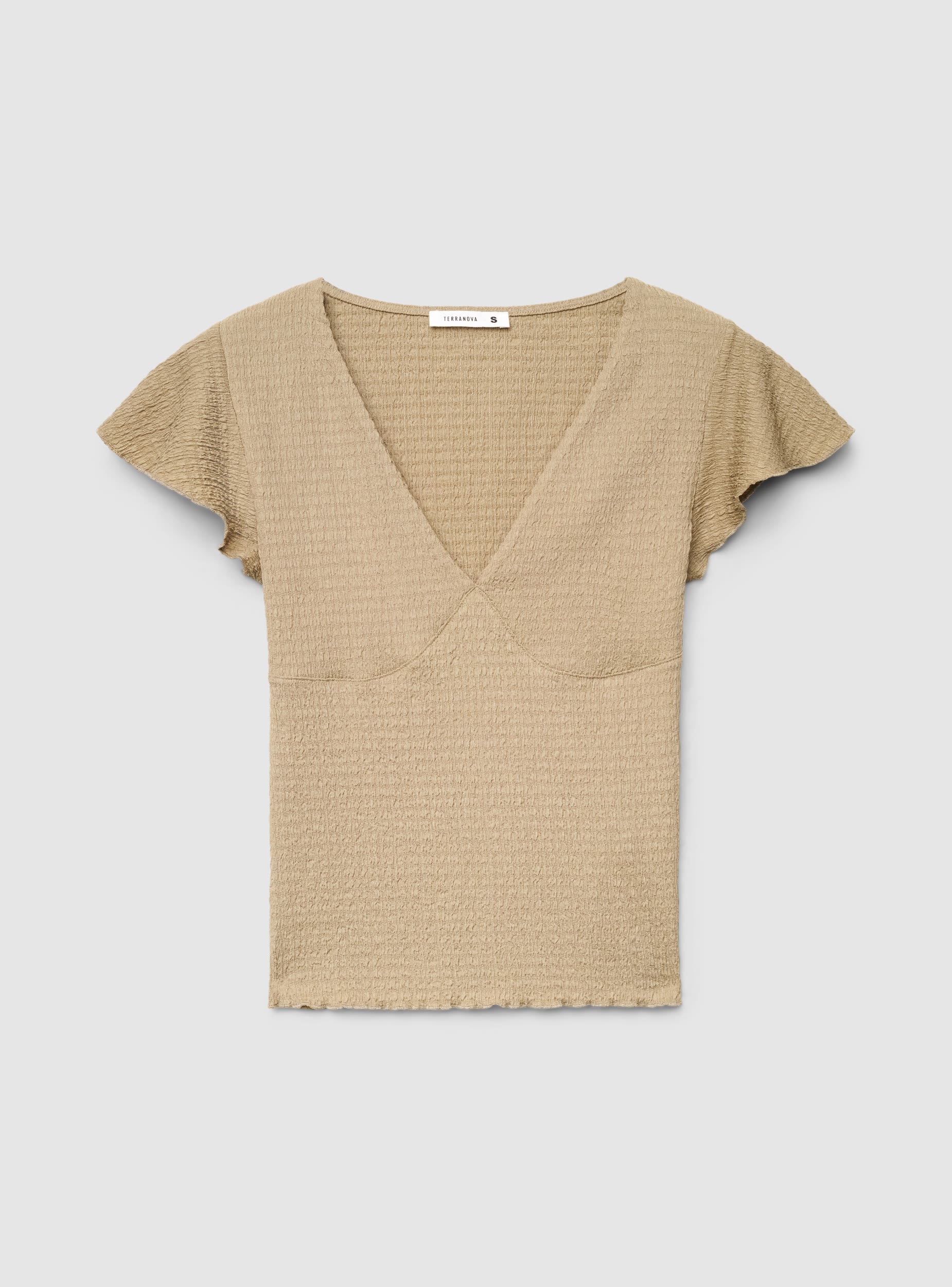 Maglietta da donna a tinta unita con scollo a V profondo e maniche corte a volant, pensata per valorizzare la linea con un taglio pulito. La lavorazione a micro rilievo dona carattere e comfort, ideale con jeans, gonne o pantaloni a vita alta. Vestibilità regolare, perfetta per look da giorno e serate informali.Dettagli