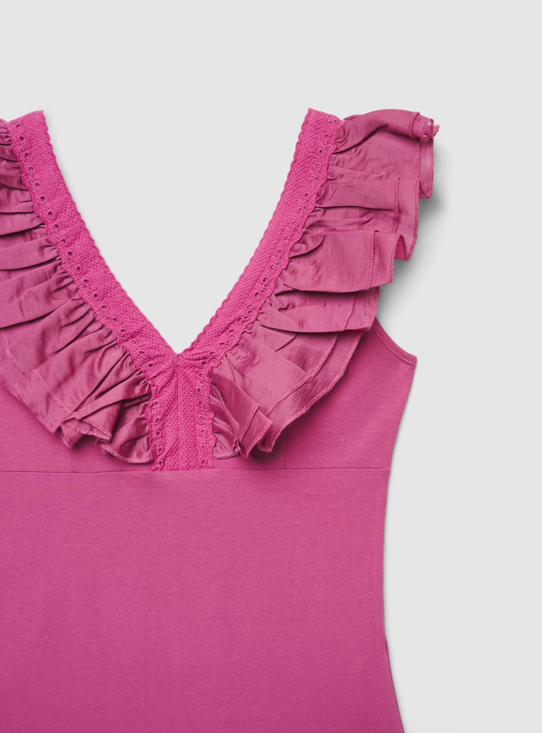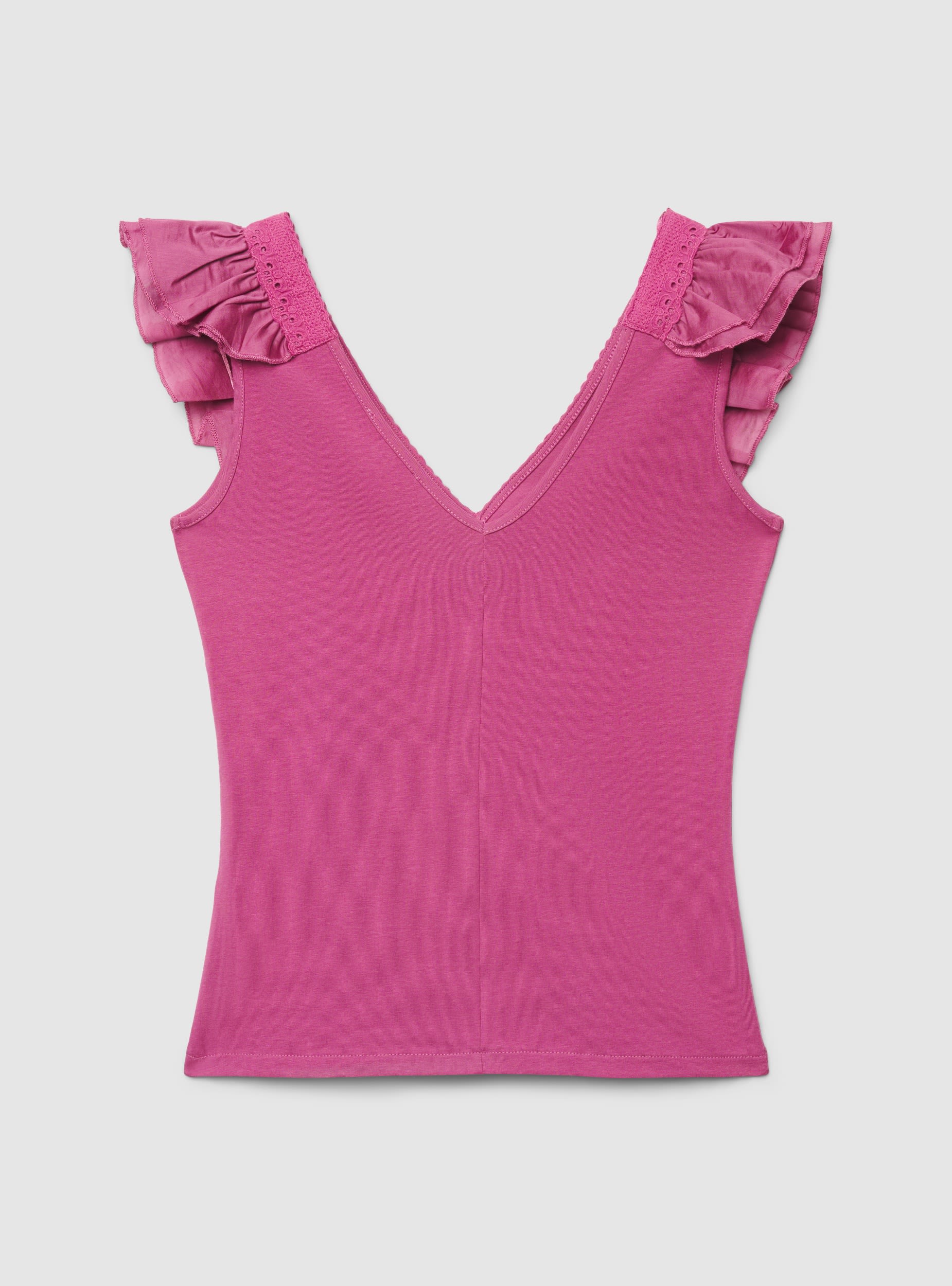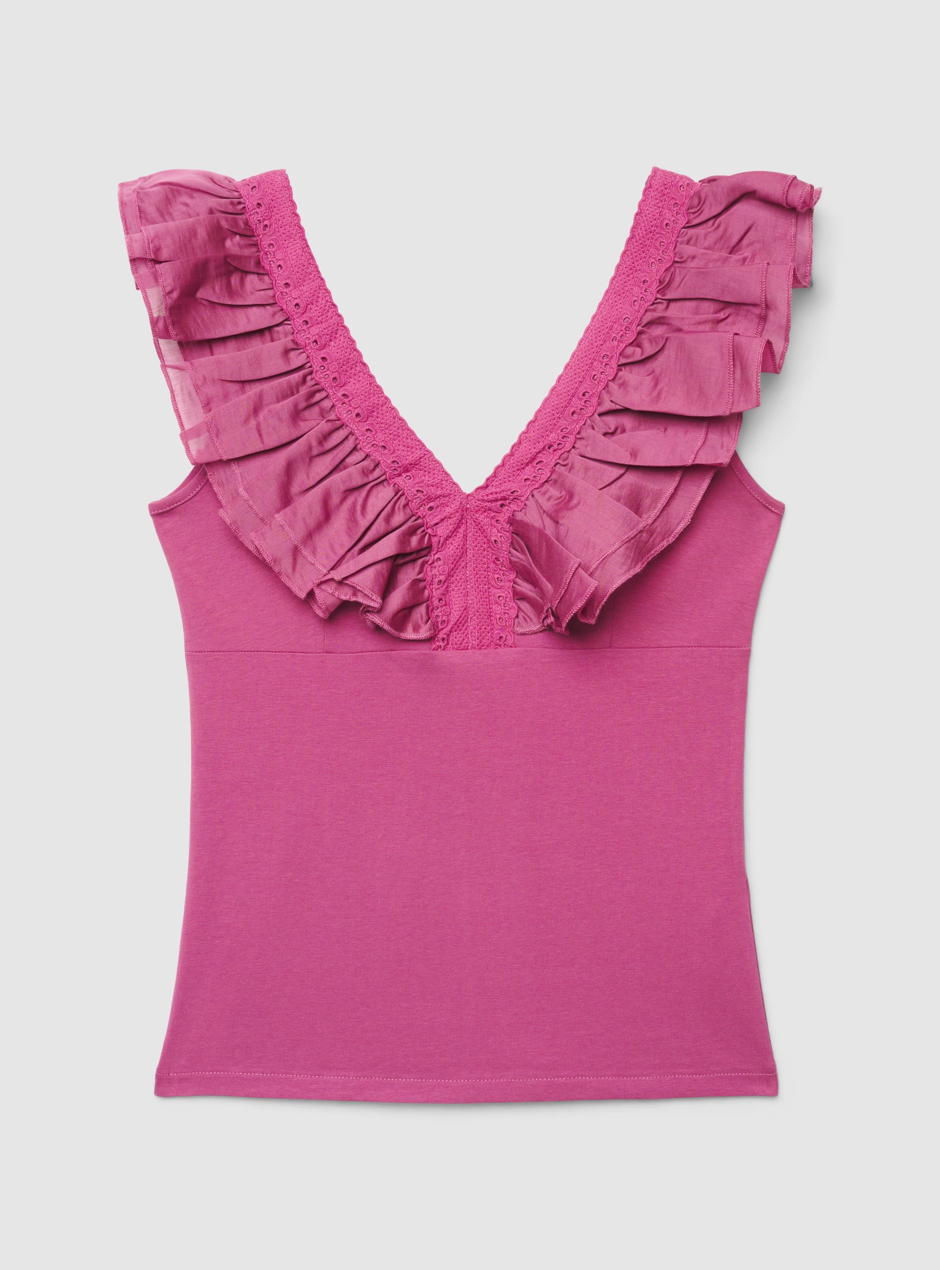 Top da donna a tinta unita con vestibilità aderente e scollo a V profondo valorizzato da ampi volant sul davanti con profilo ricamato. Modello senza maniche, ideale da indossare con jeans, pantaloni sartoriali o gonne per look casual e trendy. Perfetta per la bella stagione e per outfit da giorno o da sera con accessori minimal.Dettagli