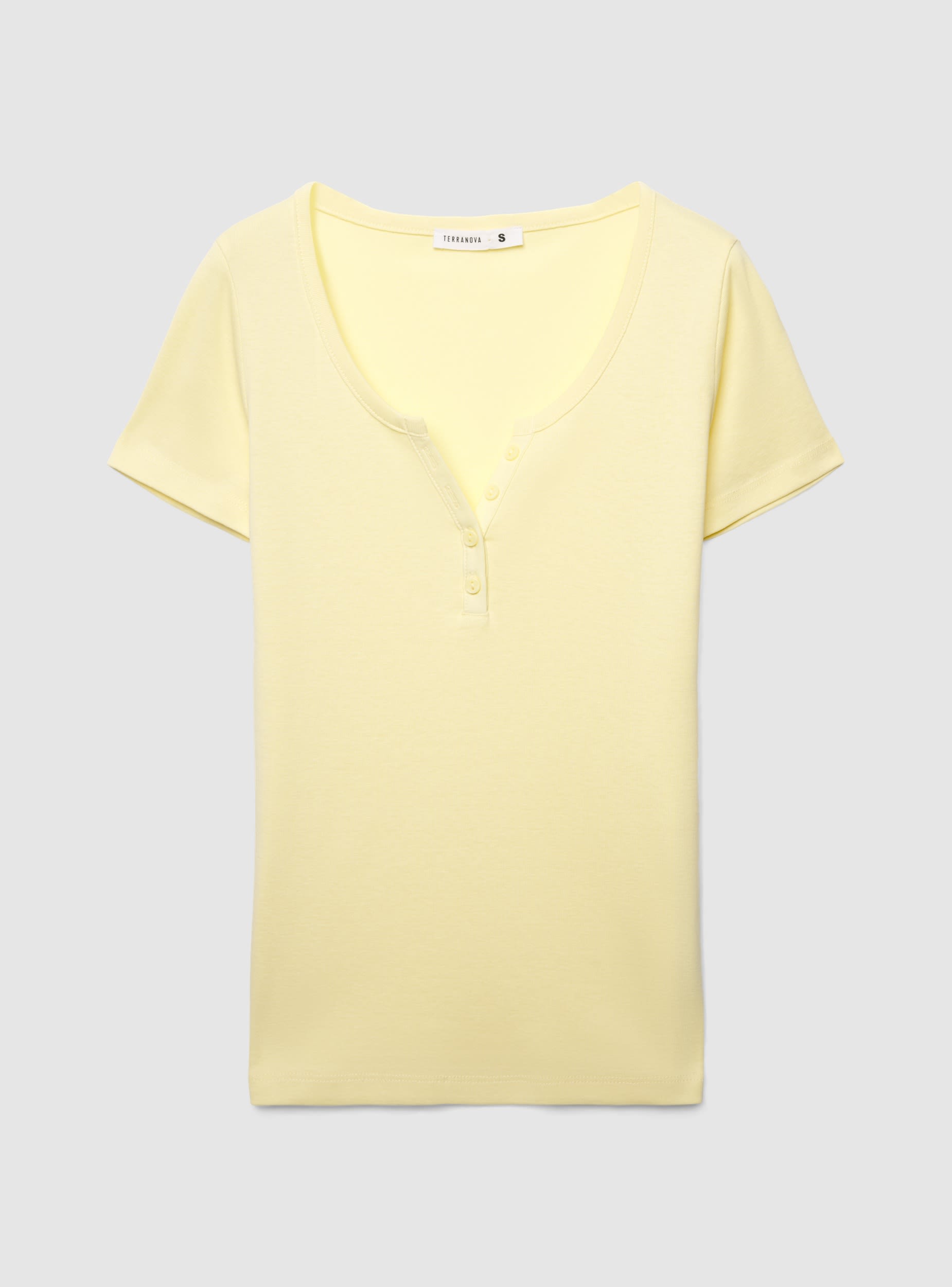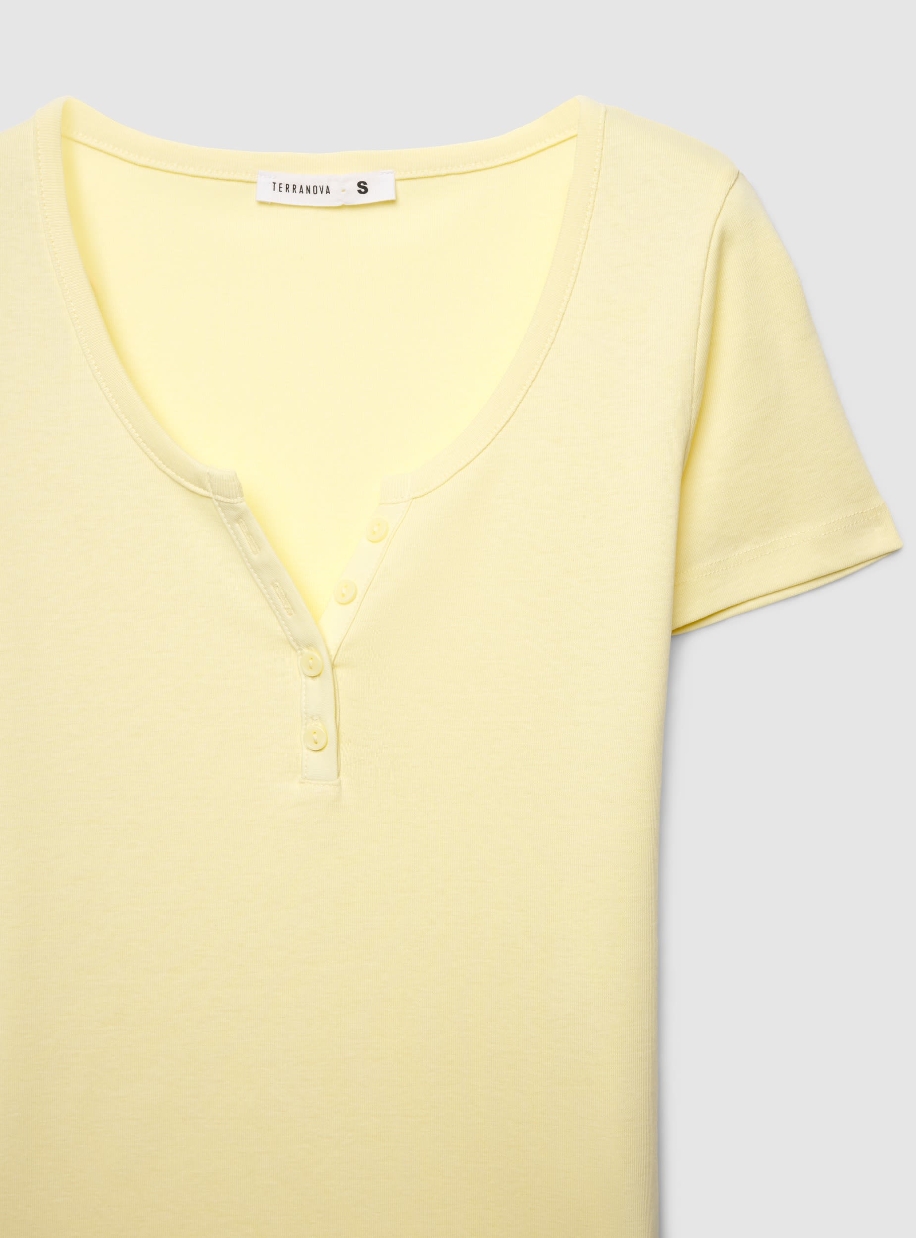Maglietta da donna a tinta unita con scollo serafino profondo e abbottonatura corta a quattro bottoni. Maniche corte e linea aderente che valorizza la figura, perfetta sotto giacche e cardigan o abbinata a jeans e gonne per il tempo libero. Versatile per l’ufficio informale o le uscite di tutti i giorni, si indossa con facilità grazie al design essenziale e femminile.Dettagli