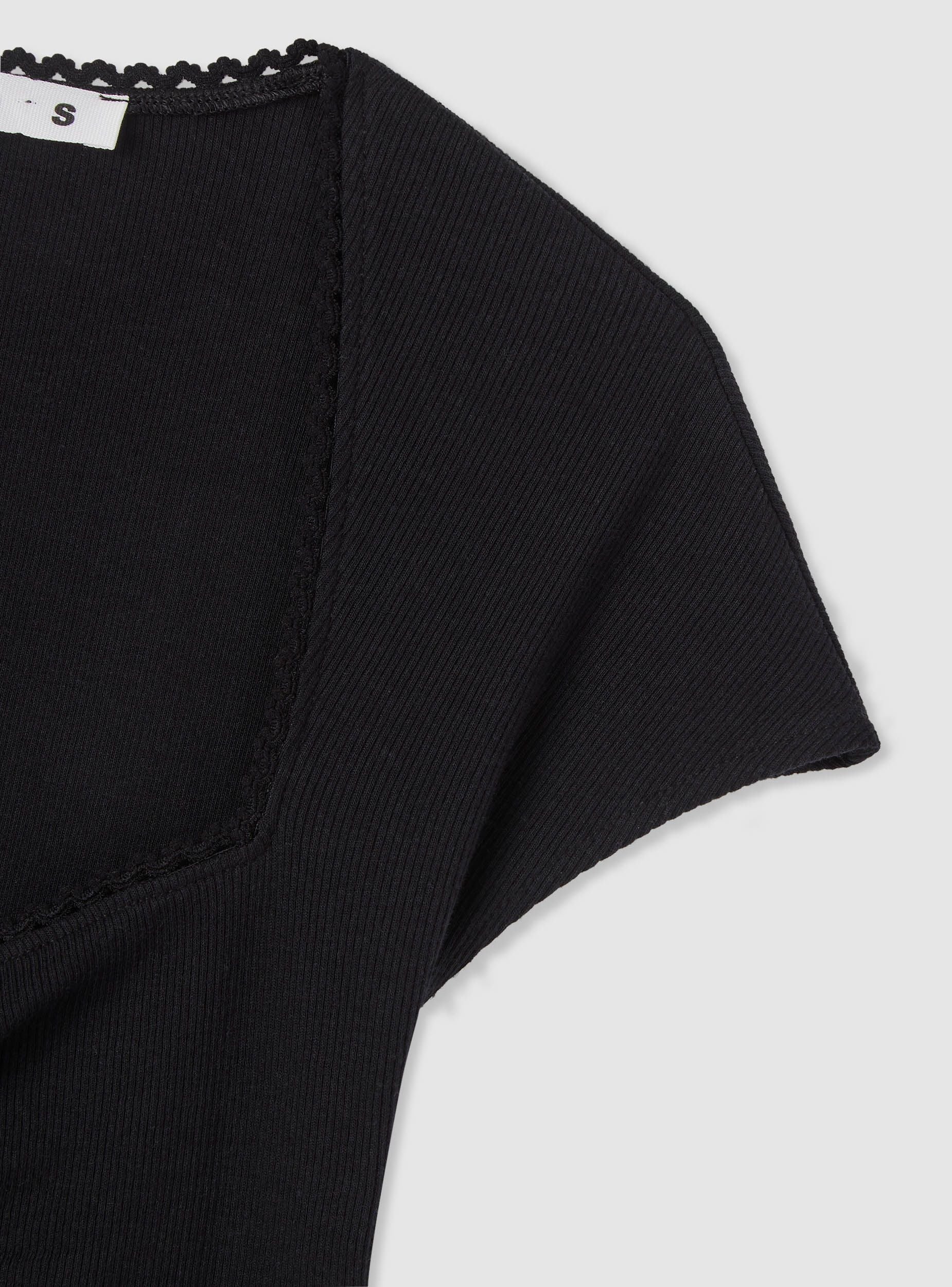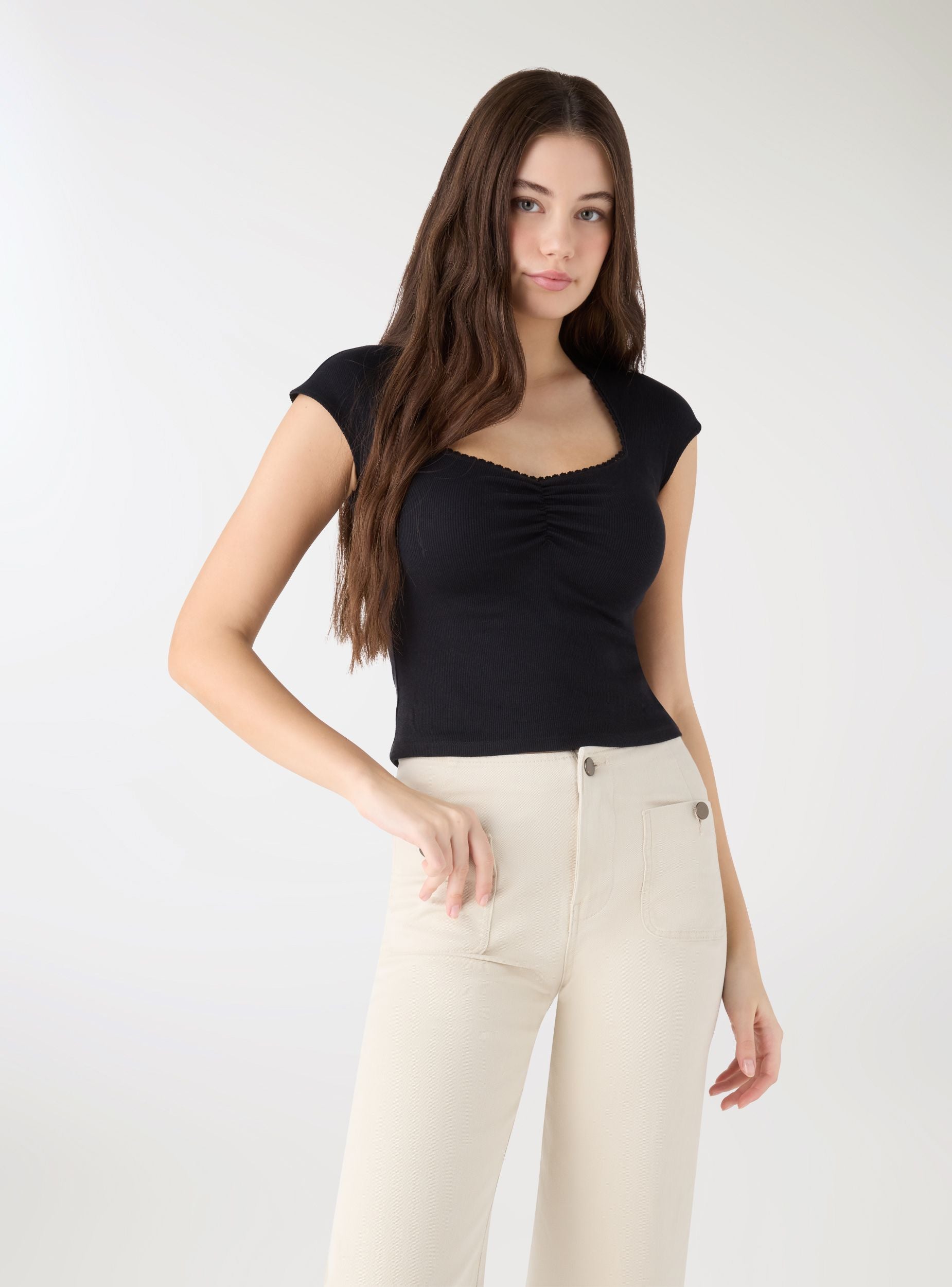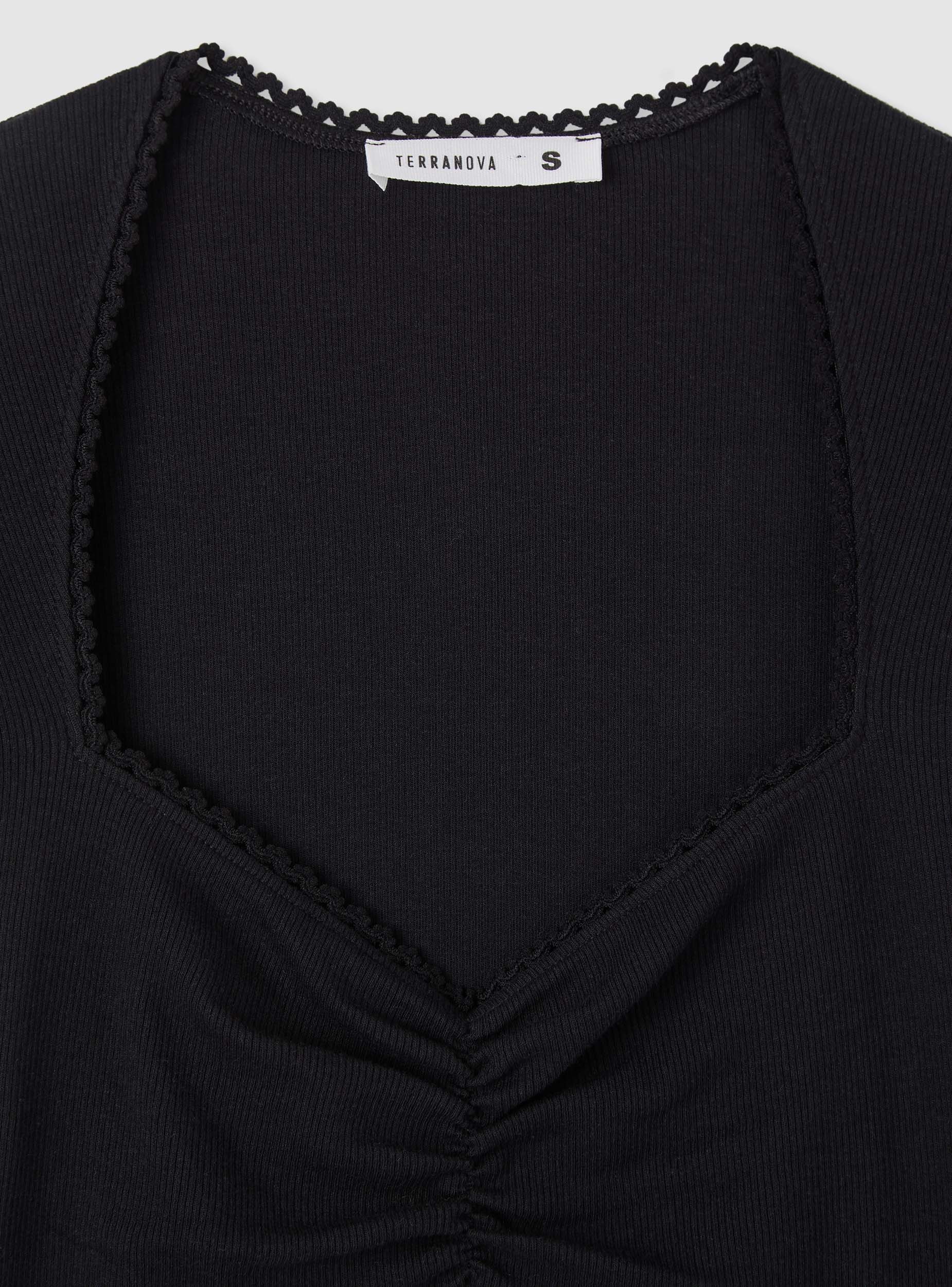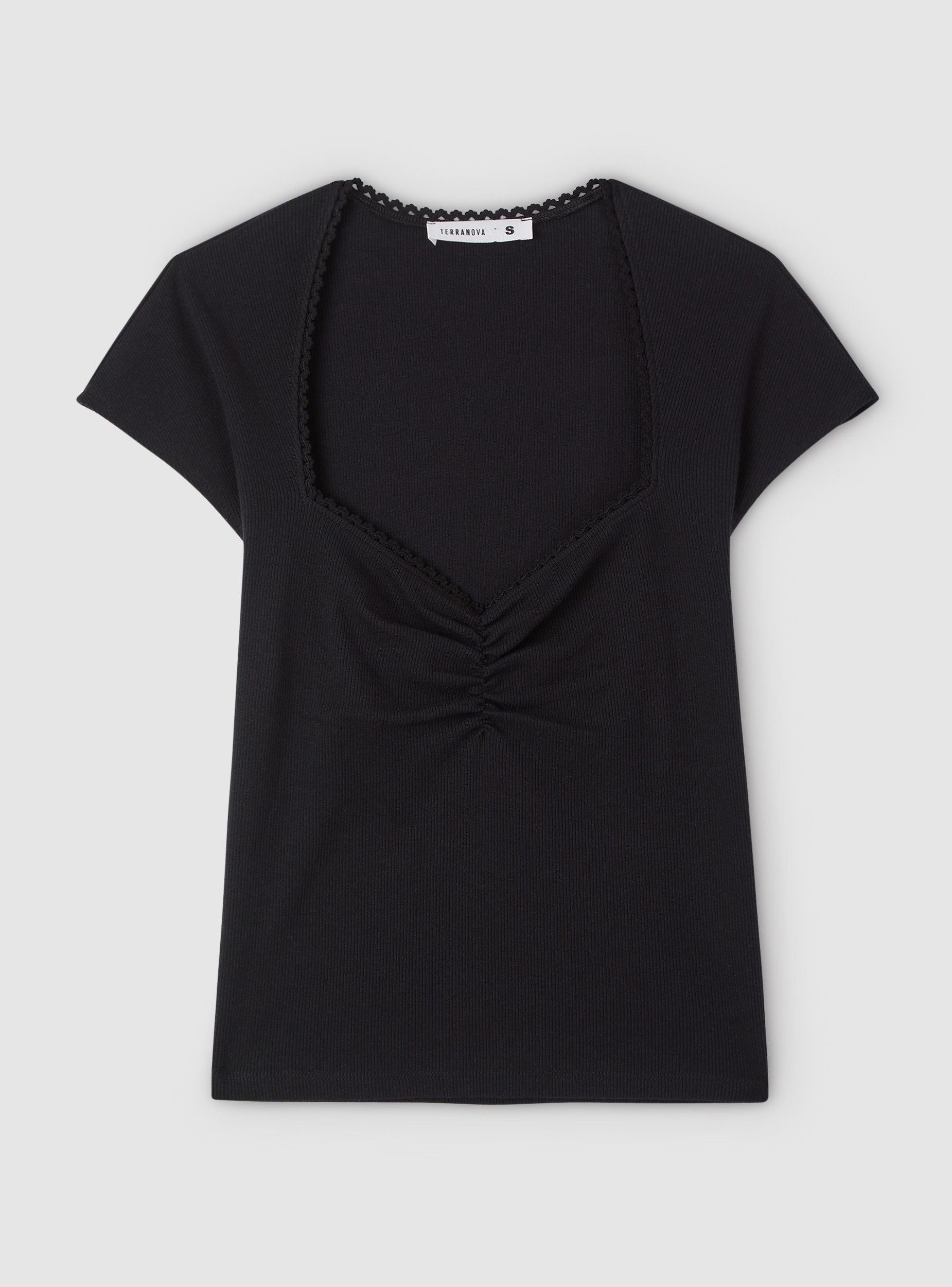 Maglietta da donna crop con scollo a cuore definito da bordino decorato e maniche corte. Il davanti presenta un’arricciatura centrale che valorizza la silhouette. Perfetta per il tempo libero e per look trendy con jeans o gonne a vita alta. Vestibilità aderente ed elasticizzata. Design a tinta unita che si abbina a strati come cardigan o giacche leggere.Dettagli