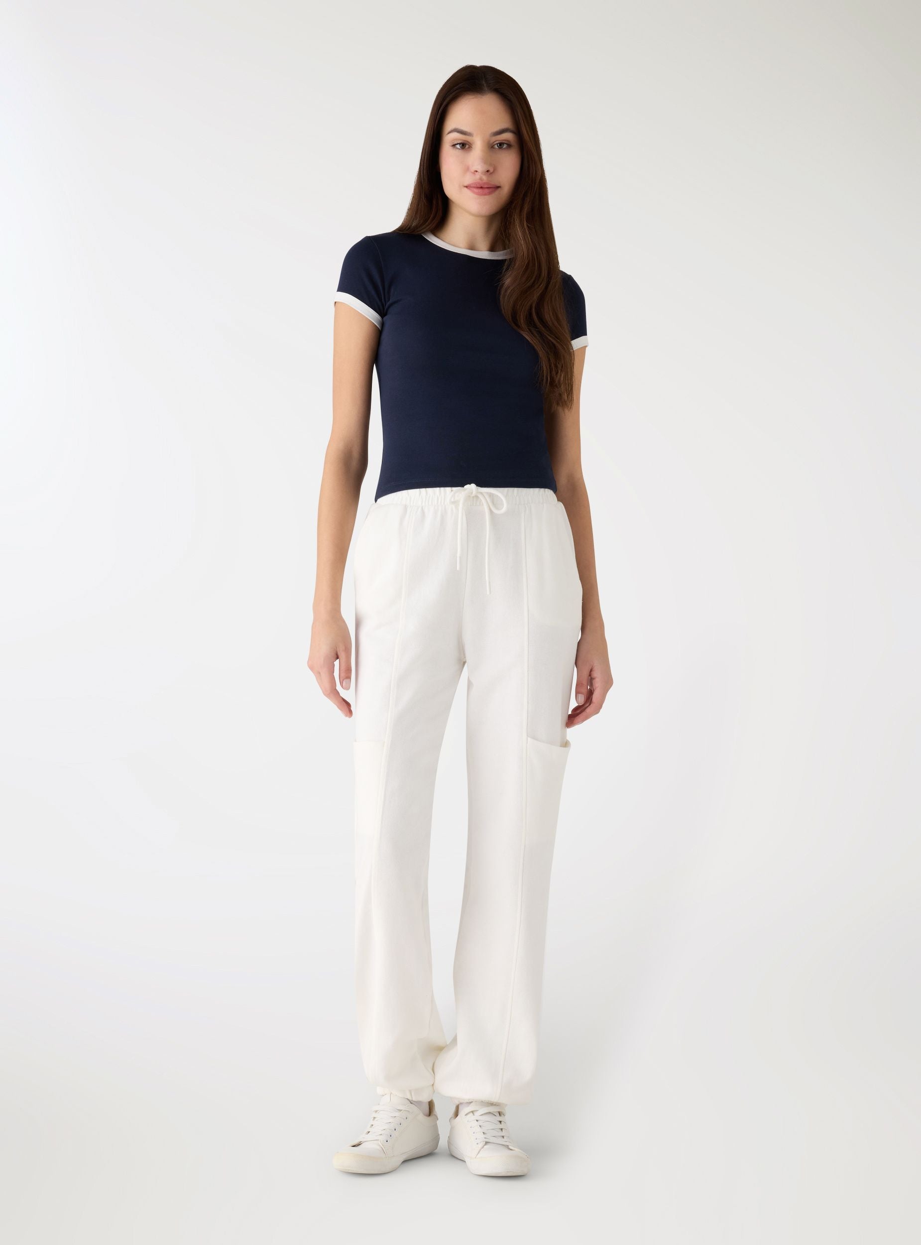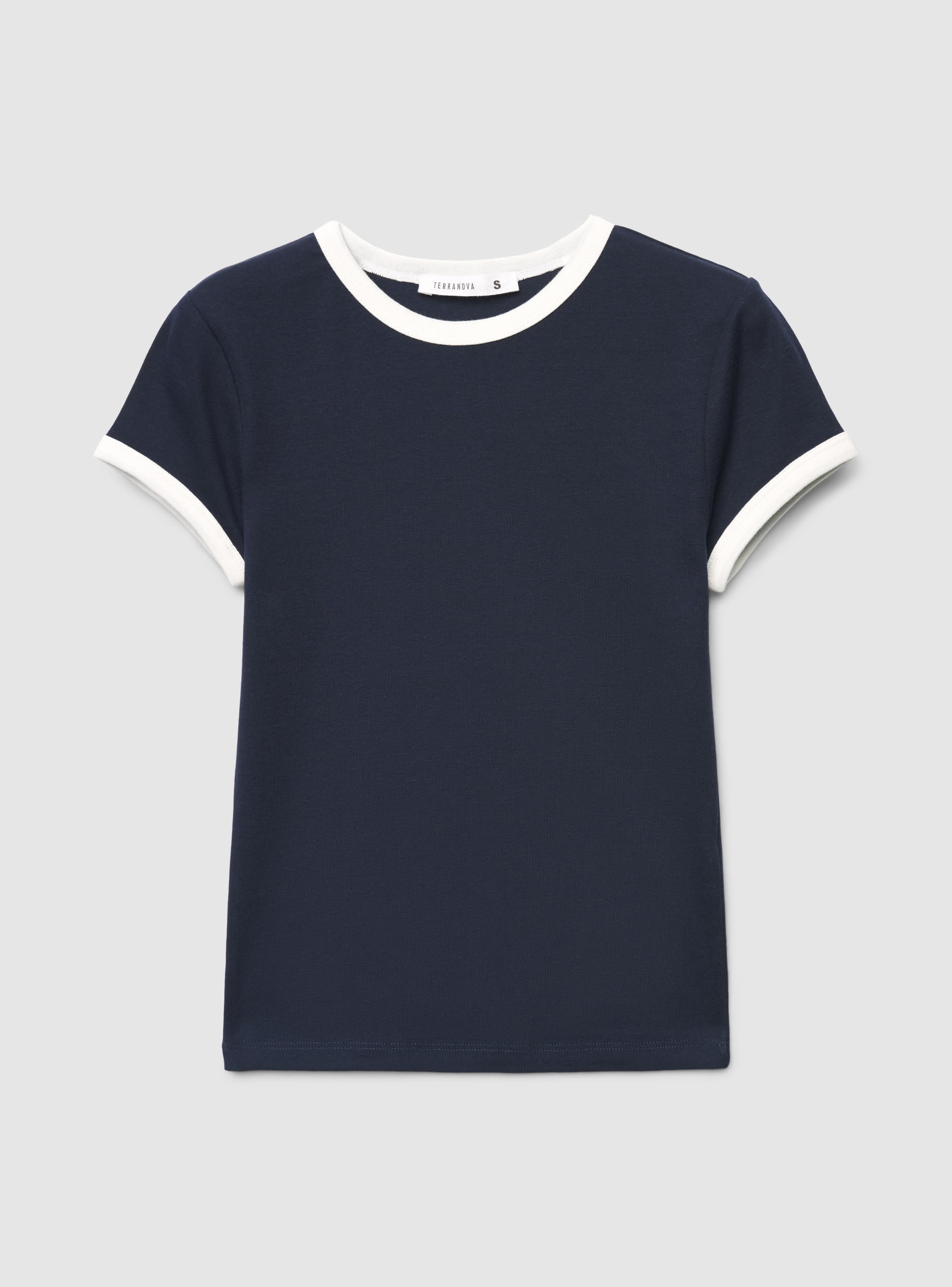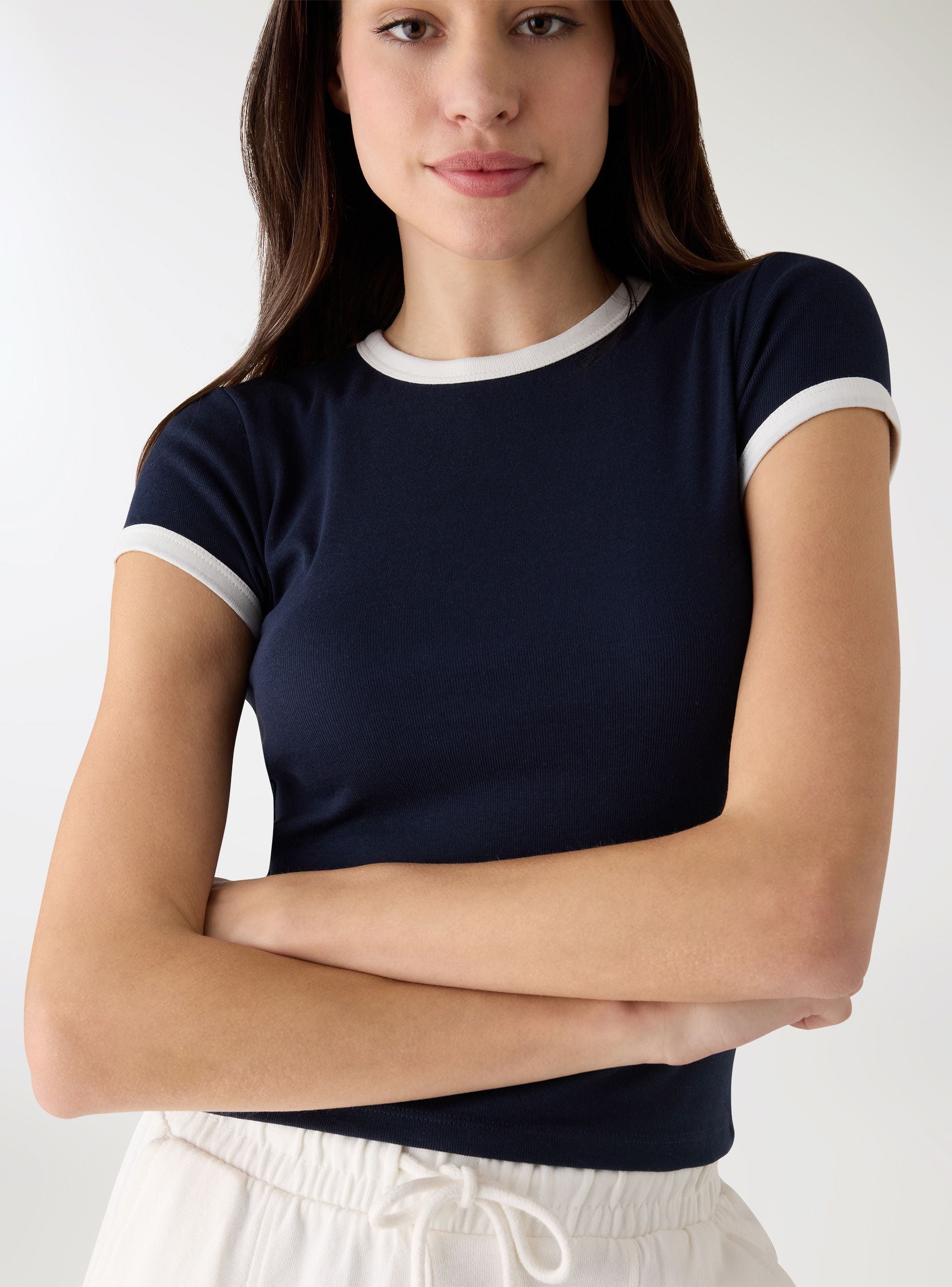 Maglietta da donna a tinta unita con bordi a contrasto su collo e maniche. Taglio crop e vestibilità aderente, girocollo e maniche corte, ideale per look casual e urban. Perfetta con jeans a vita alta o gonne midi per creare outfit versatili.Dettagli