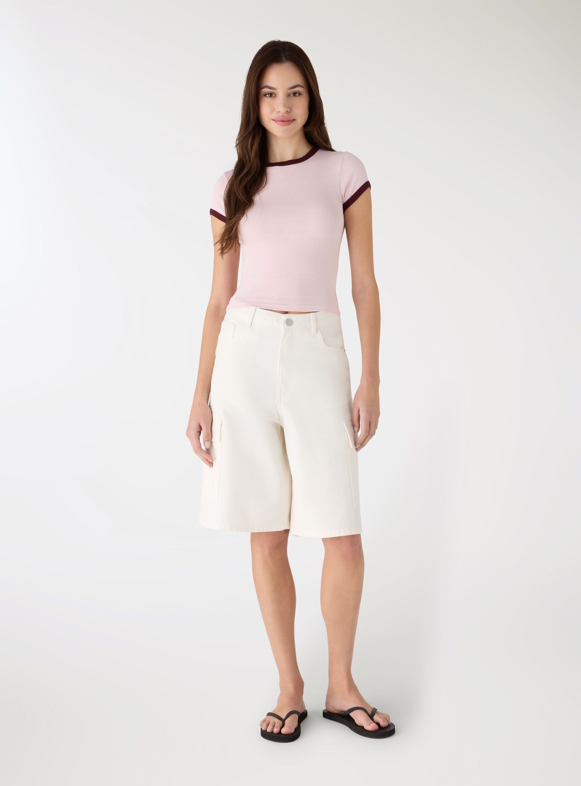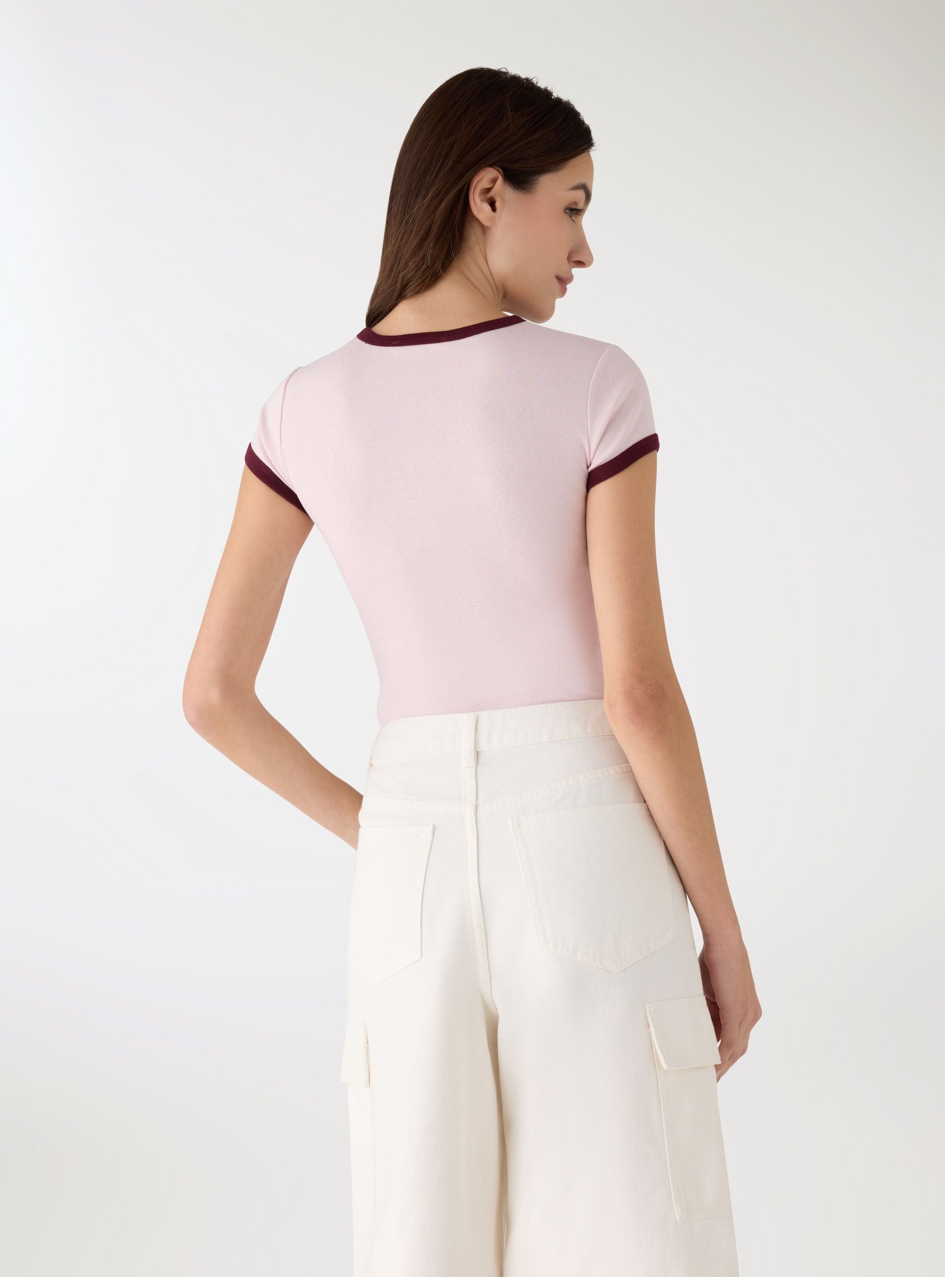Maglietta da donna a tinta unita con bordi a contrasto su collo e maniche. Taglio crop e vestibilità aderente, girocollo e maniche corte, ideale per look casual e urban. Perfetta con jeans a vita alta o gonne midi per creare outfit versatili.Dettagli